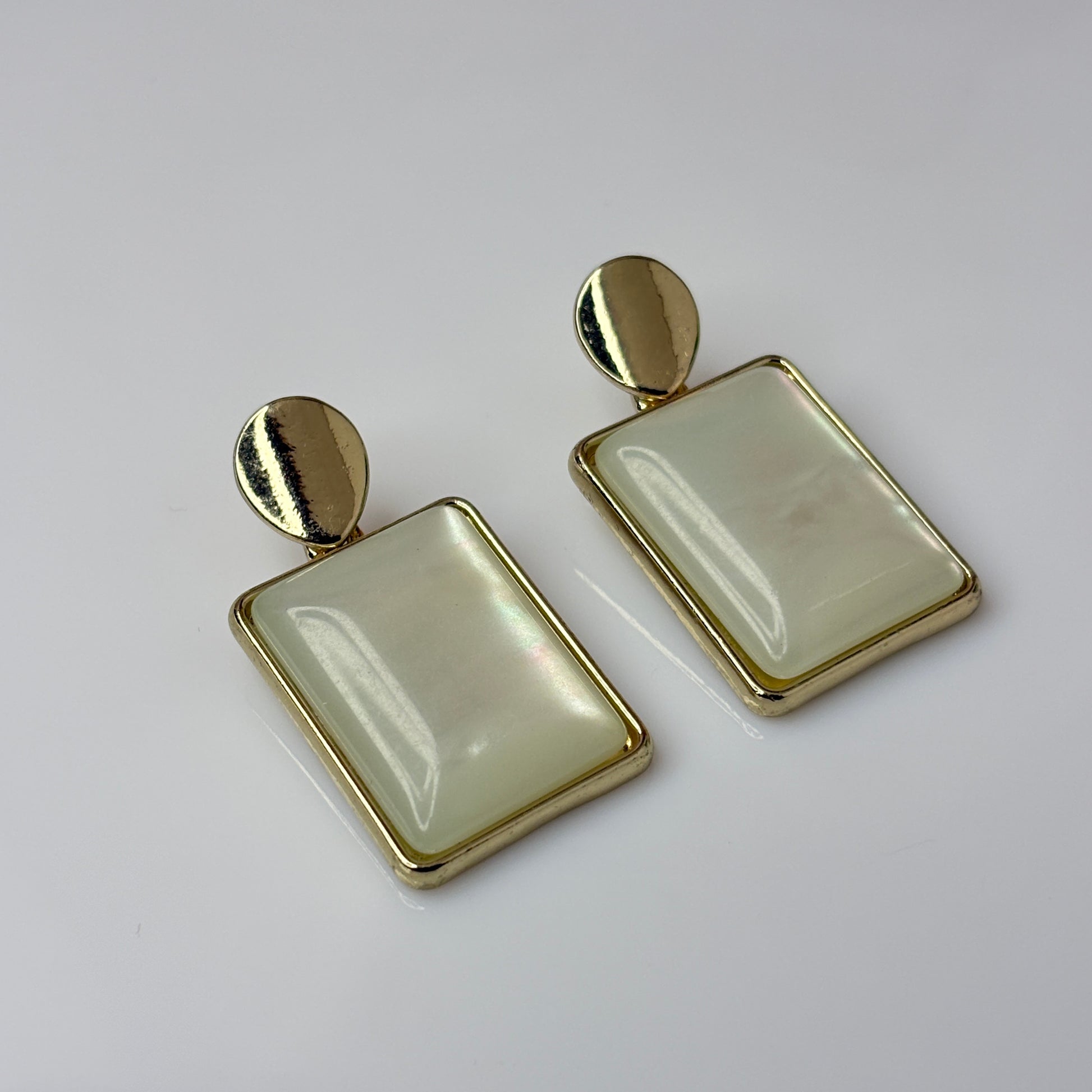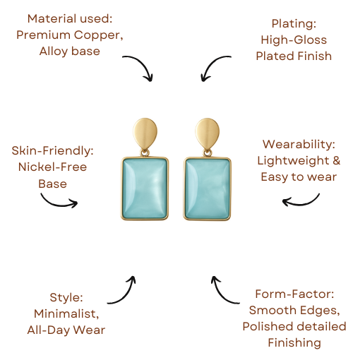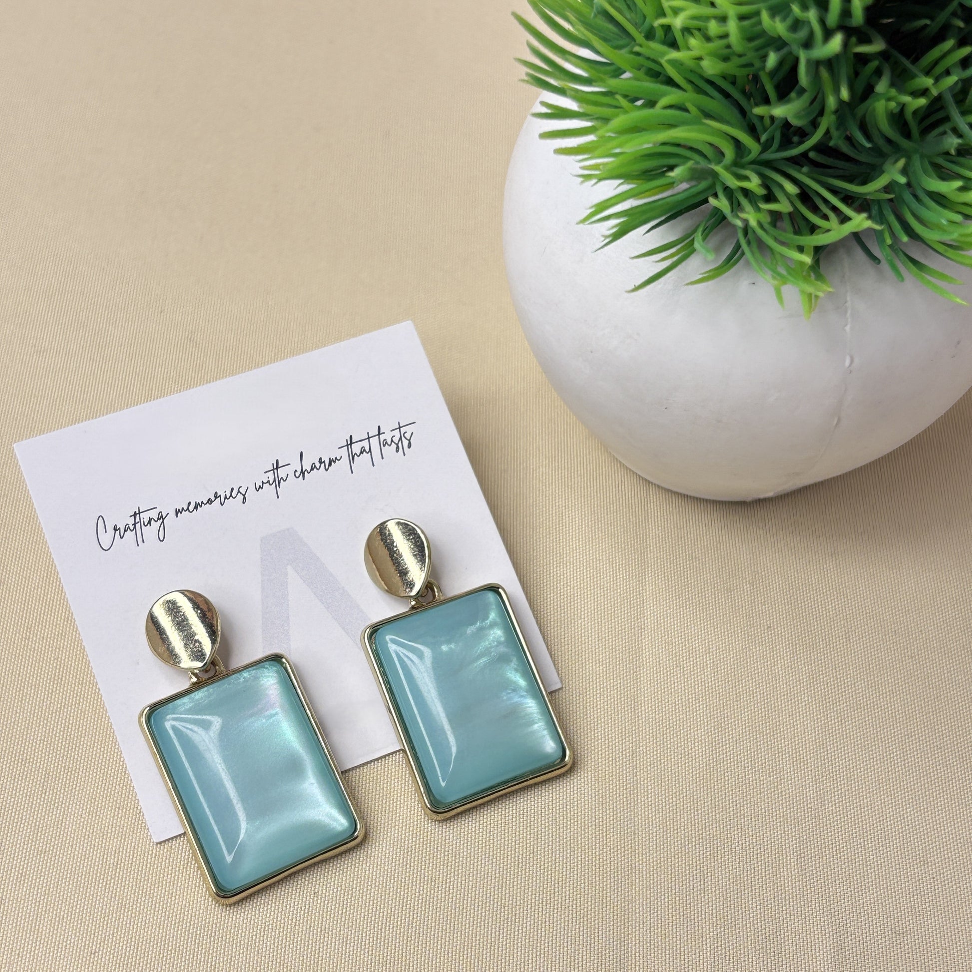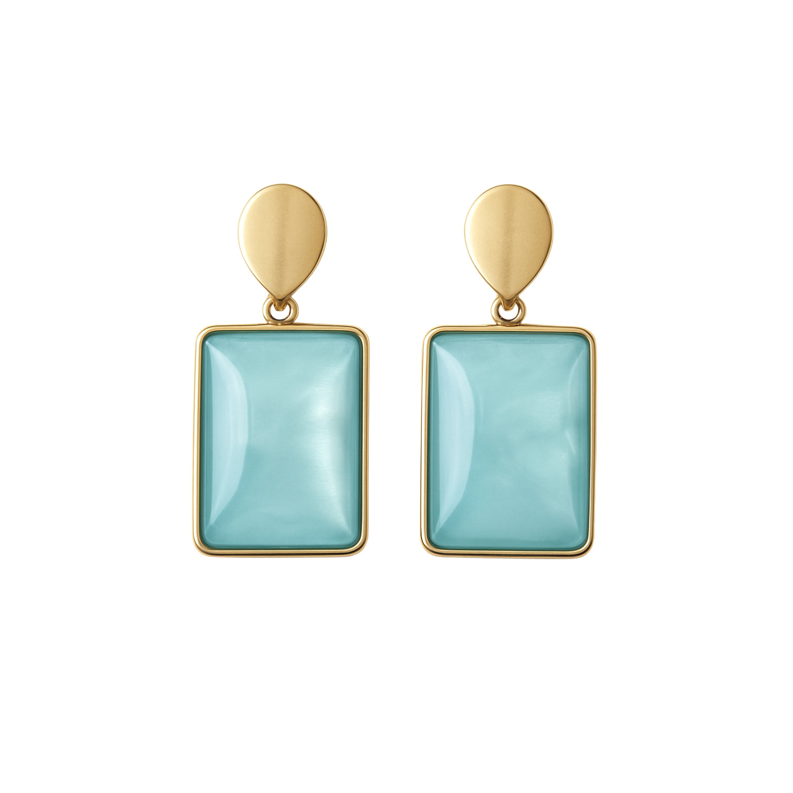 A bold yet refined statement, these earrings feature glossy aqua-hued rectangles framed in radiant gold. Their sleek design and vibrant shine make them perfect for adding a touch of elegance to both day and evening looks.