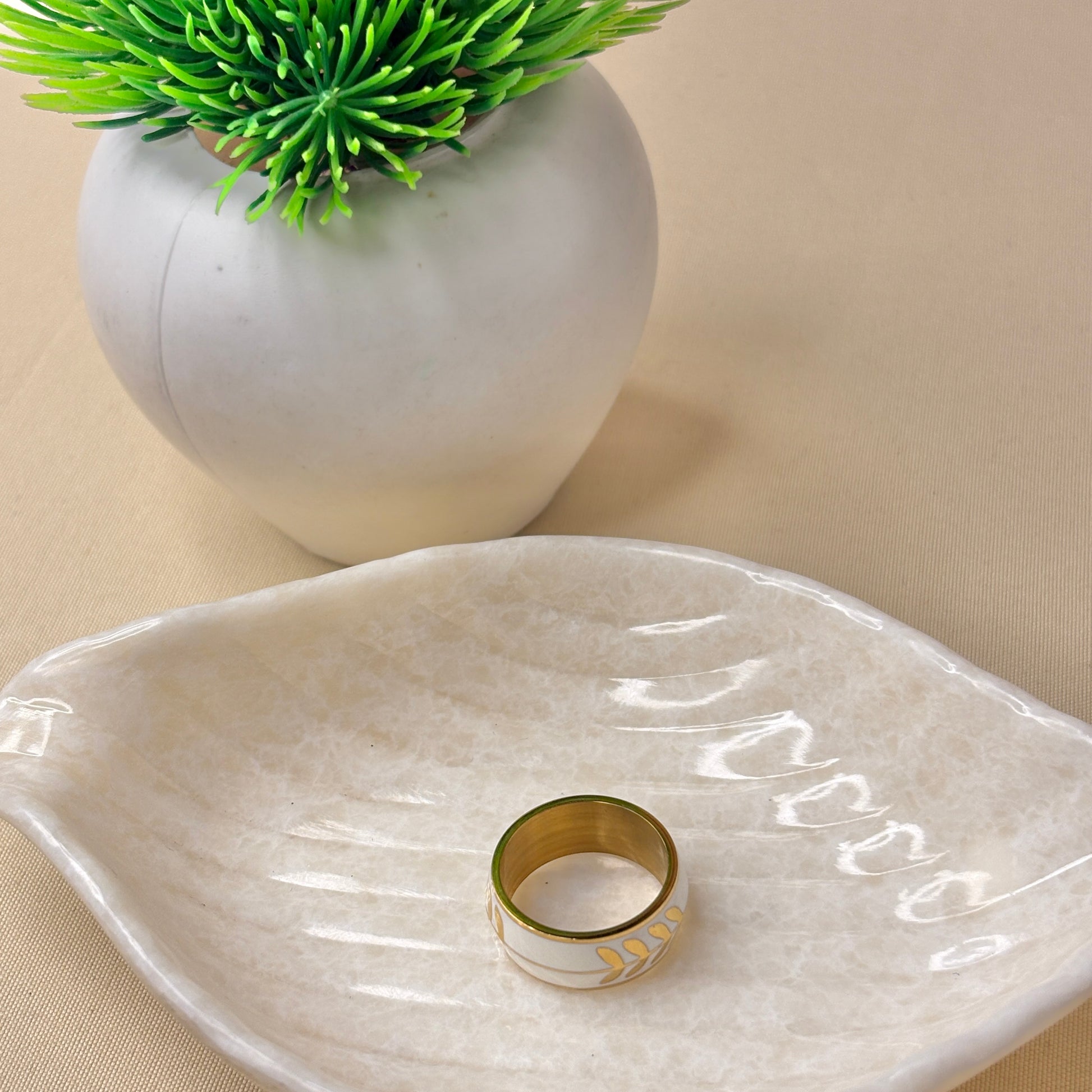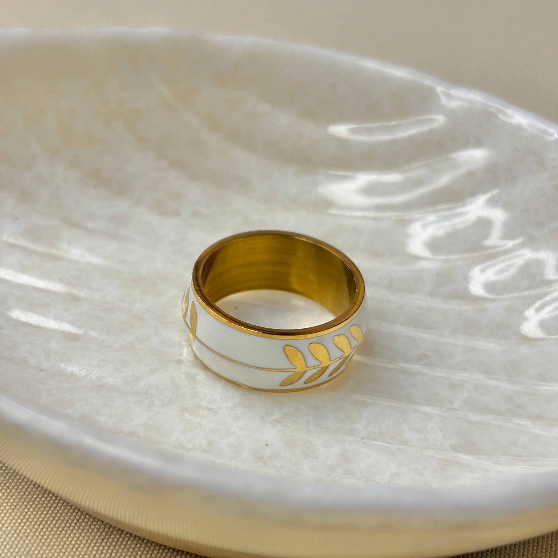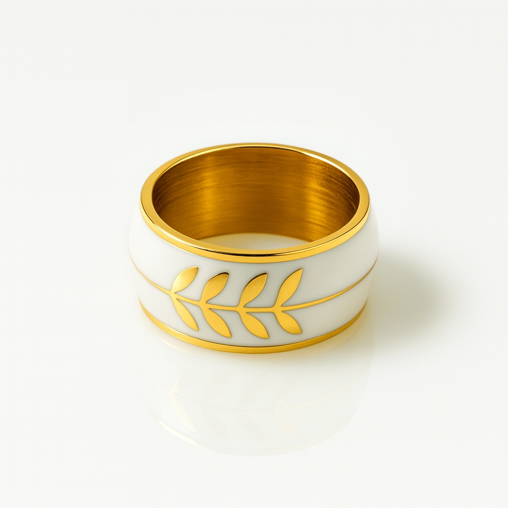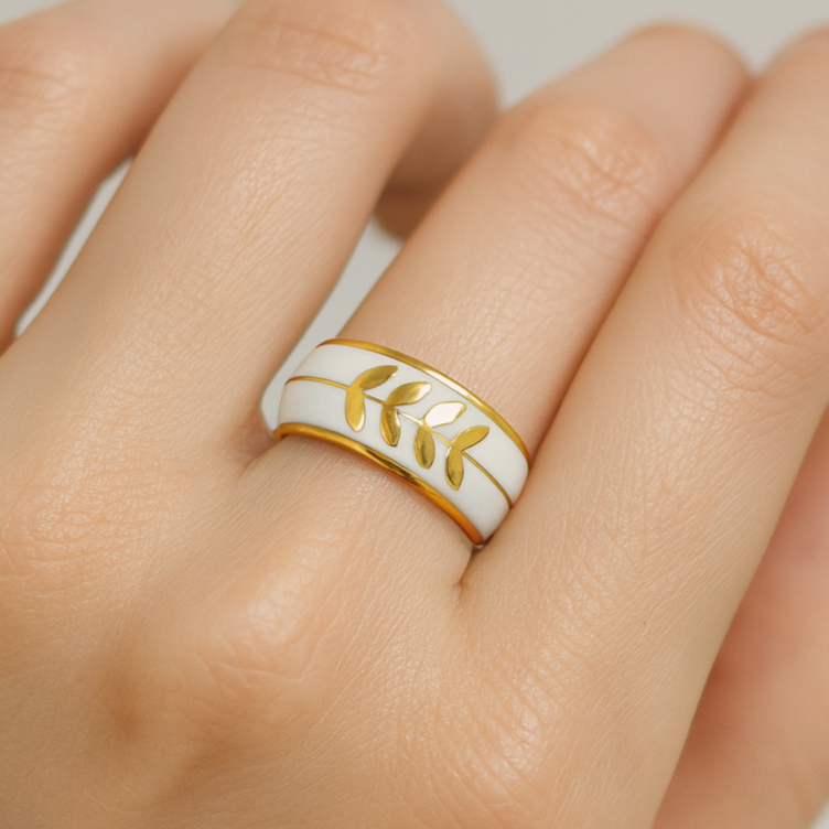 A sleek ring with elegant leaf motifs etched over a smooth enamel base. A perfect blend of minimal charm and timeless sophistication.