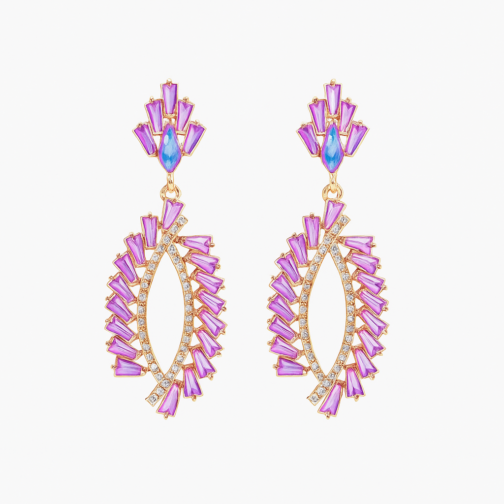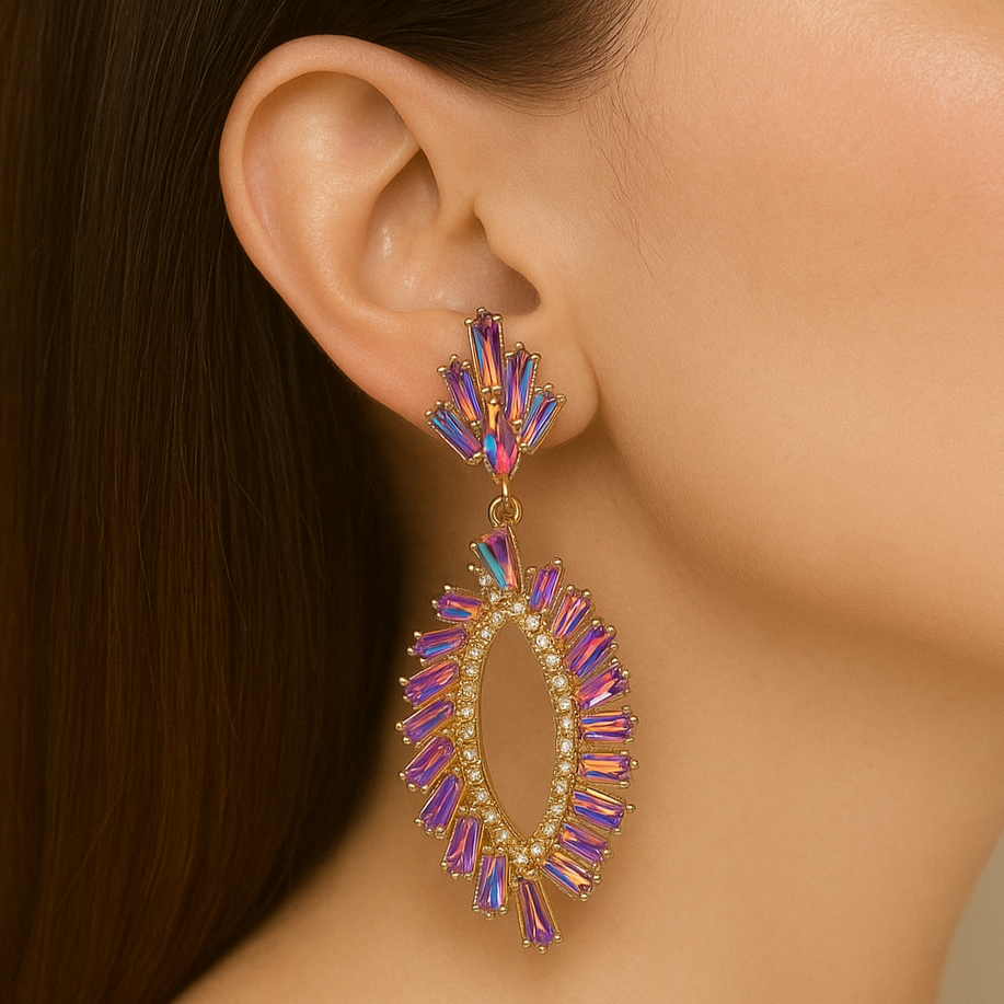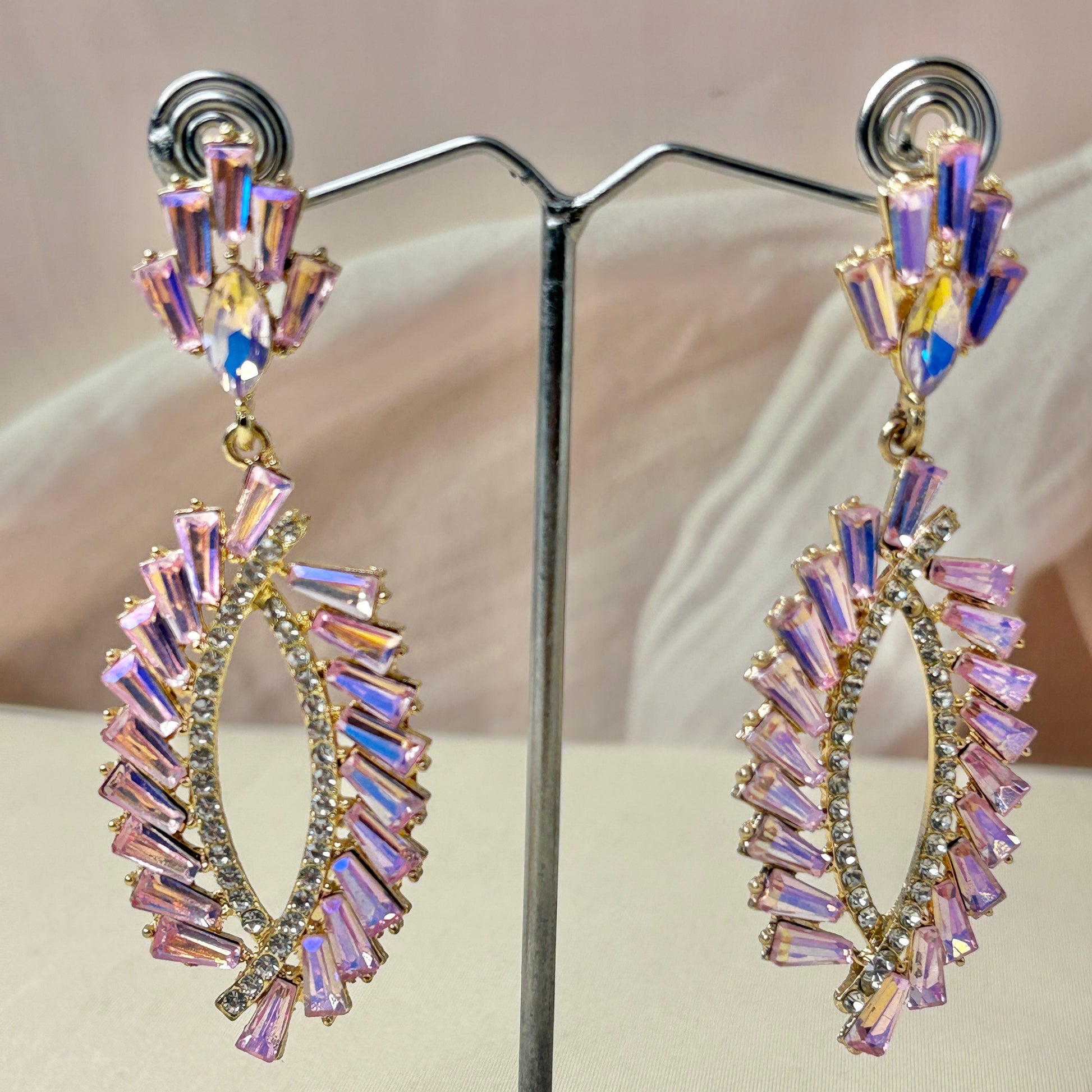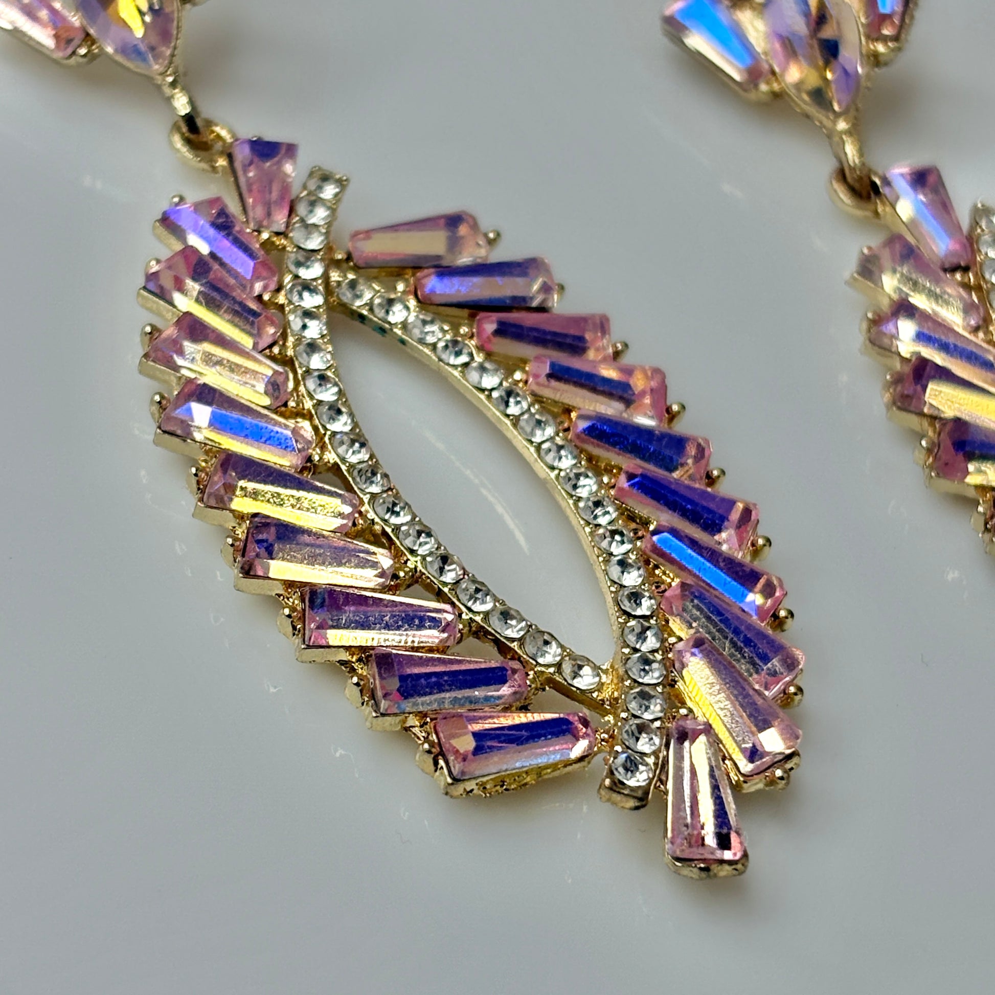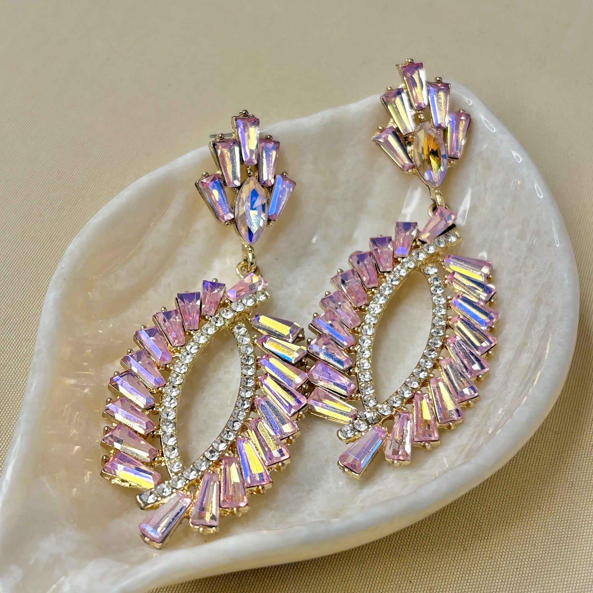 Bursting with iridescent pink crystals and shimmering rhinestone accents, these earrings radiate glamour and elegance. A dazzling statement piece, perfect for weddings, parties, or any star-studded occasion.