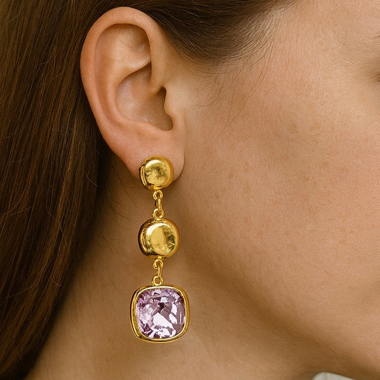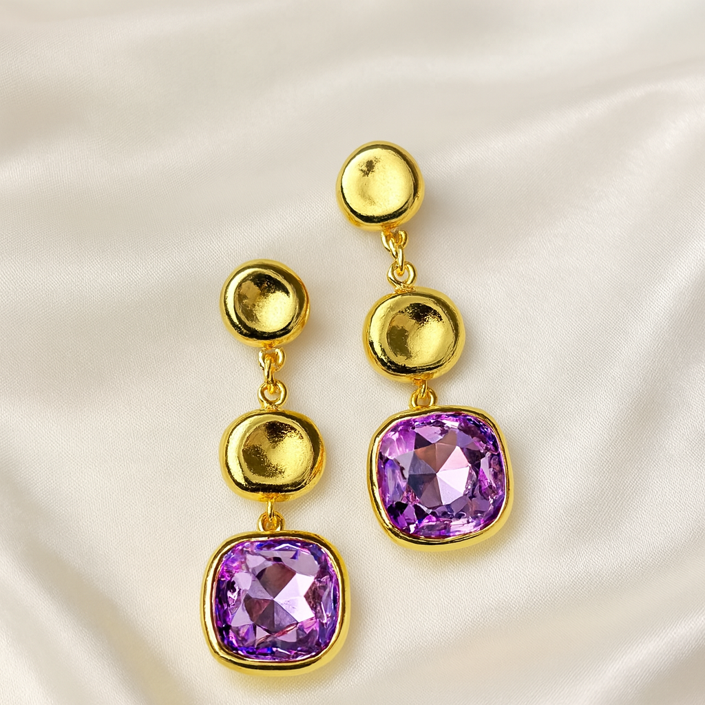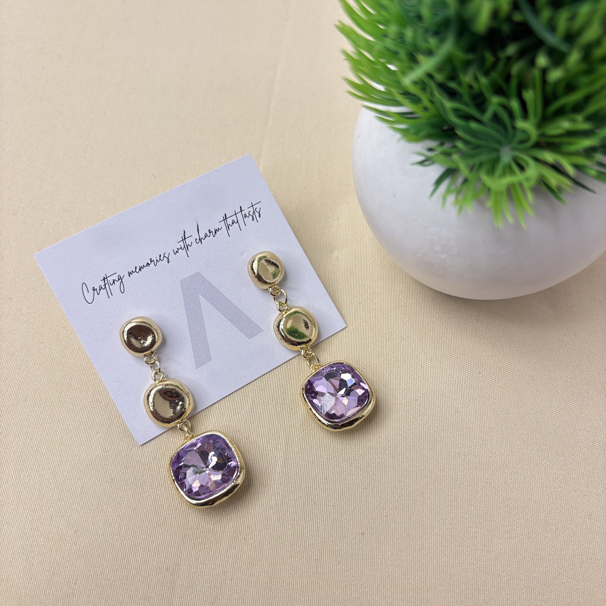 A playful blend of shimmer and charm, these earrings cascade with a soft violet brilliance framed in golden elegance. Perfect for adding a radiant touch to both casual and evening looks.