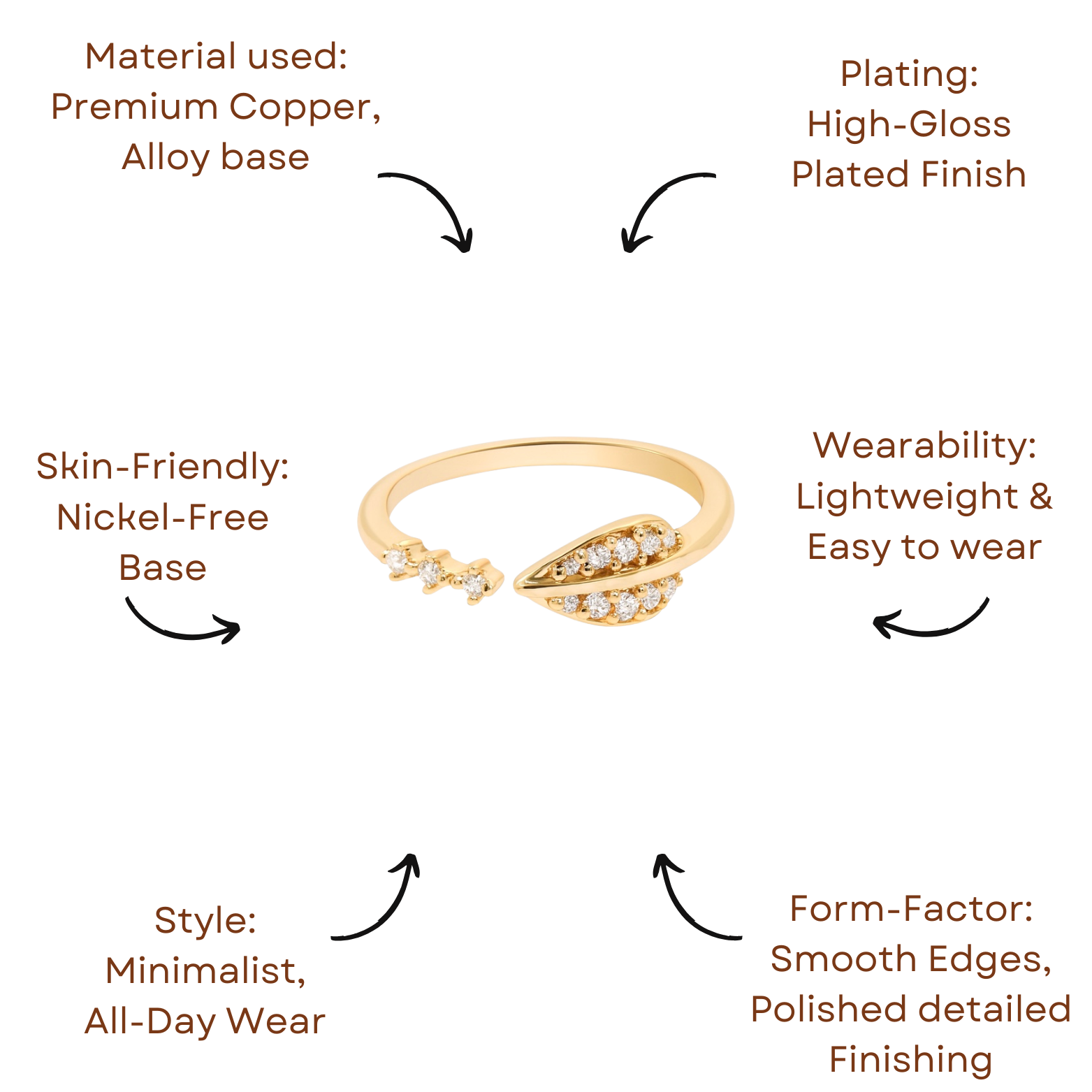A graceful open band ring inspired by a budding flower, featuring a petal-like design adorned with dazzling white crystals. Its minimalist silhouette and polished gold finish make it a timeless piece that adds a soft, romantic touch to any look. Adjustable for the perfect fit — wear it solo or stack it for effortless sophistication.