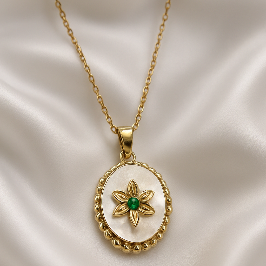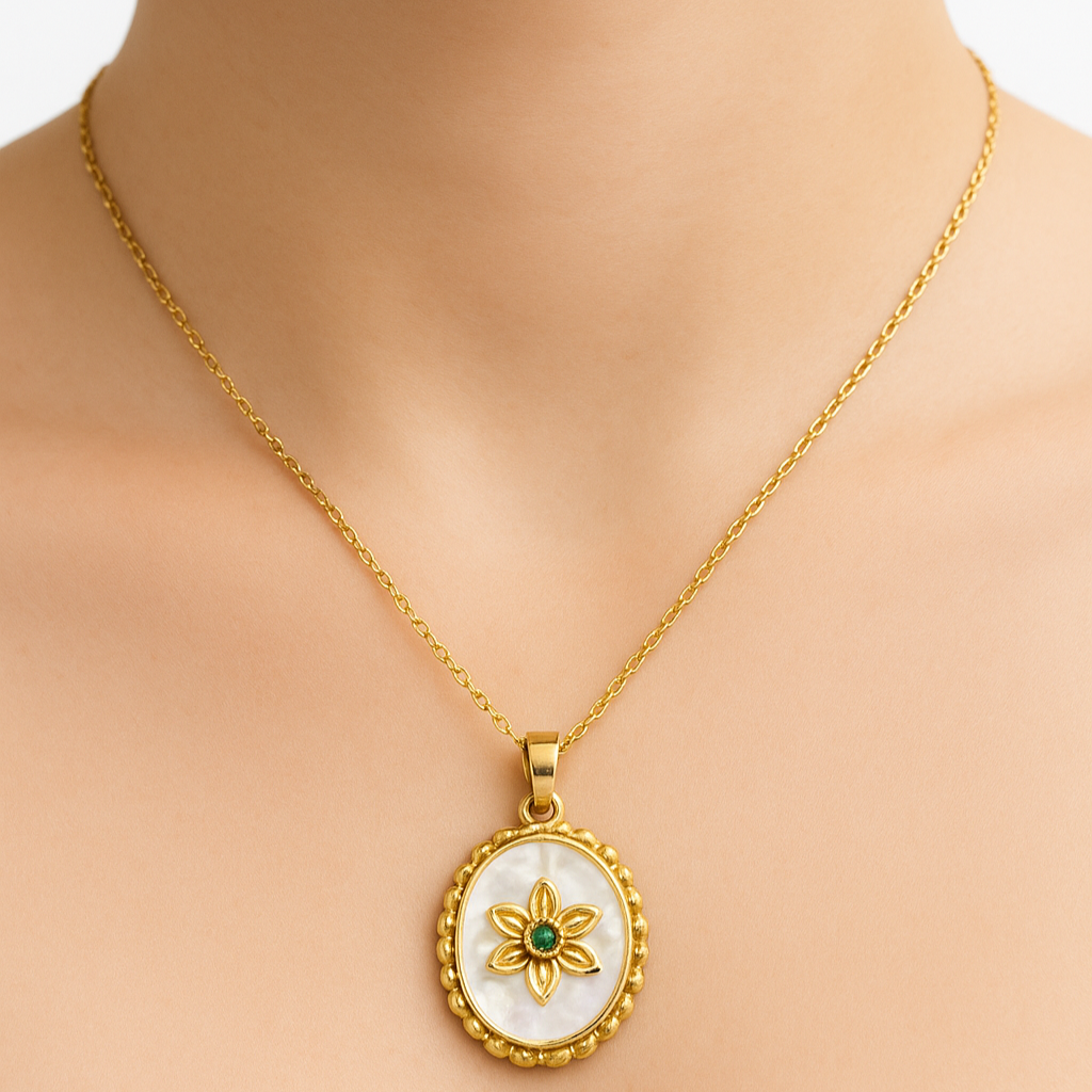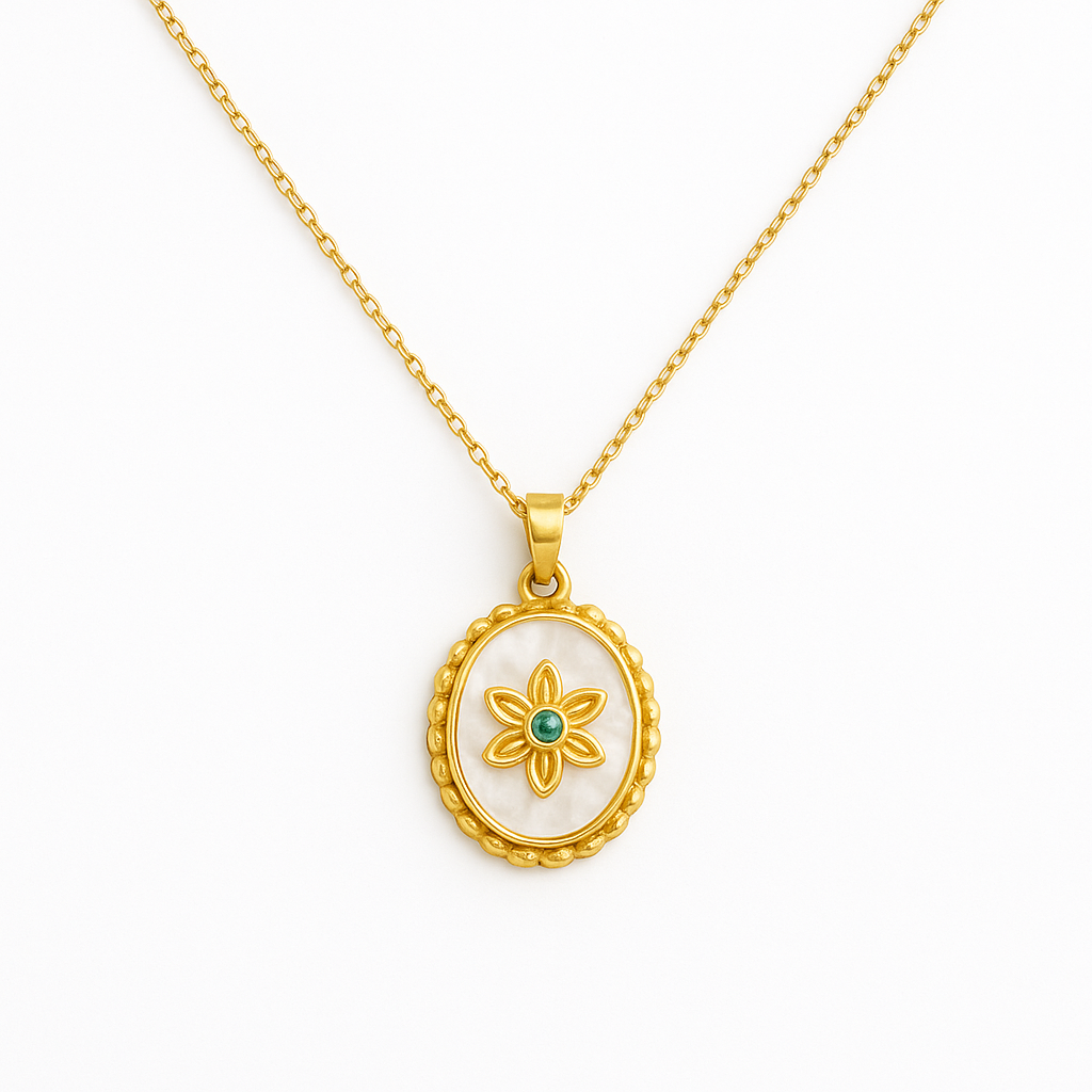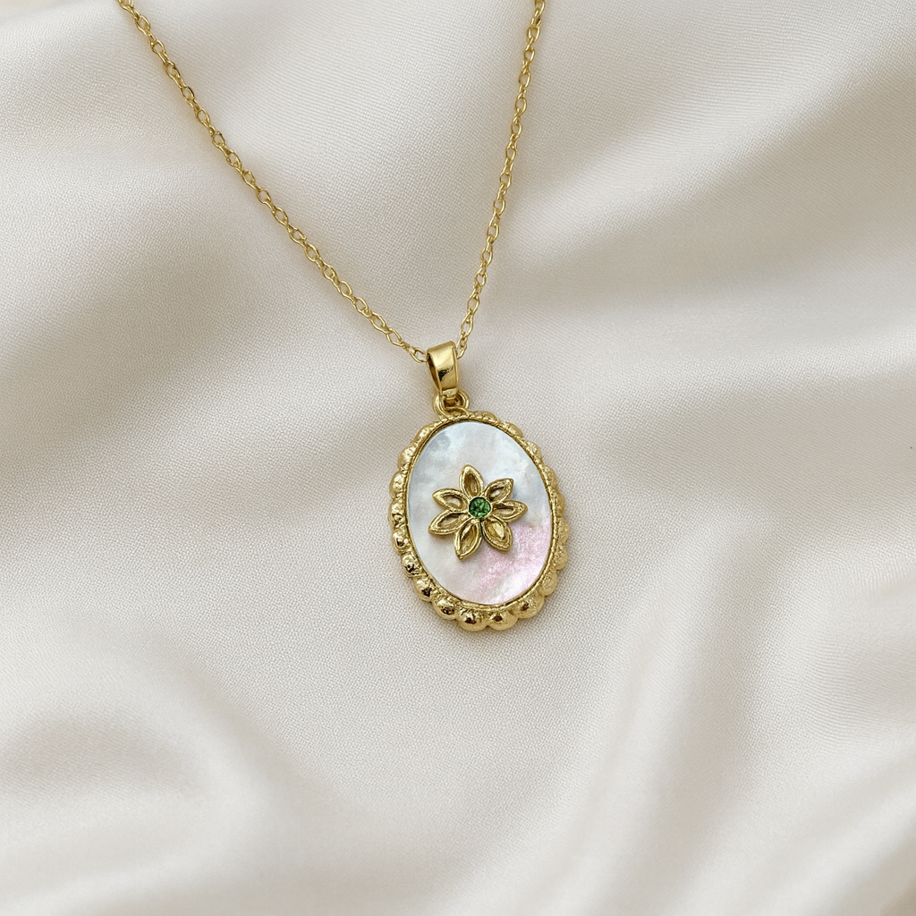 Celeste Bloom captures the charm of nature’s elegance, showcasing a delicate floral motif set against a lustrous oval base. The intricate golden frame adds vintage allure, while the subtle shimmer of the centerpiece brings a touch of modern refinement. A timeless design that celebrates beauty in full bloom.