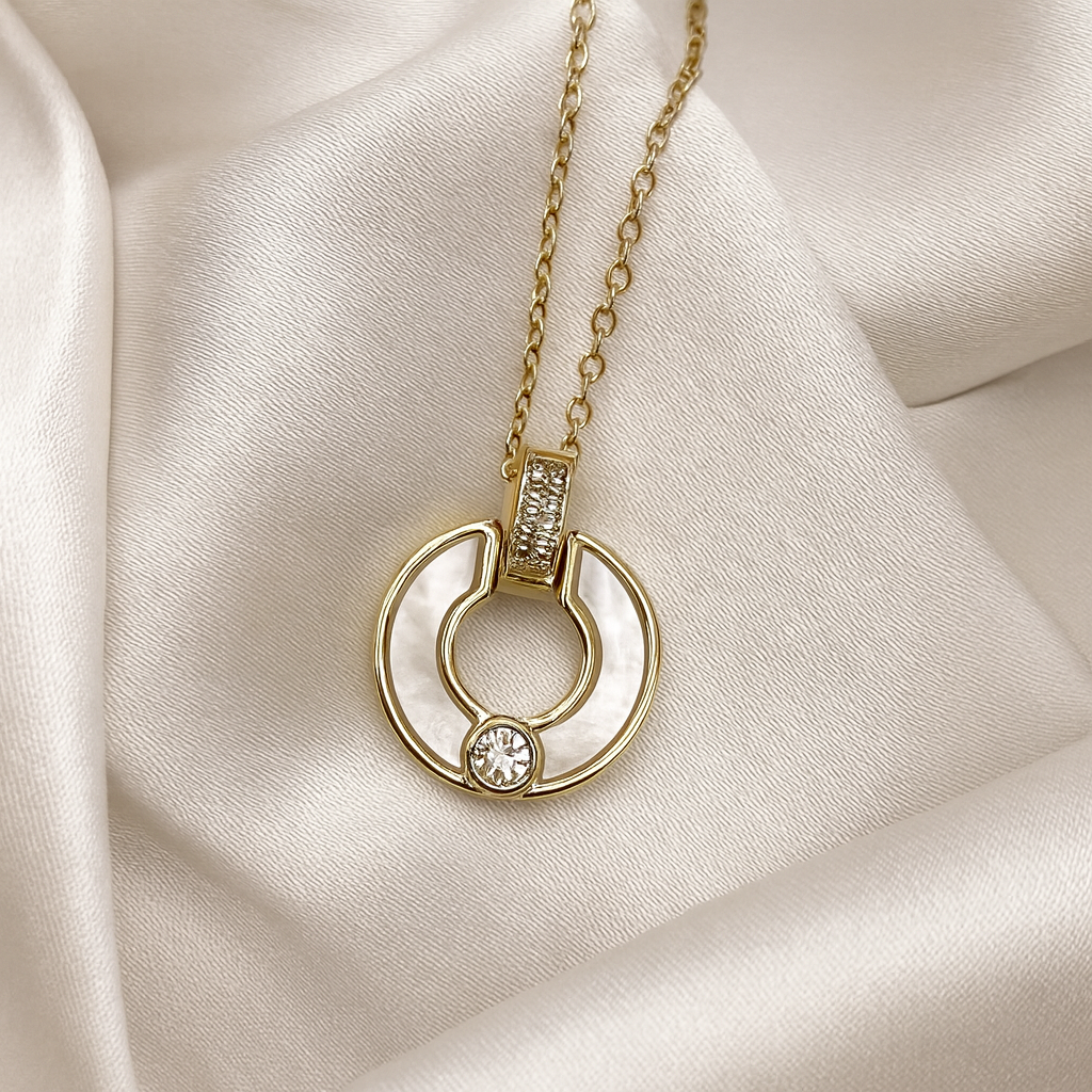 Modern yet timeless, this pendant necklace features a golden circular charm accented with mother-of-pearl detailing and a sparkling stone. Its minimalist elegance makes it a versatile piece—perfect for adding a refined touch to both casual and evening outfits. A chic essential for every jewelry lover.
