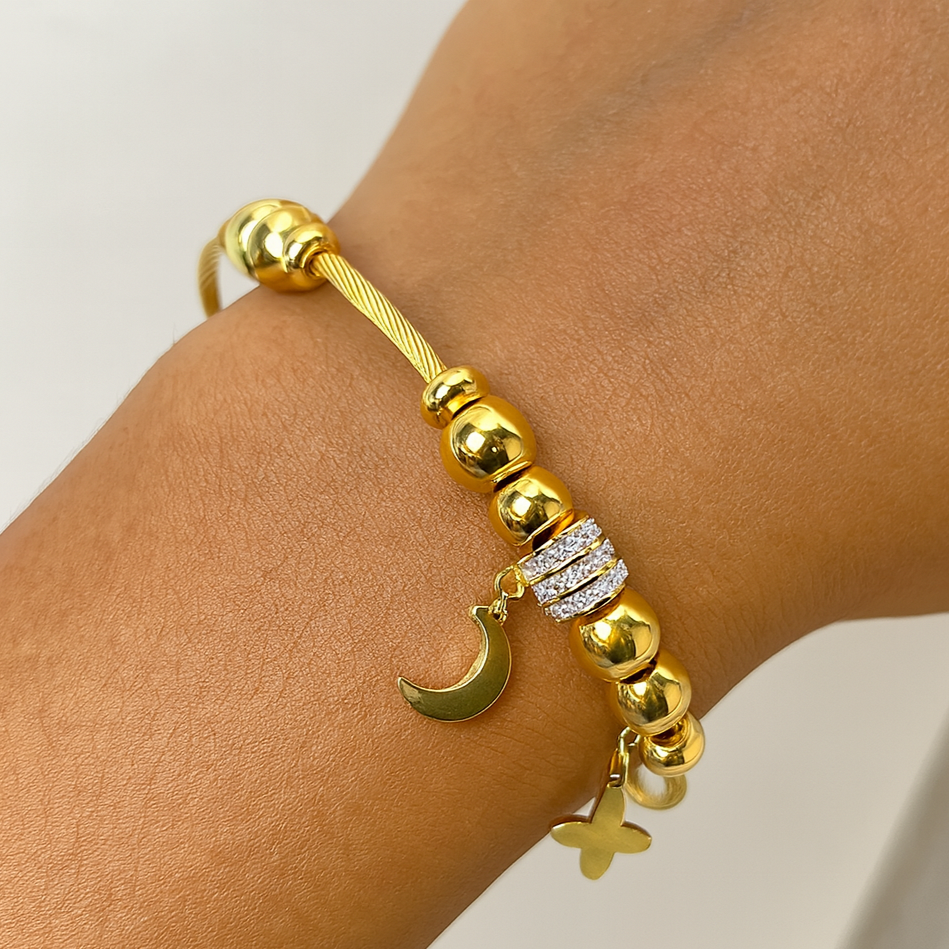 A golden bracelet adorned with shimmering beads and delicate butterfly and crescent moon charms. Elegant and symbolic, it’s the perfect piece to carry a touch of the sky with you.