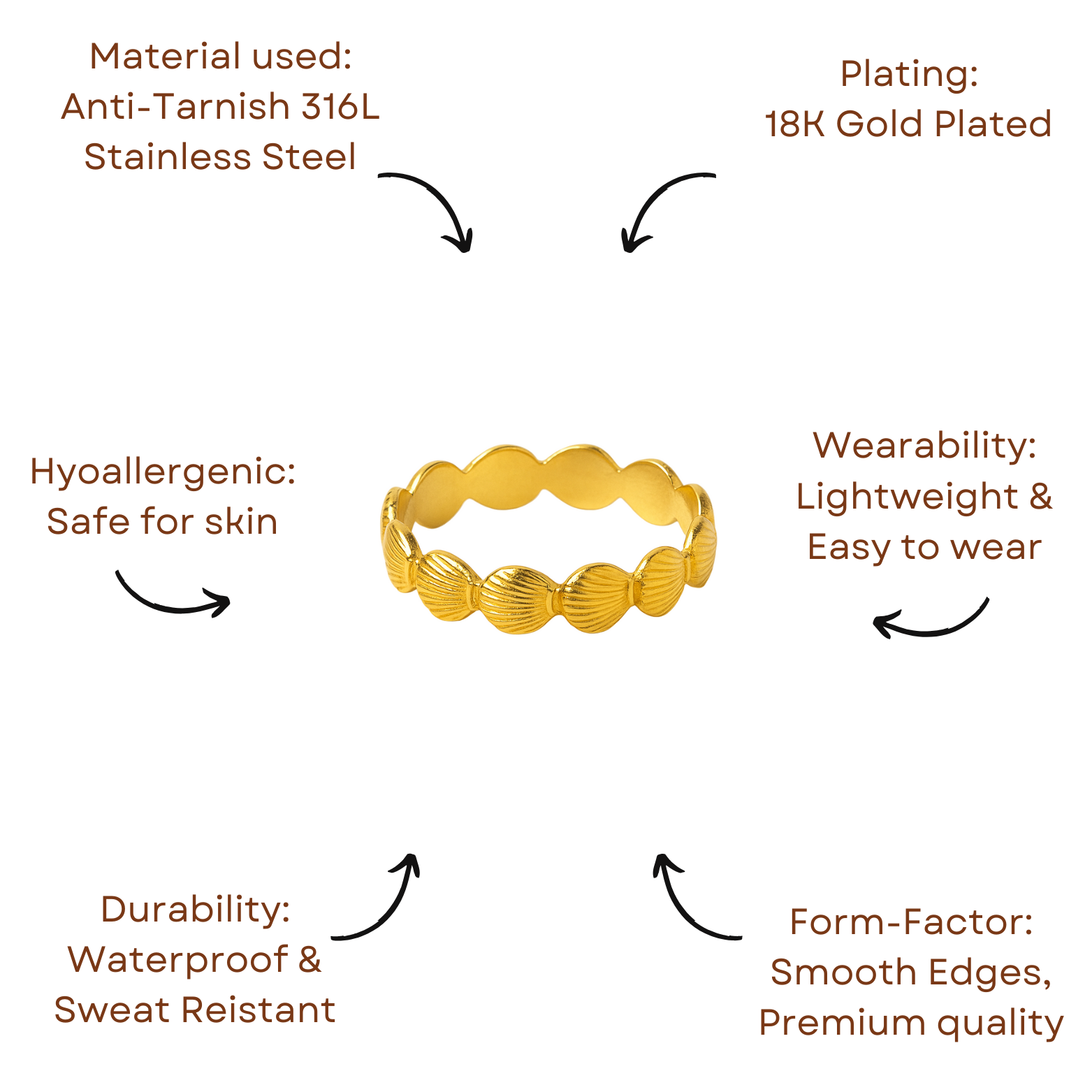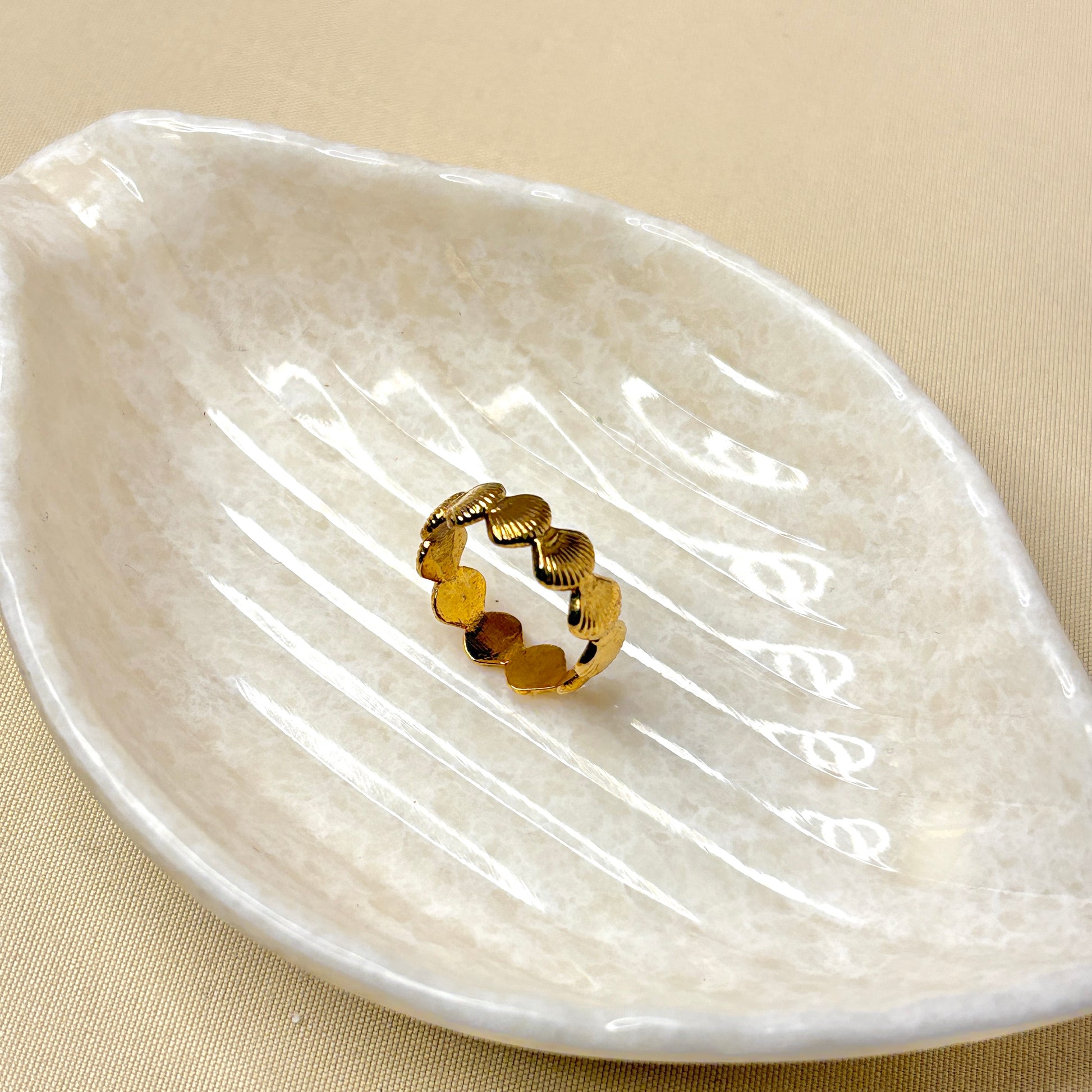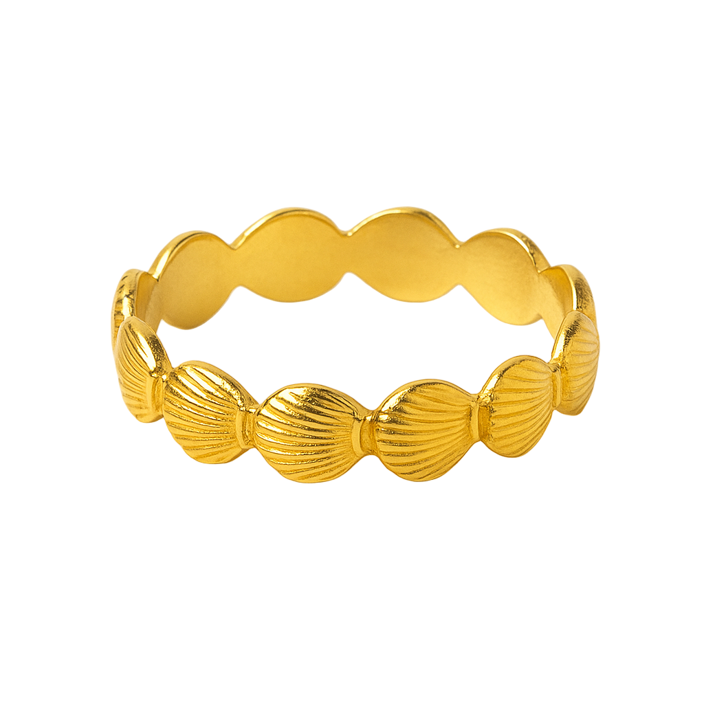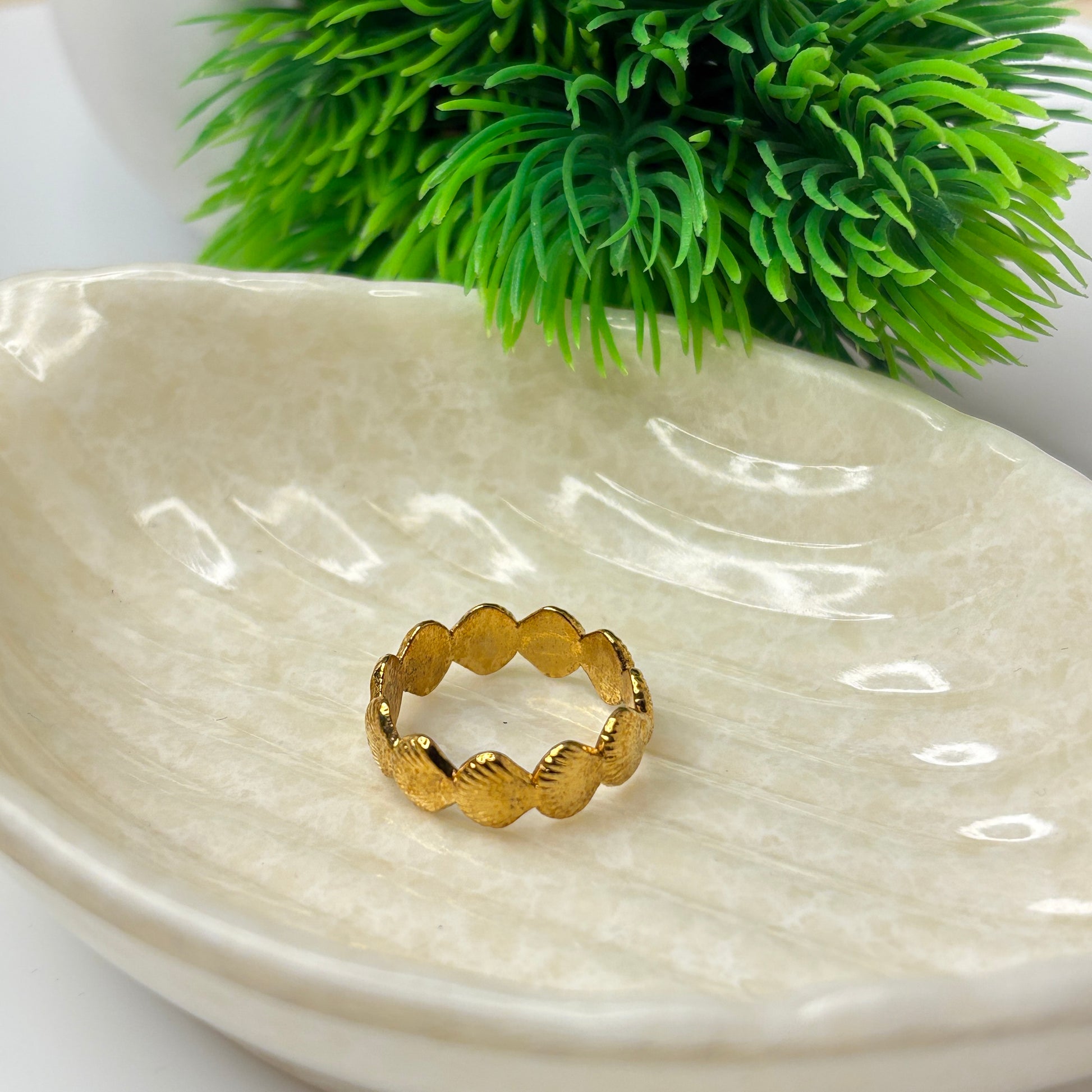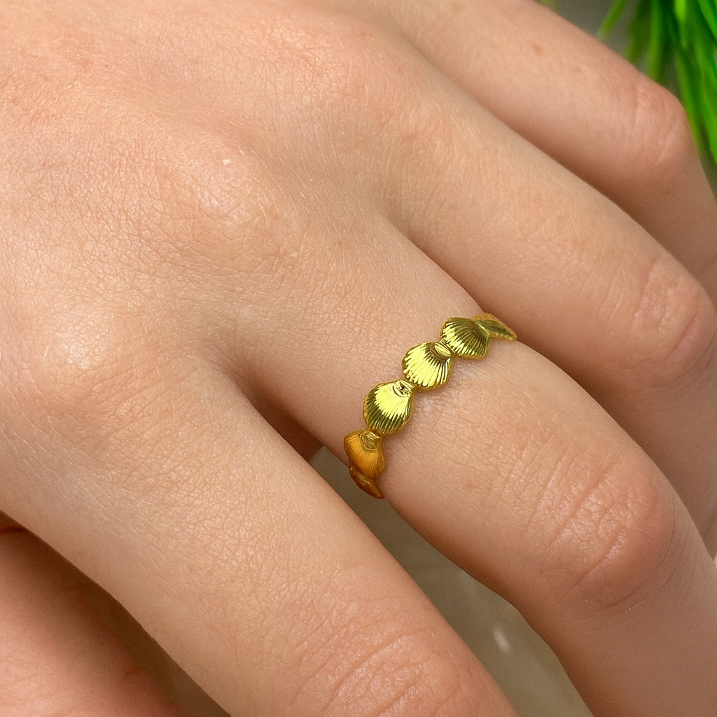 A sleek gold band with delicate shell-like textures, bringing a touch of coastal elegance to your look. Perfect as a stacking ring or worn solo for a minimal statement.