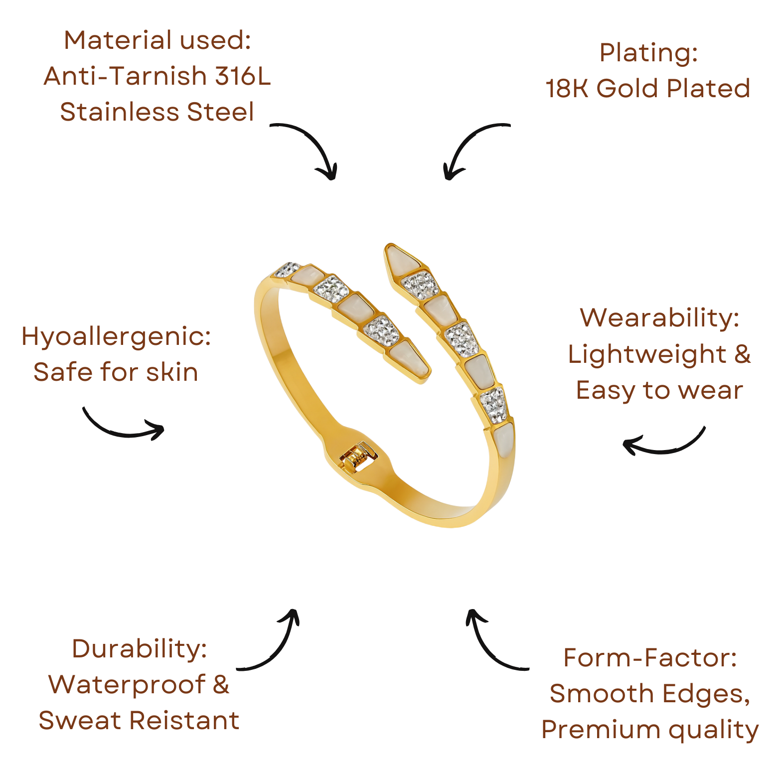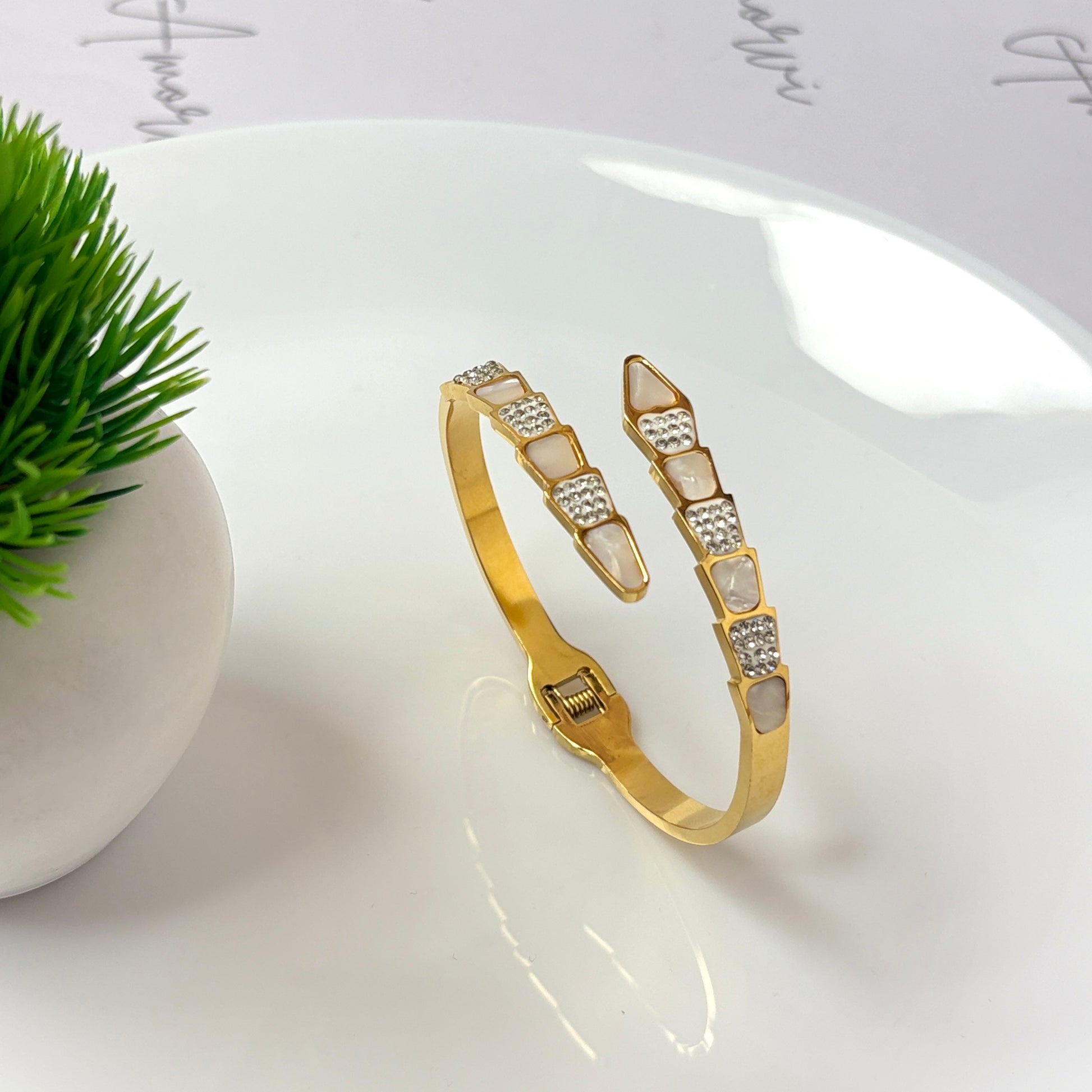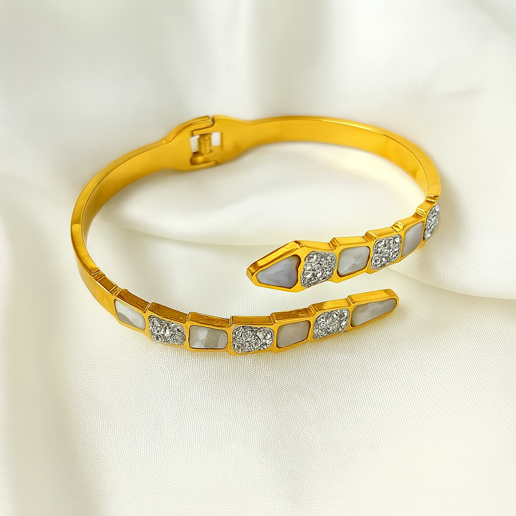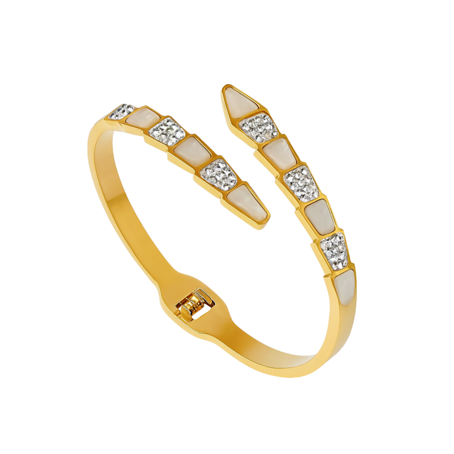 A golden open bangle with crystal-studded accents and pearl-like tiles. Perfect for adding a hint of sparkle to your evening look.