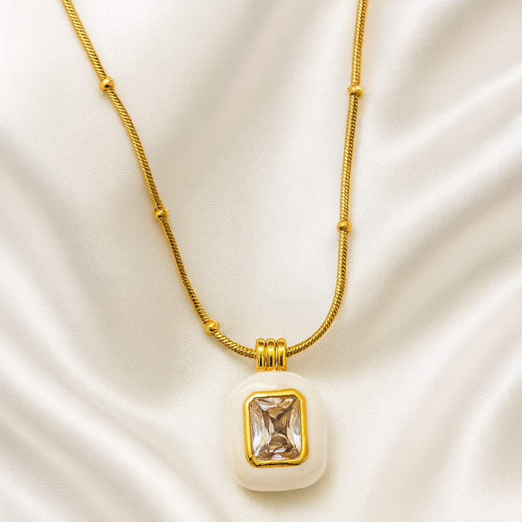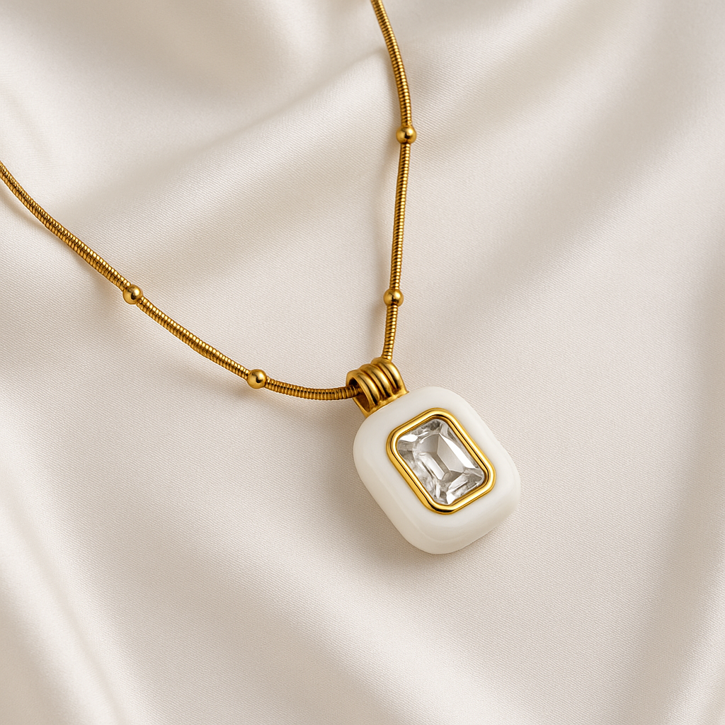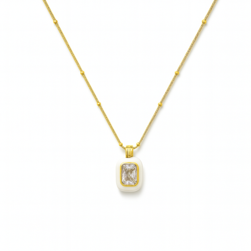 A stunning mix of elegance and modern charm, this necklace features a sleek golden chain with delicate bead accents, holding a radiant rectangular crystal framed in enamel. Its minimal yet luxurious design makes it versatile—perfect for daily wear or as a sparkling highlight for special evenings.