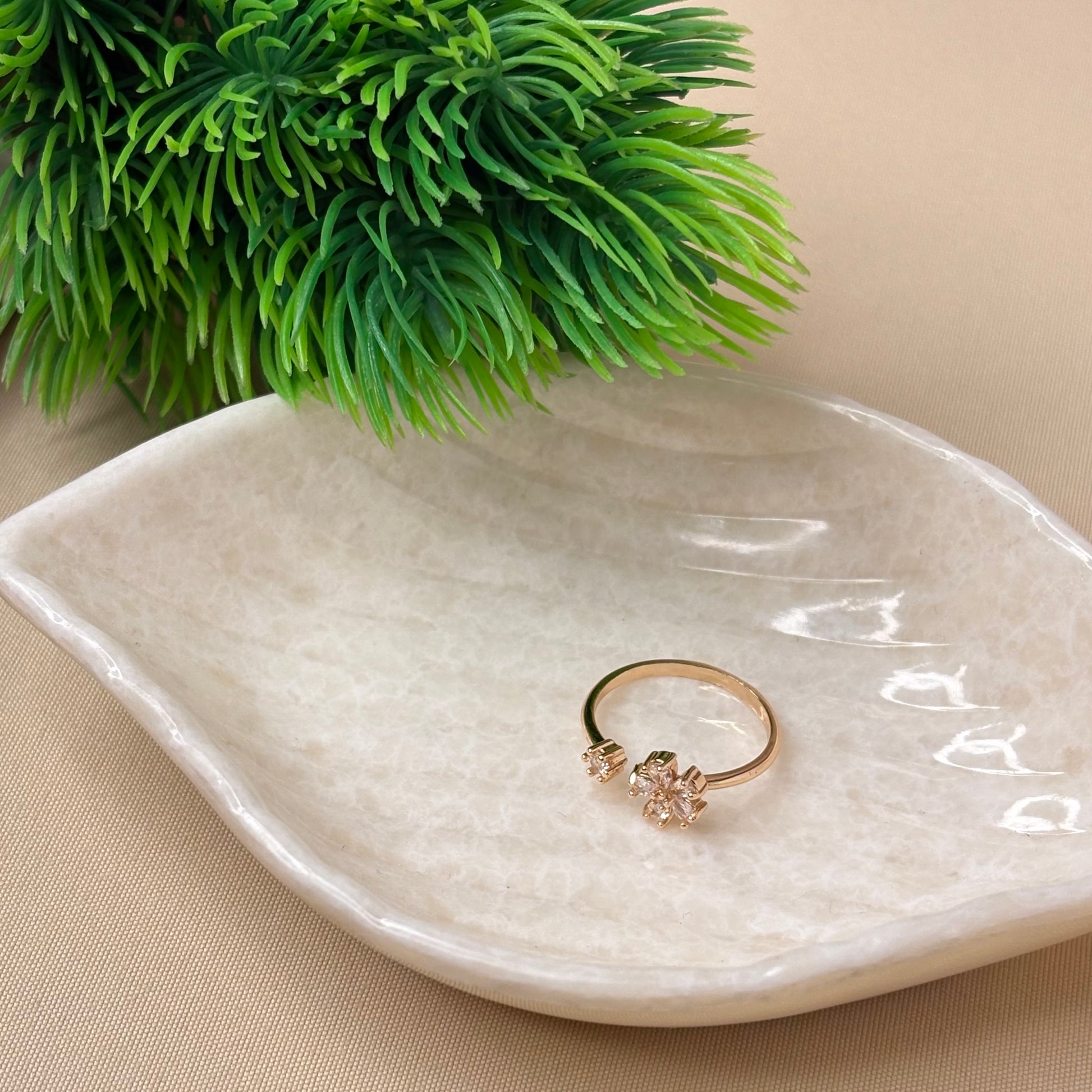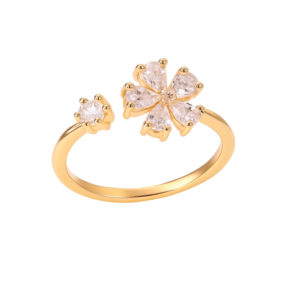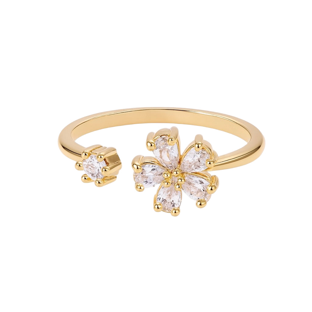 A chic open ring featuring a dazzling five-petal floral cluster on one end and a solitaire stone on the other. This design brings a perfect blend of femininity and sparkle, making it ideal for both casual and festive looks.