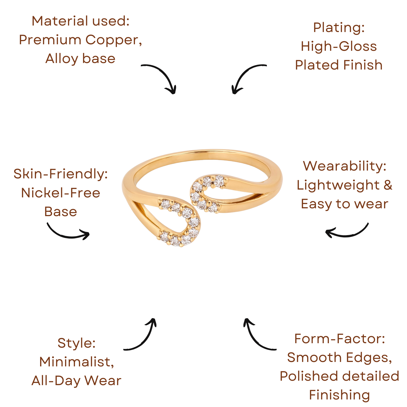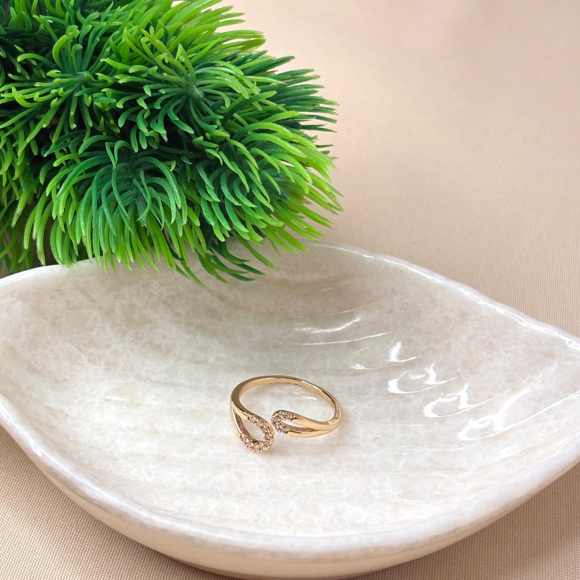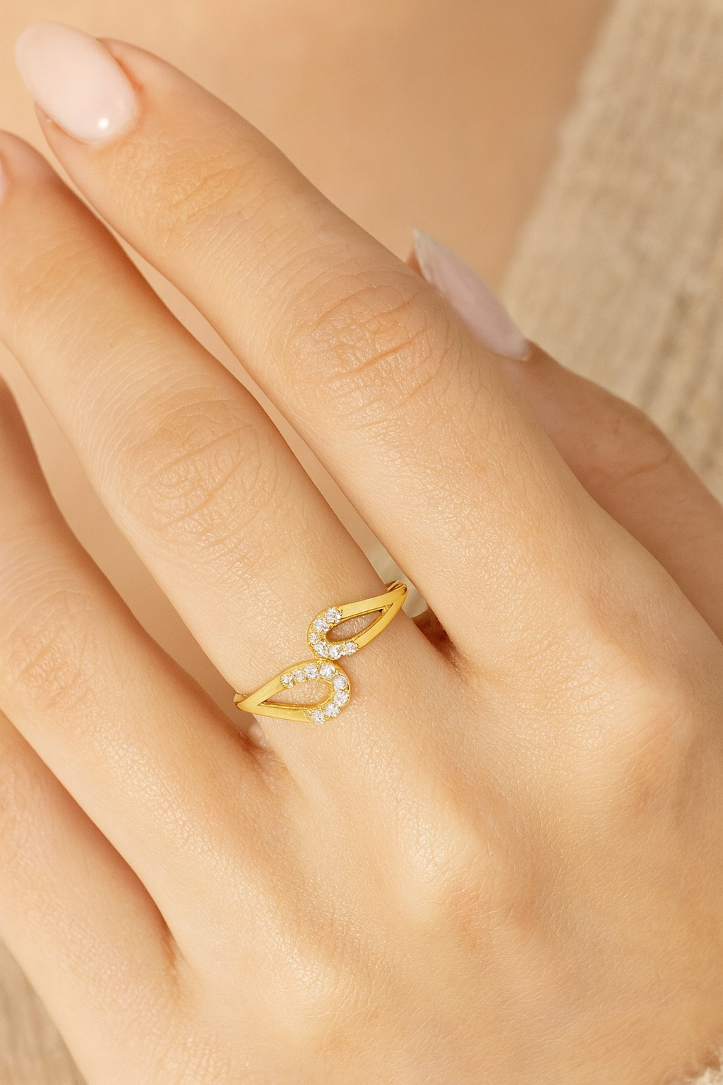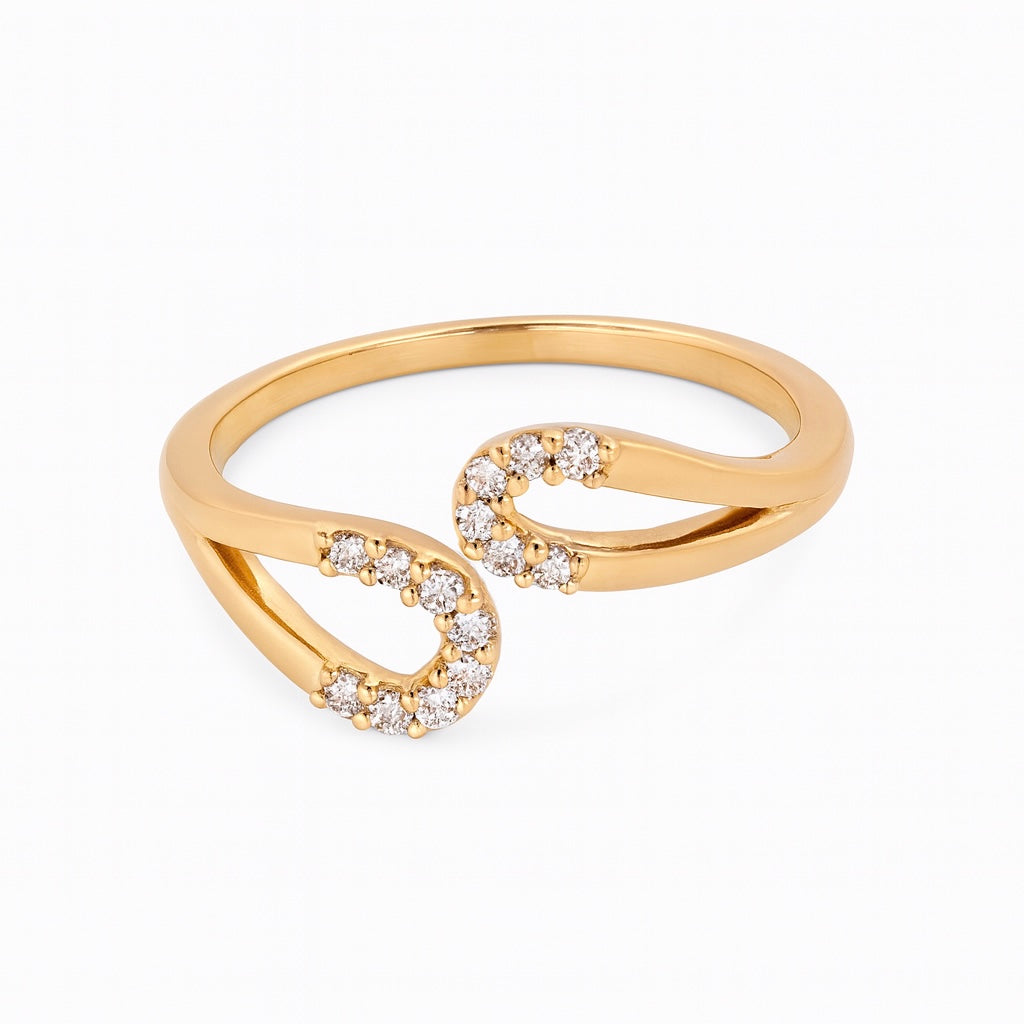 A modern open band ring with two graceful curves, each lined with shimmering white crystals for a delicate sparkle. Its sleek, polished gold finish gives it a contemporary yet timeless look. Perfect as a solo statement or stacked with other rings, it effortlessly elevates any outfit with refined sophistication.