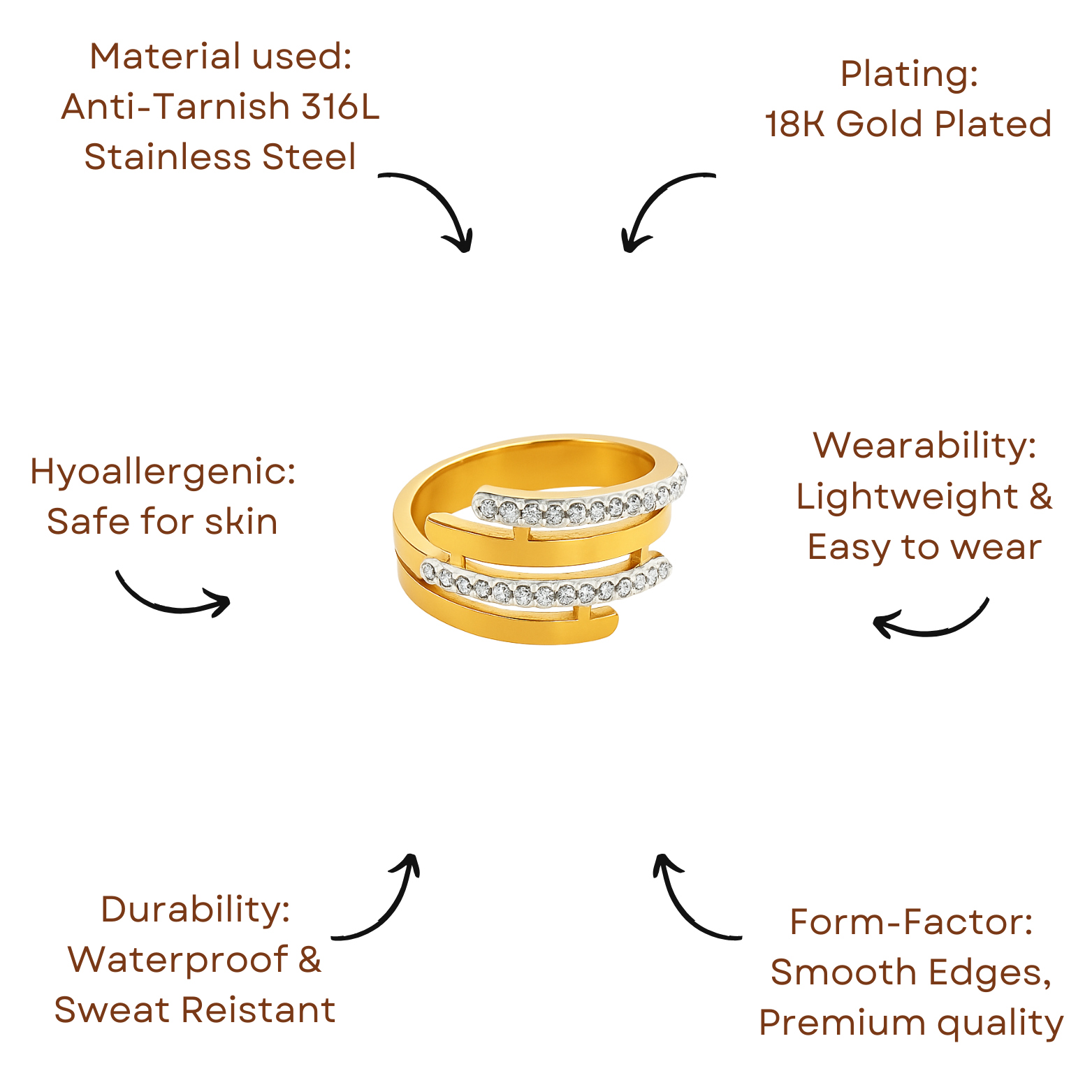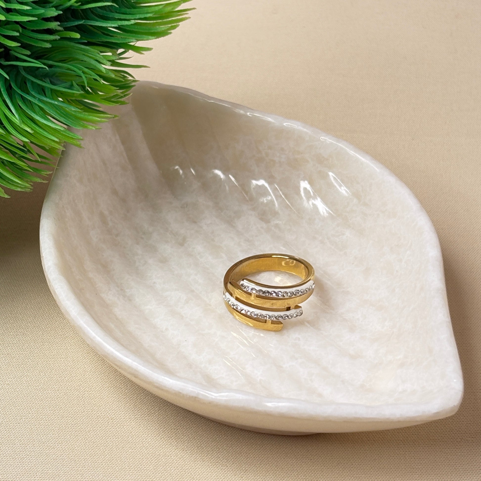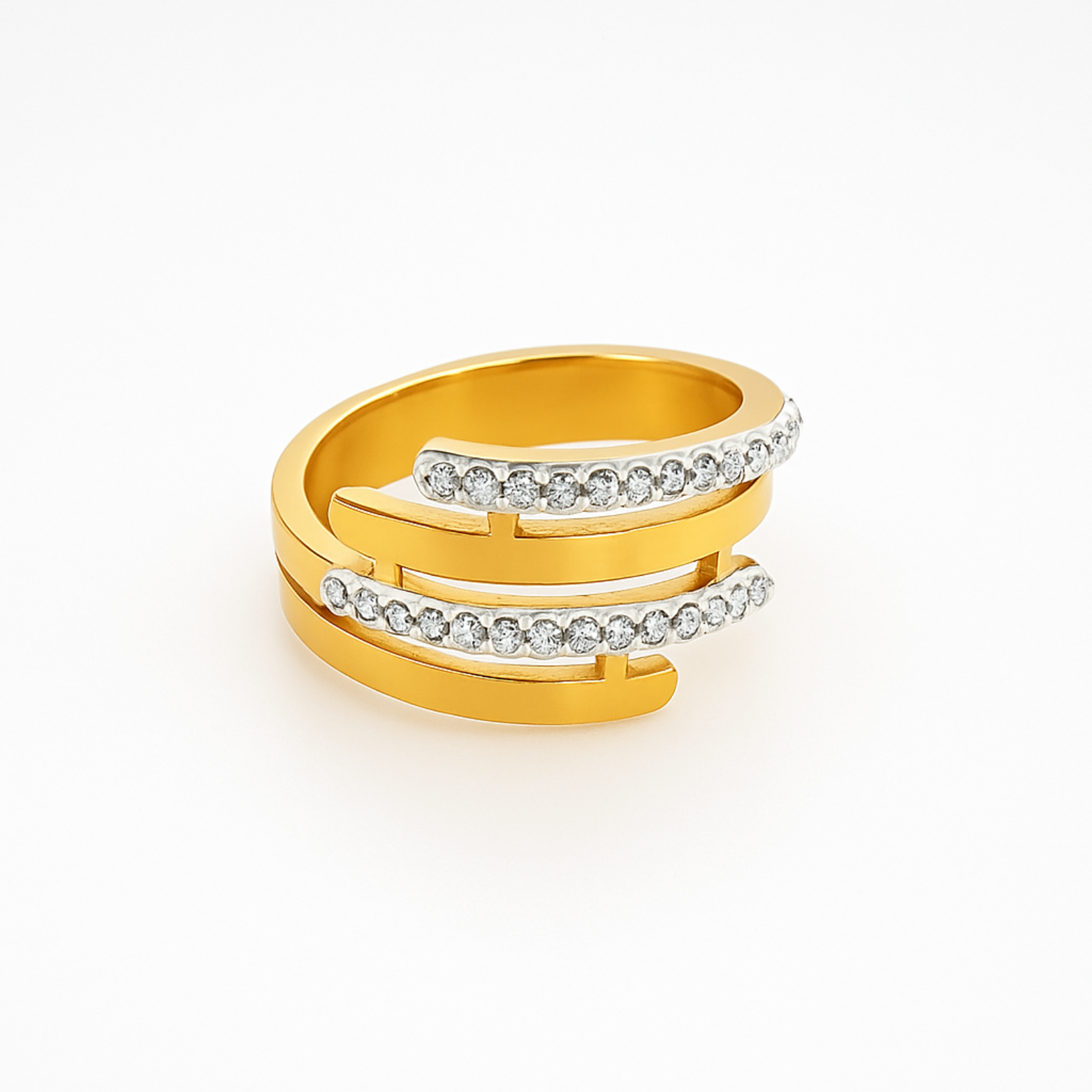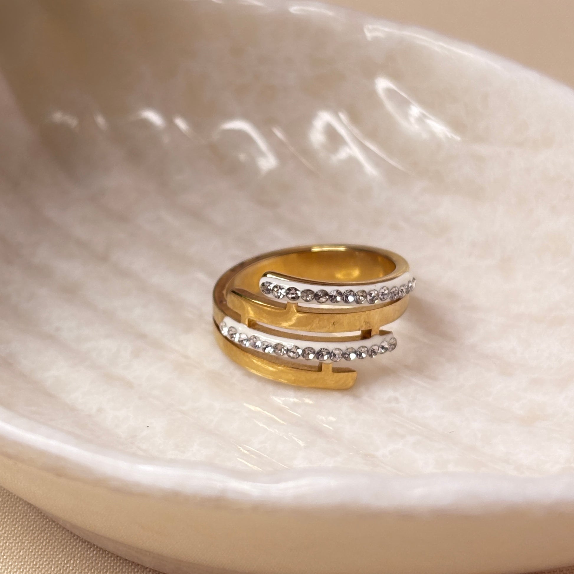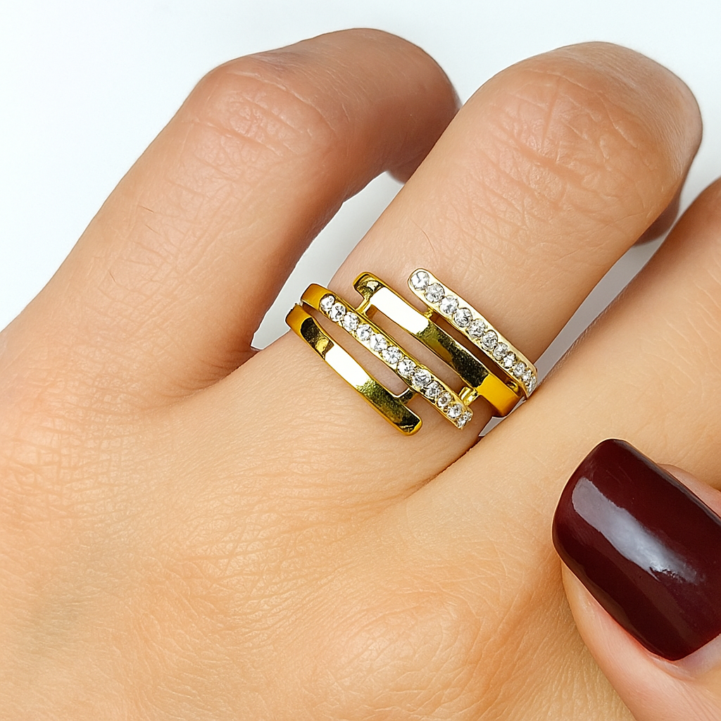 Dusk Orbit reflects the balance between light and shadow — sleek gold curves adorned with subtle crystal shimmer. Bold, minimal, and endlessly captivating.
