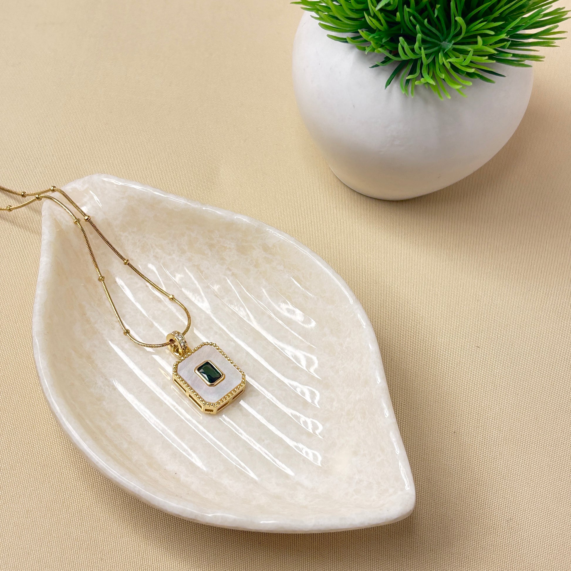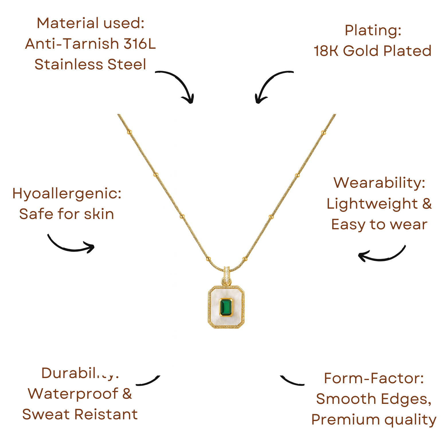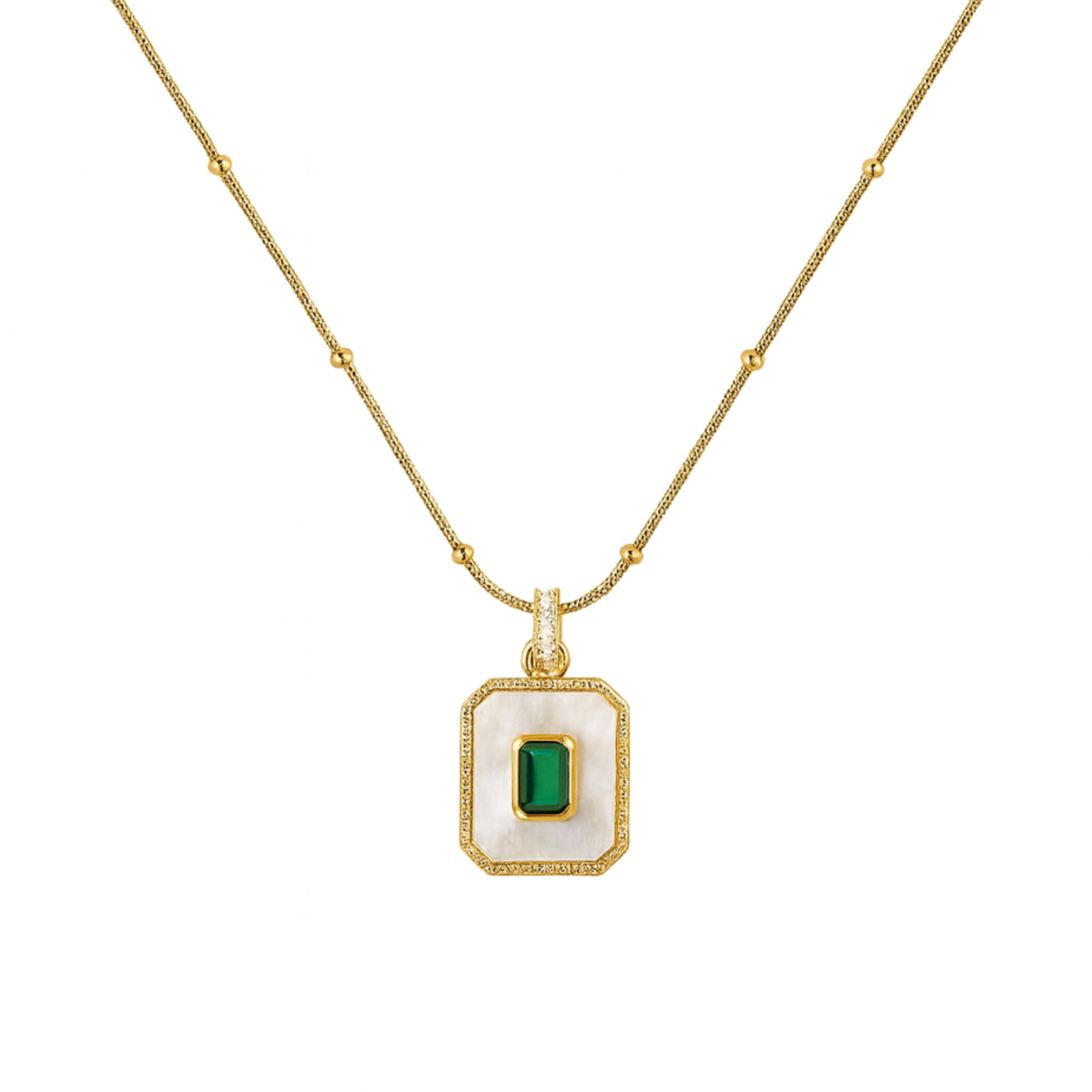 A striking gold chain with a rectangular mother-of-pearl frame, featuring a deep emerald-green stone at its heart. A bold yet elegant statement piece for any occasion.