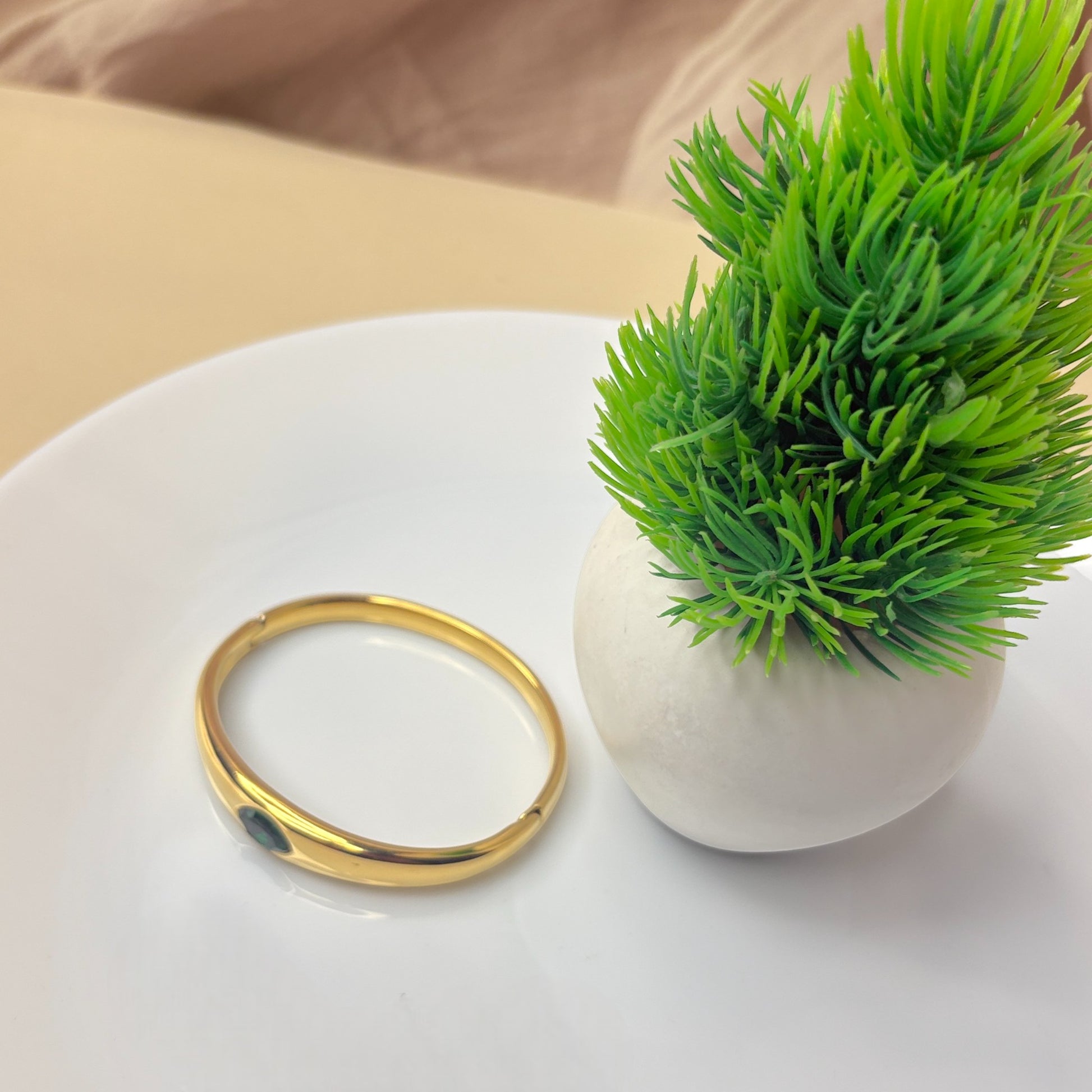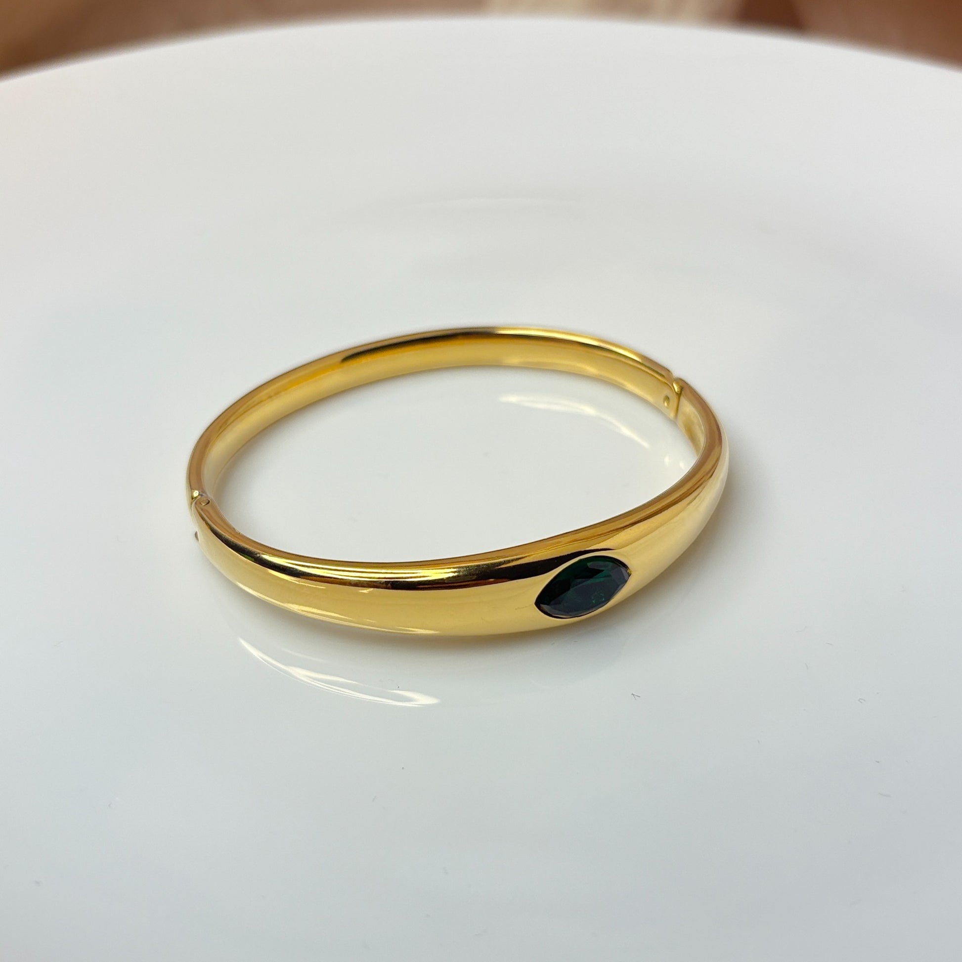 A sleek gold bangle featuring a striking marquise-cut green stone at its center. Minimal yet luxurious, it’s the perfect piece to add a touch of timeless elegance to any look.