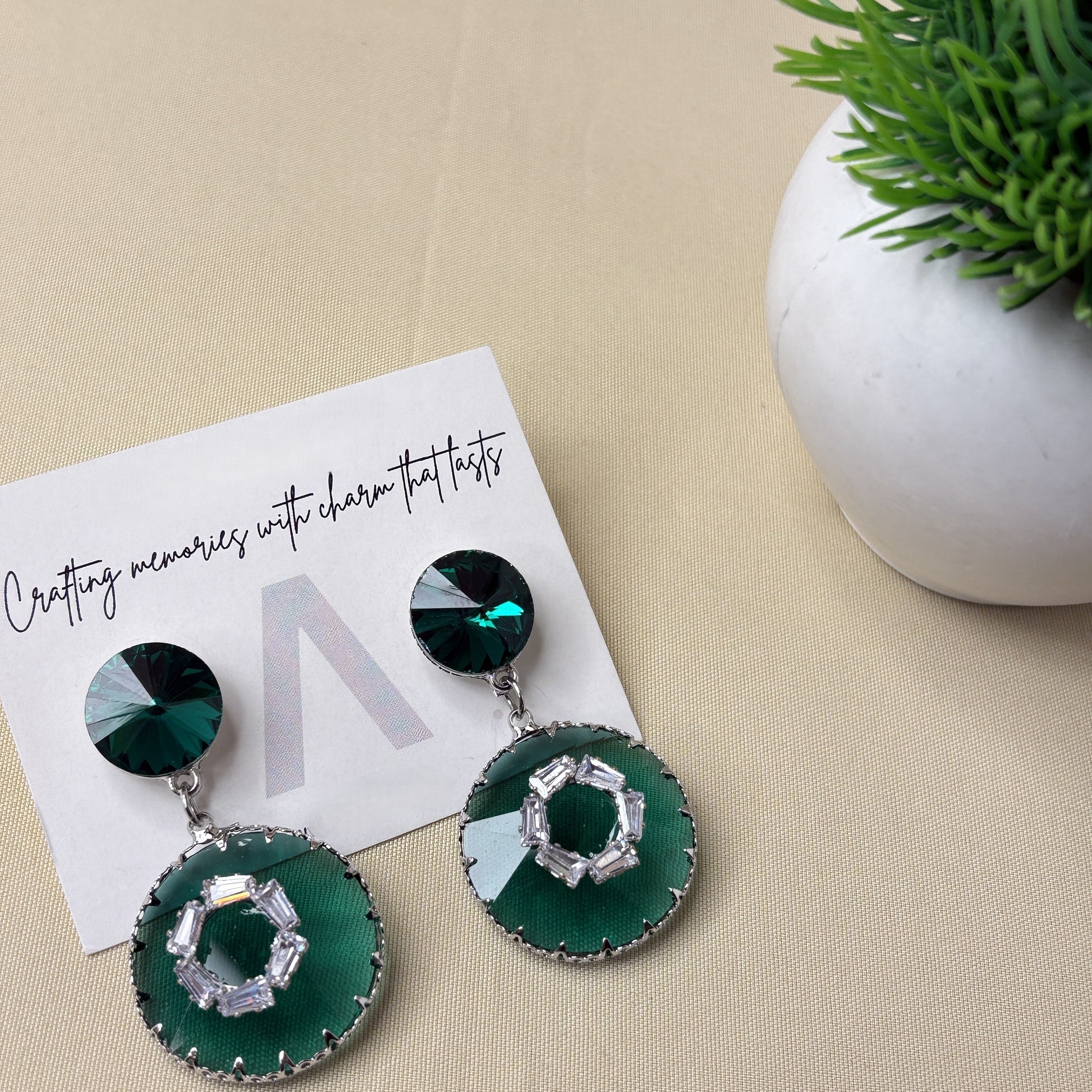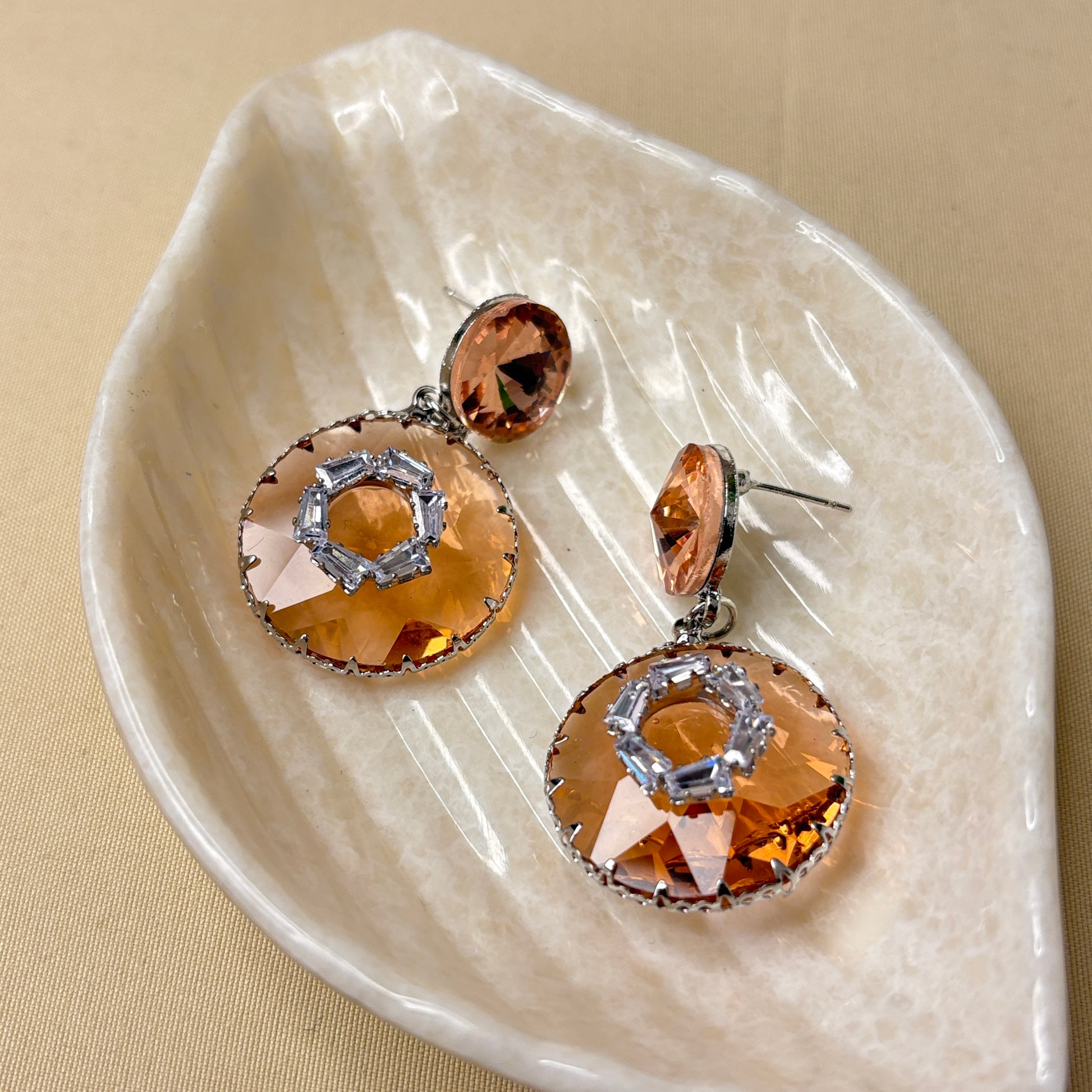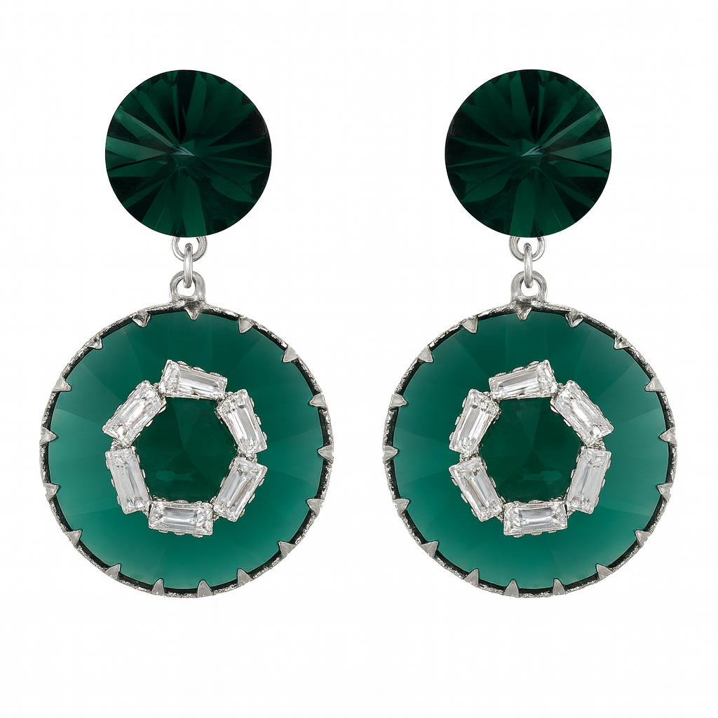 Radiating elegance, these crystal drops sparkle with brilliance, enhanced by a delicate ring of baguette-cut stones. A perfect blend of bold and classy, designed to make your evening looks unforgettable.