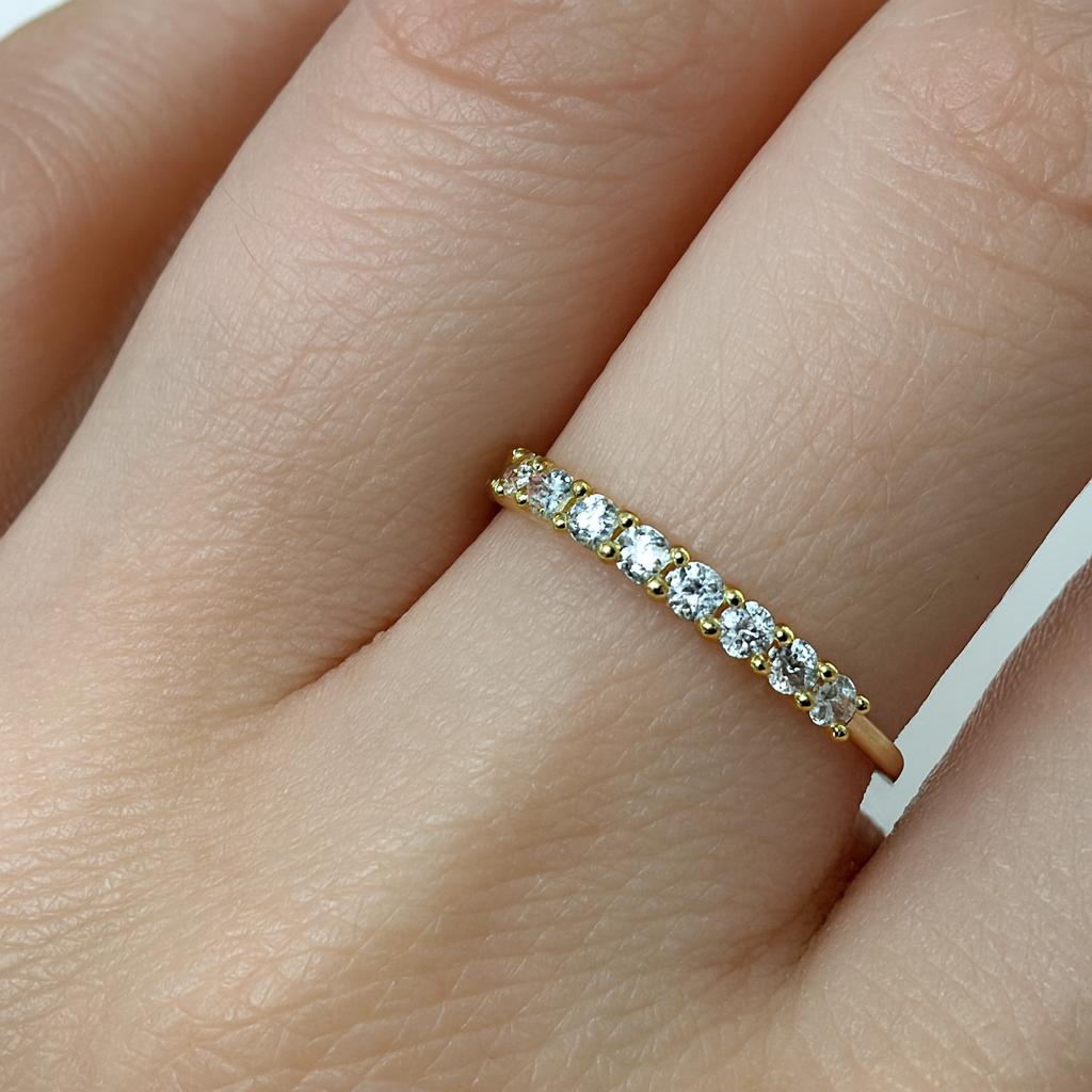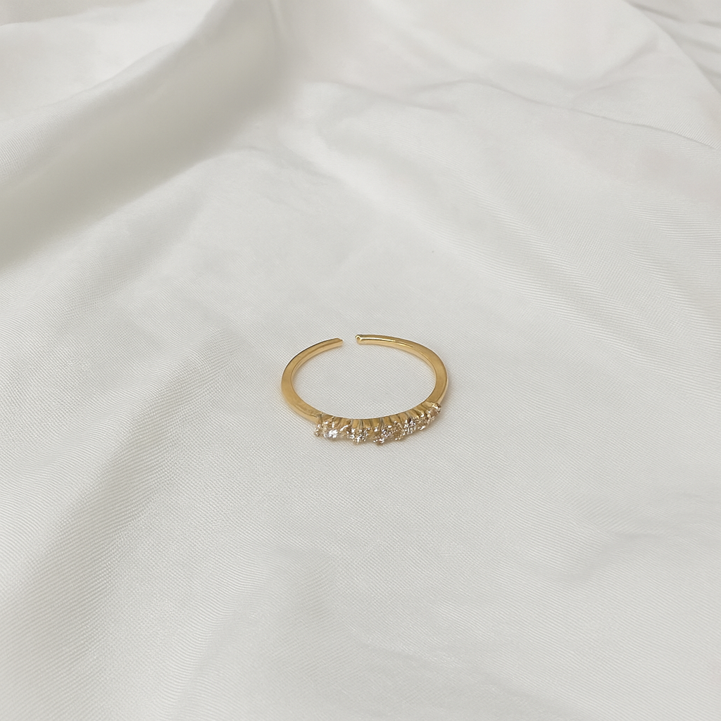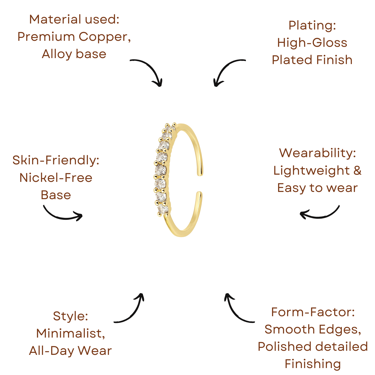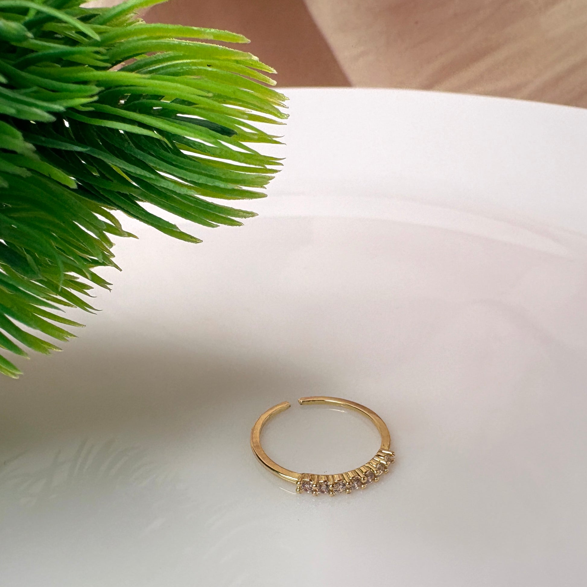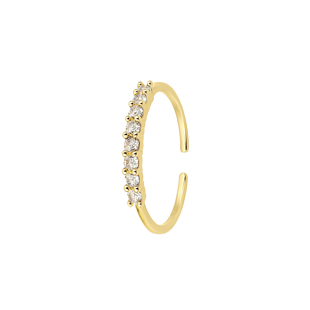 An open-band ring that captures timeless elegance — crafted in gold with a perfect row of sparkling stones. Subtle yet striking, it’s the kind of piece that quietly elevates your every look — from desk to dinner.