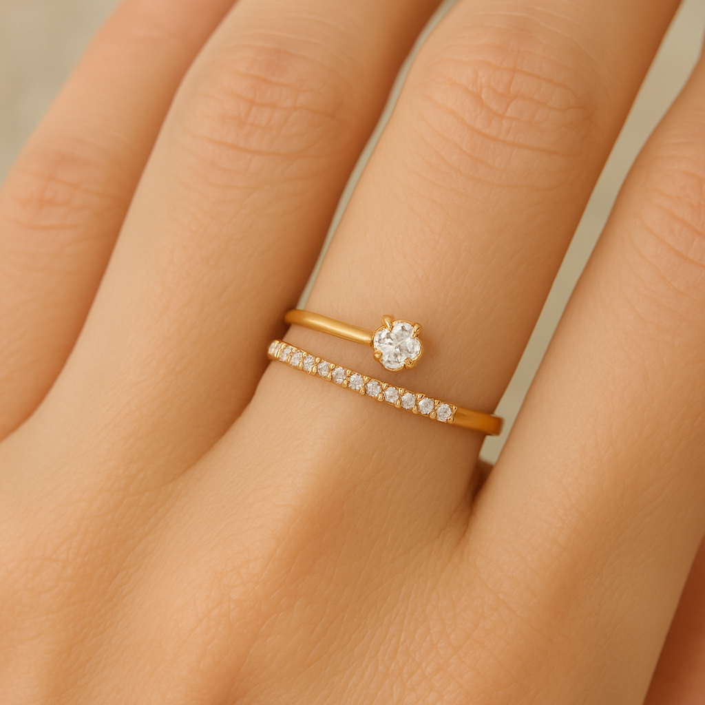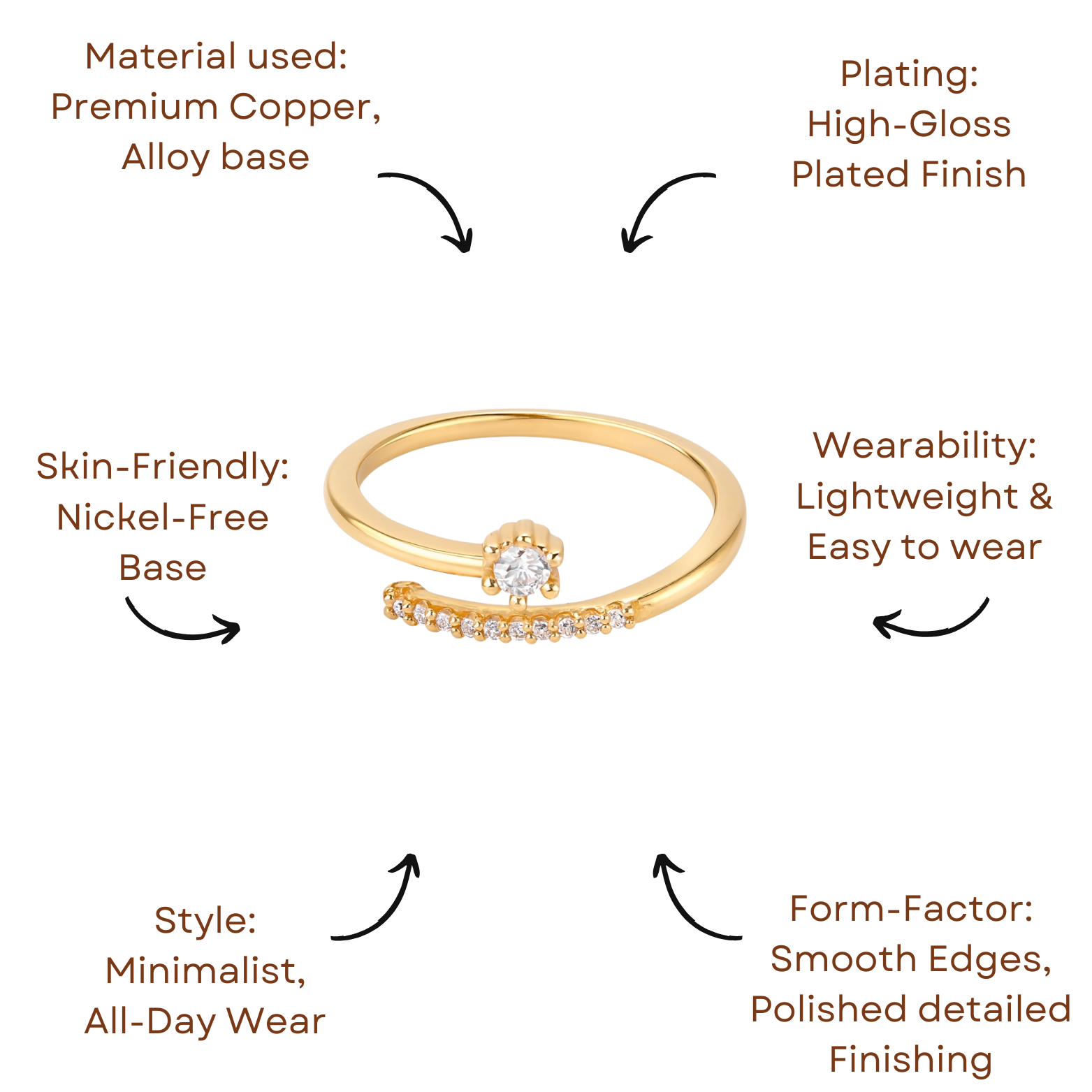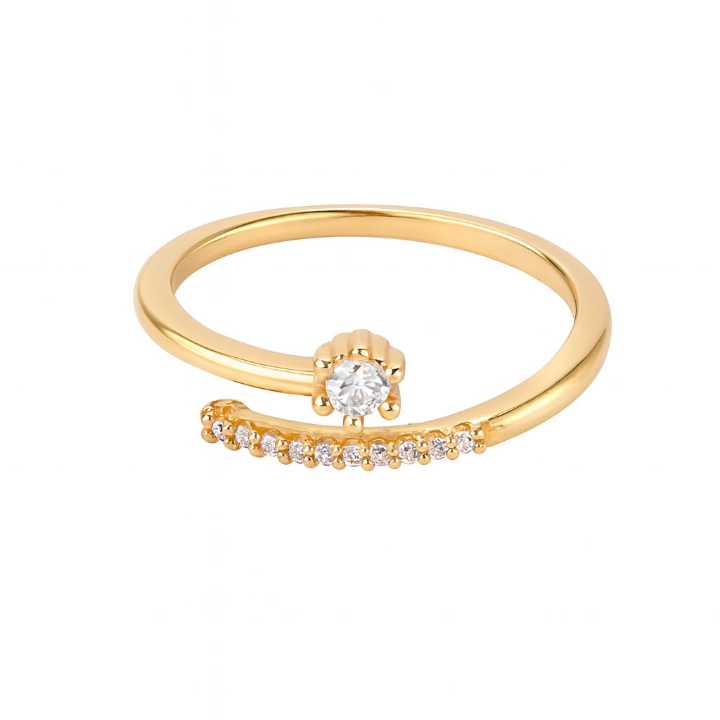 A minimal open band with a sparkling solitaire and a delicate line of crystals, giving a chic and modern finish. Perfect for stacking or wearing solo for a subtle statement.