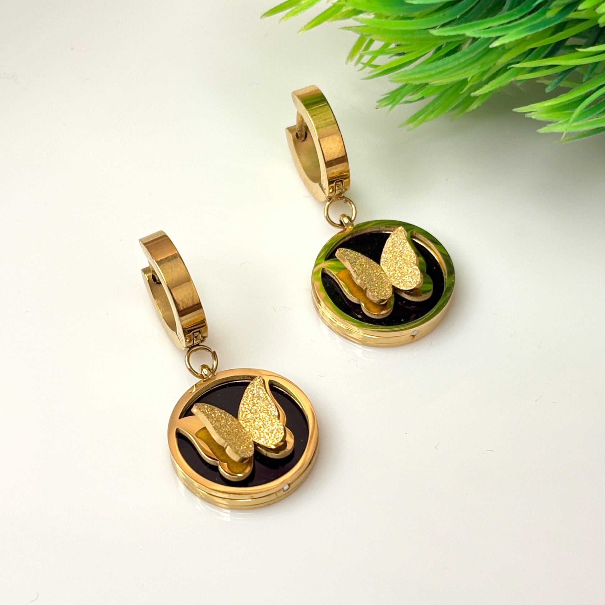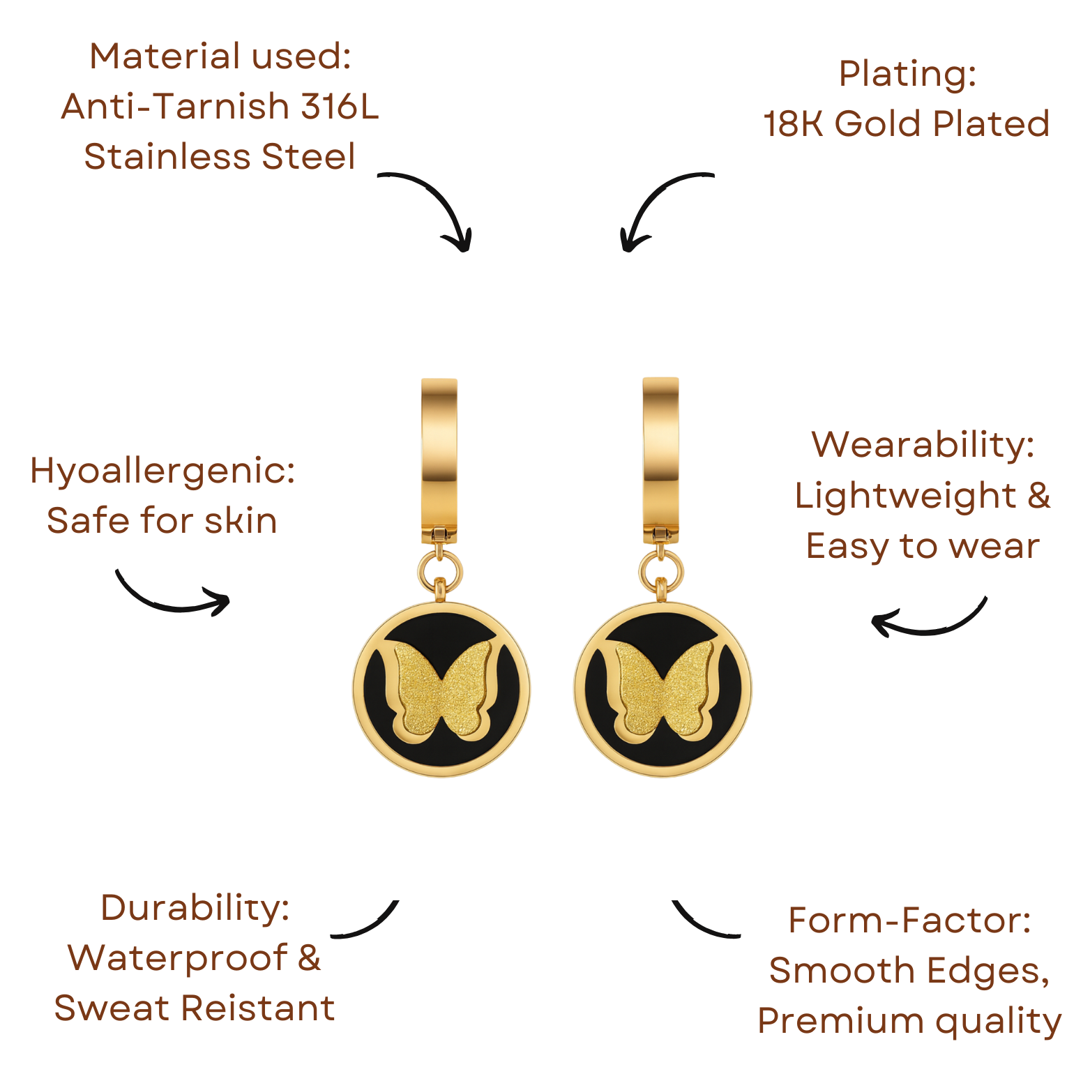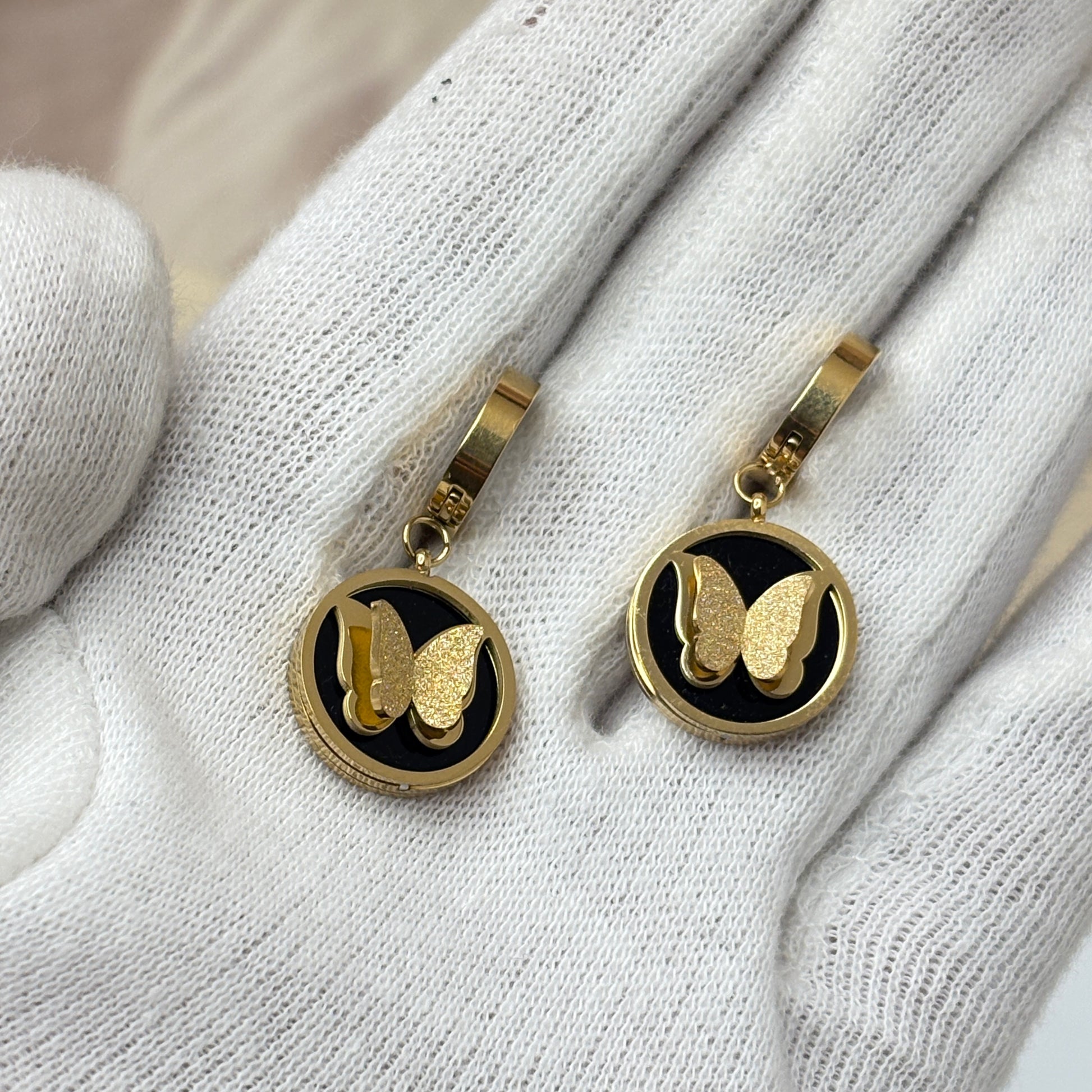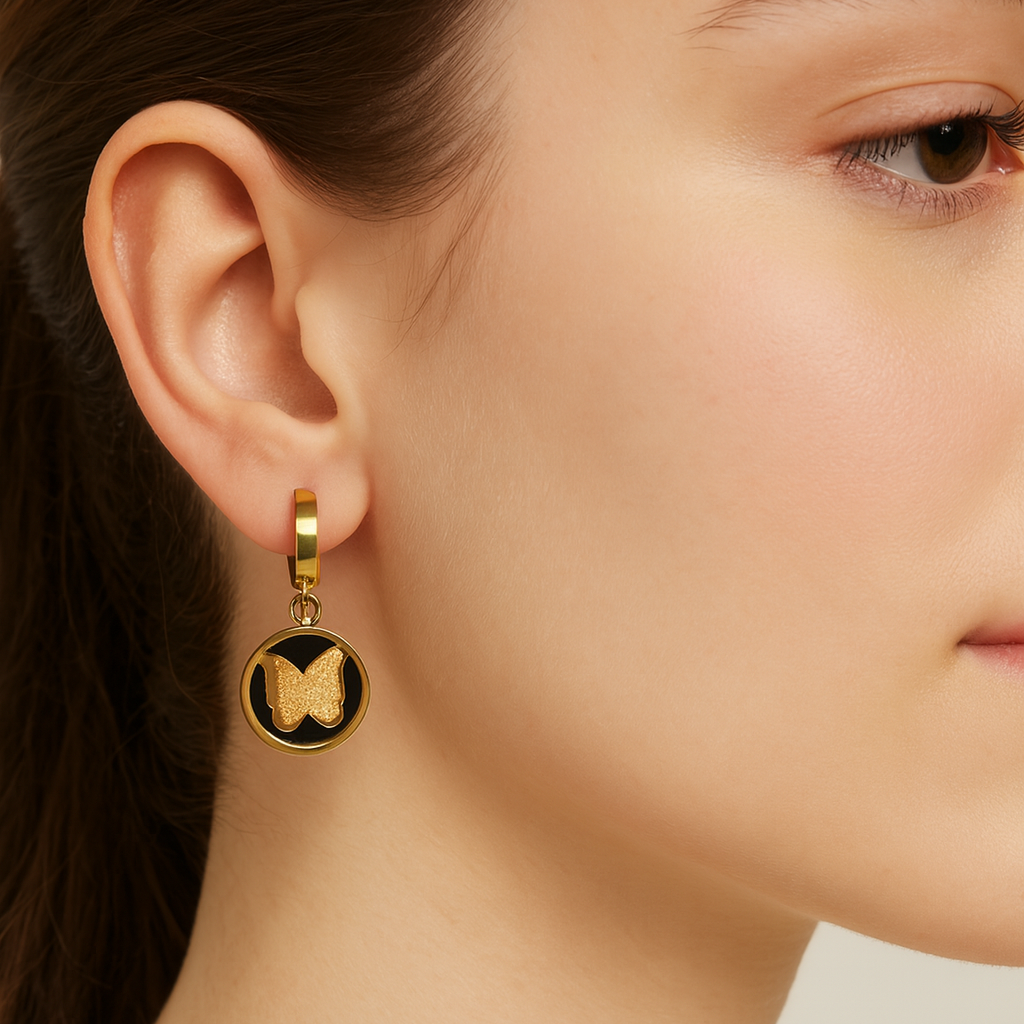 Grace meets mystery in this golden beauty — a shimmering butterfly set against a deep black enamel base. Its elegant contrast and soft sparkle capture the charm of transformation and freedom.