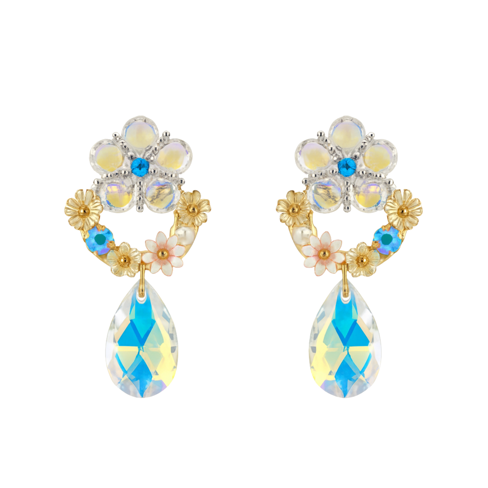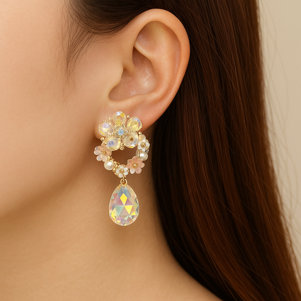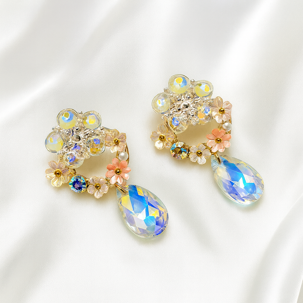 Whimsical floral hoops adorned with iridescent crystals, pastel blossoms, and a sparkling teardrop charm. A dreamy, fairy-tale accessory for weddings, parties, or any magical moment.