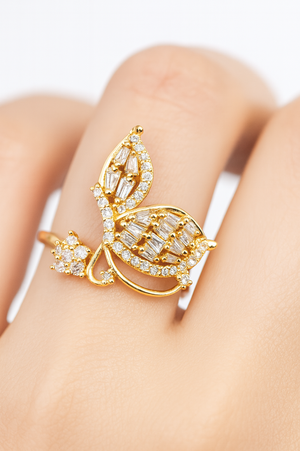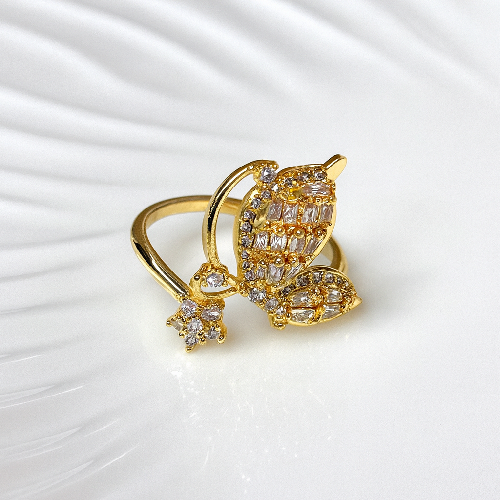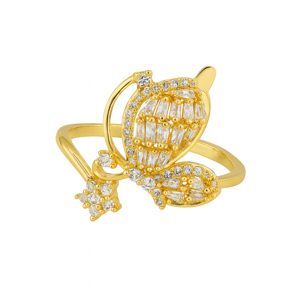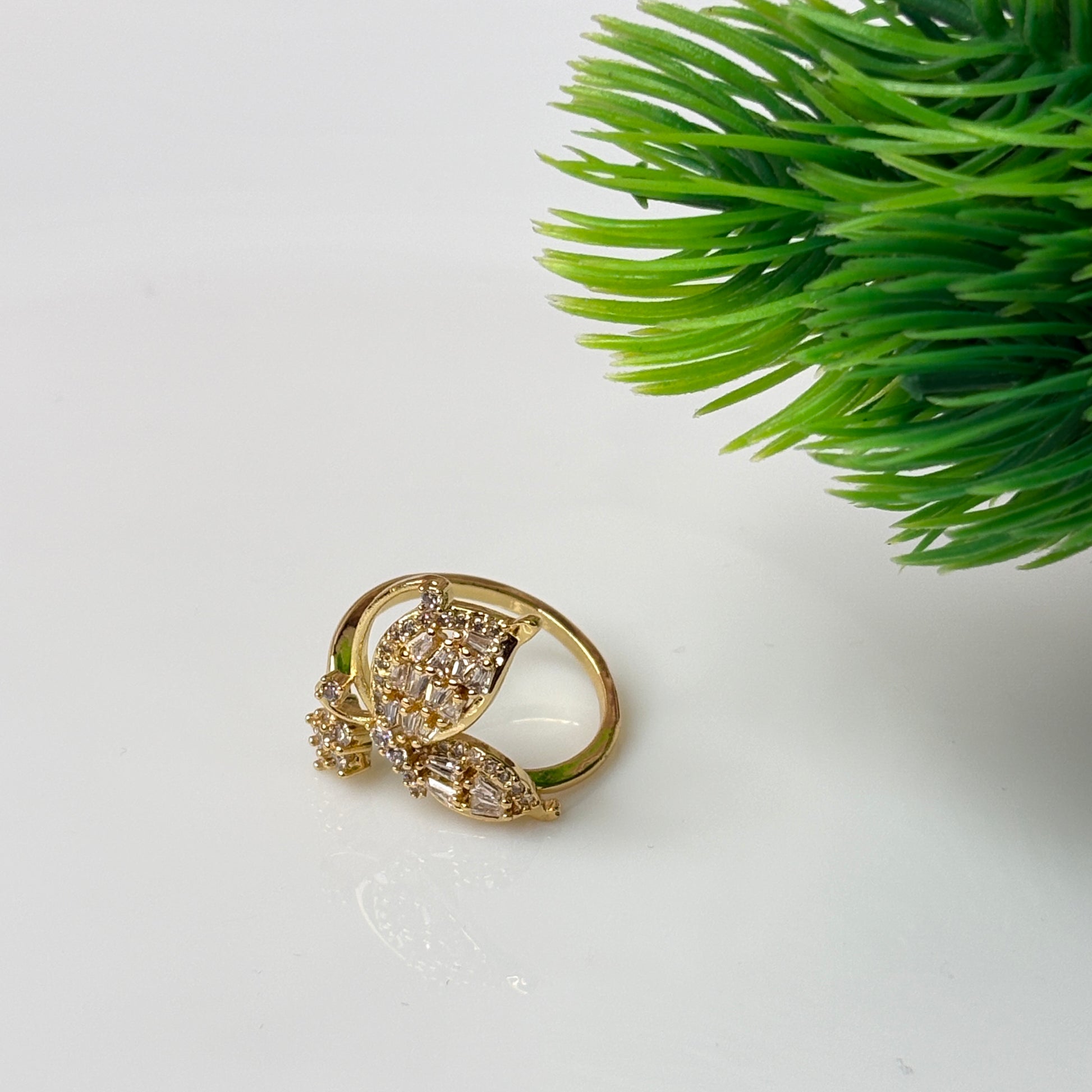A masterpiece of elegance, the Glimmerleaf Ring features twin leaf motifs gracefully intertwined in a radiant gold band. Each leaf is adorned with baguette-cut zircons framed by delicate round stones, creating a dazzling play of light. Perfect for those who love sophistication with a touch of nature’s charm.