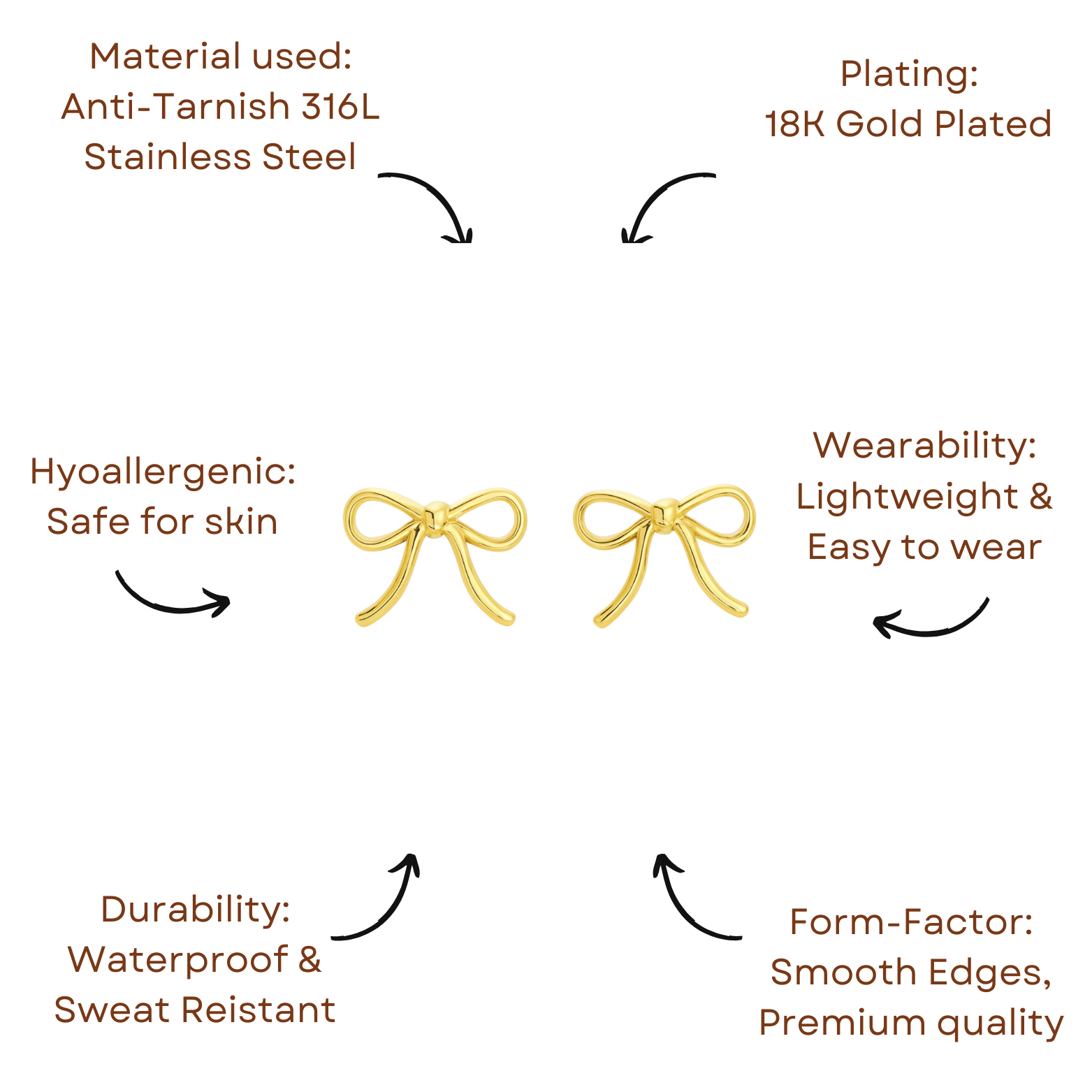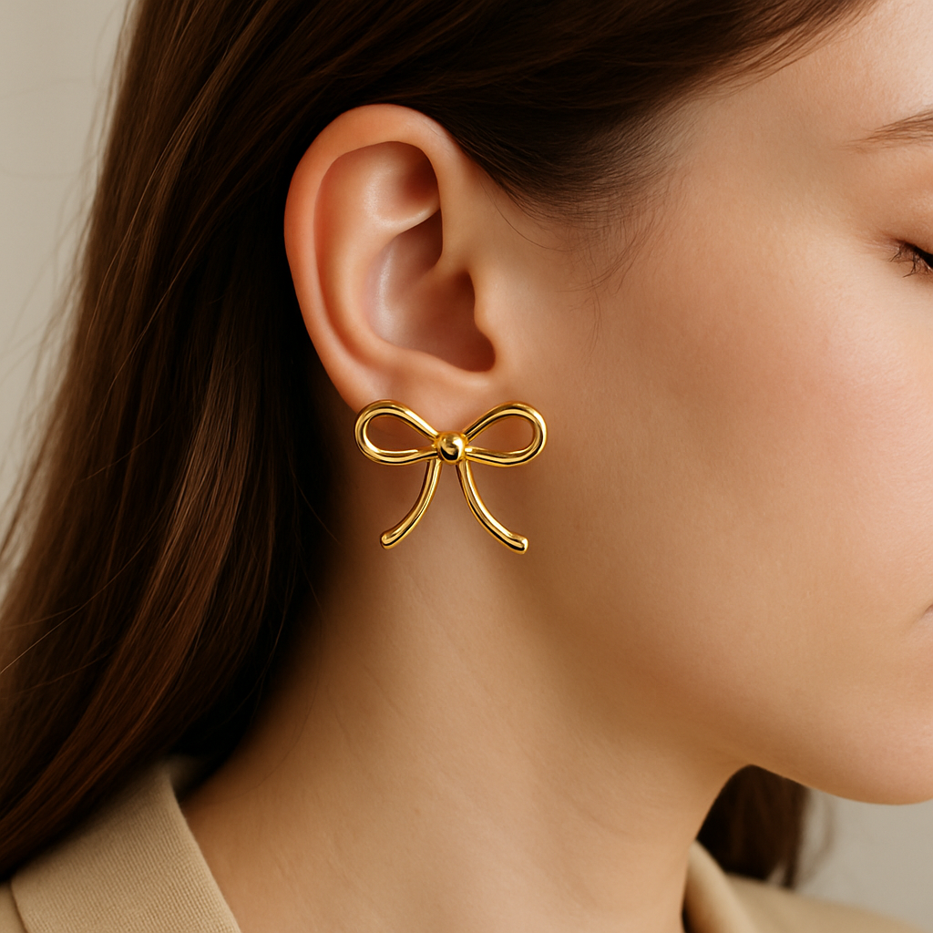 These chic bow-shaped studs bring a playful yet elegant charm to your look. Crafted in polished gold-tone finish, they add just the right touch of femininity and sophistication. Perfect for everyday wear or to dress up a minimal outfit with a hint of cuteness.