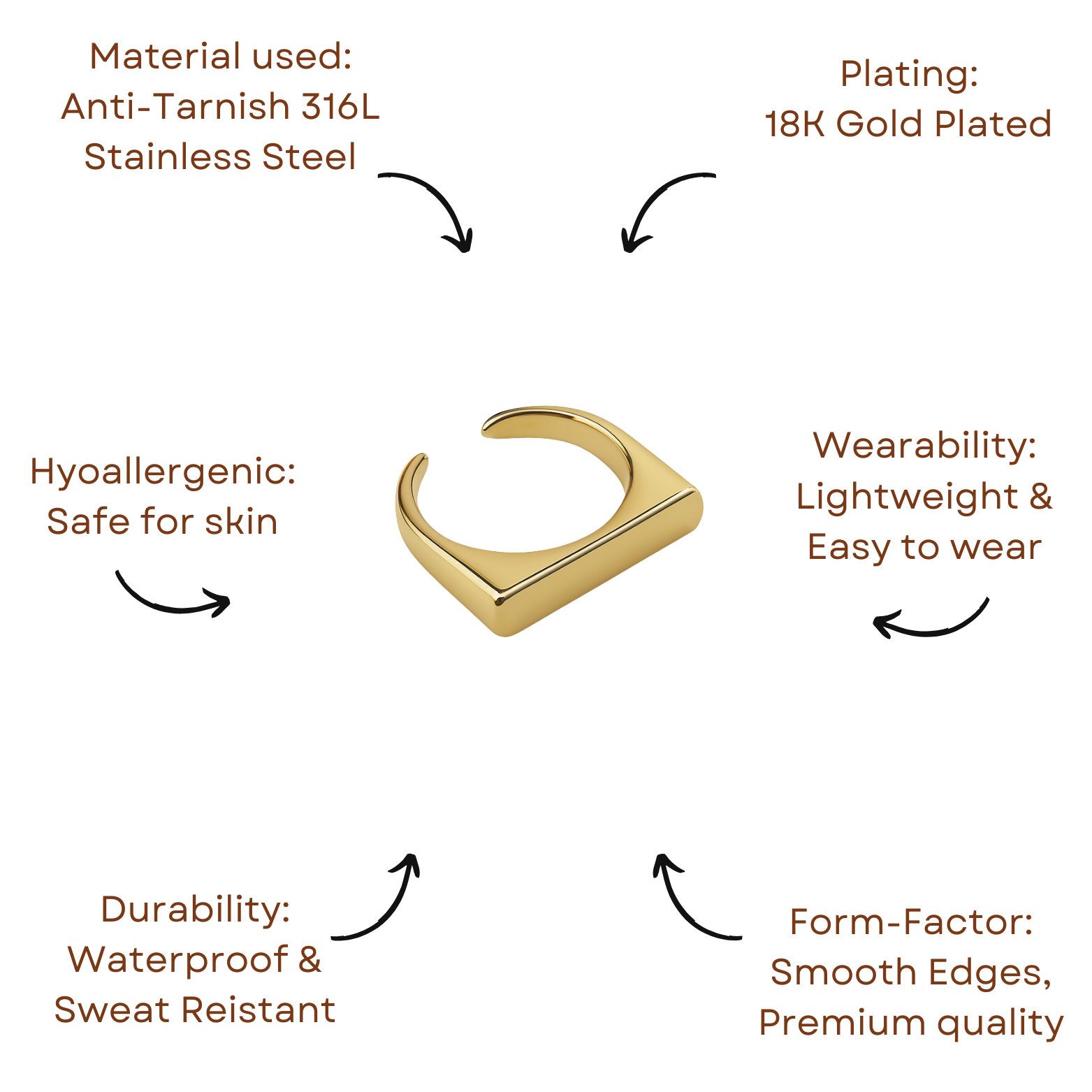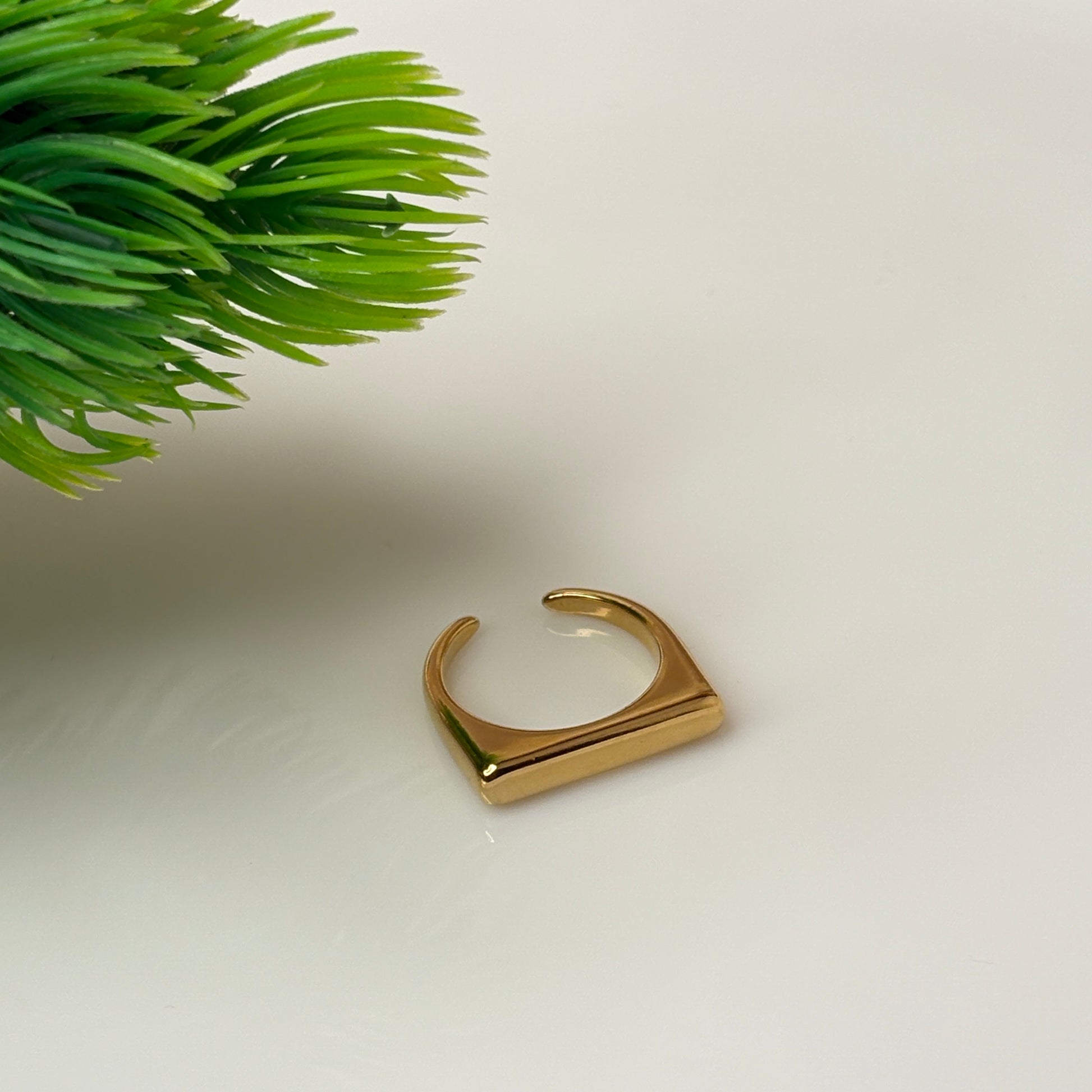 A statement of pure geometry — this sleek, square-edged gold ring blends minimalism with bold artistry. Its sculpted form and open design make it a modern classic, perfect for those who wear confidence like an accessory.
