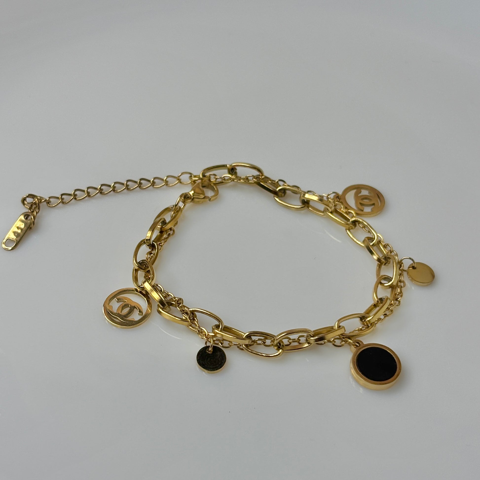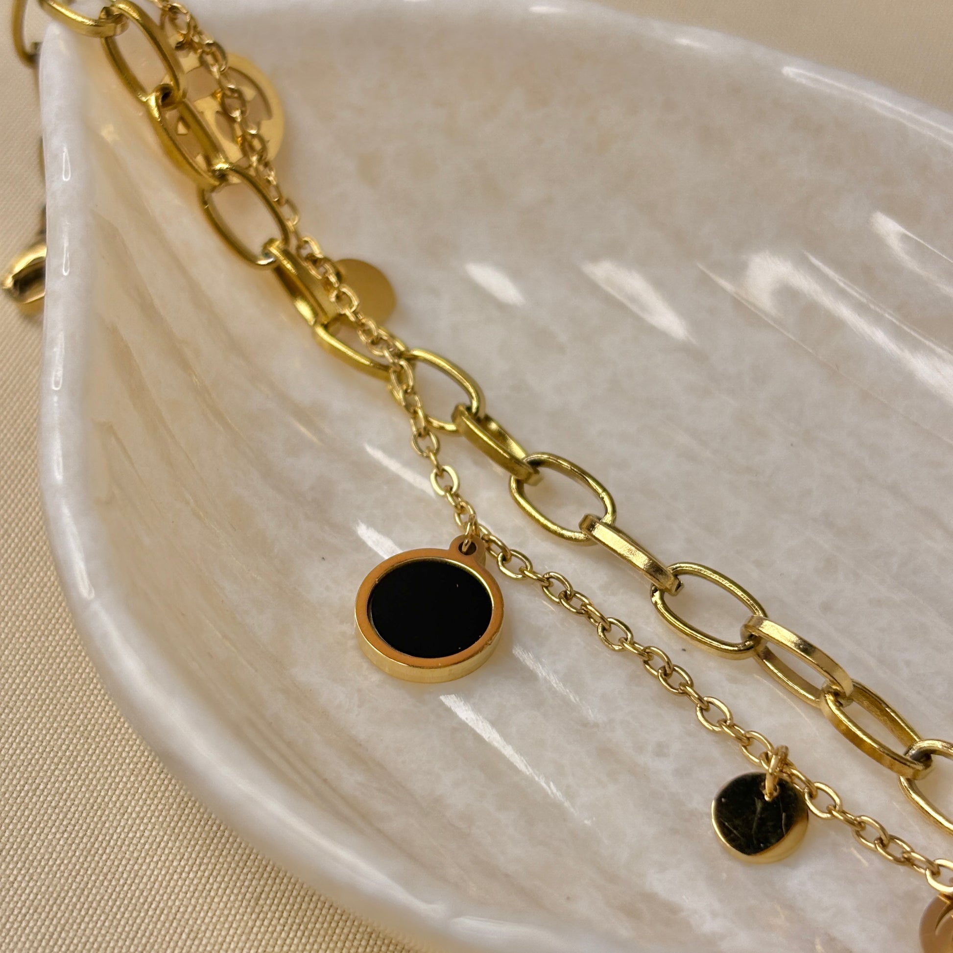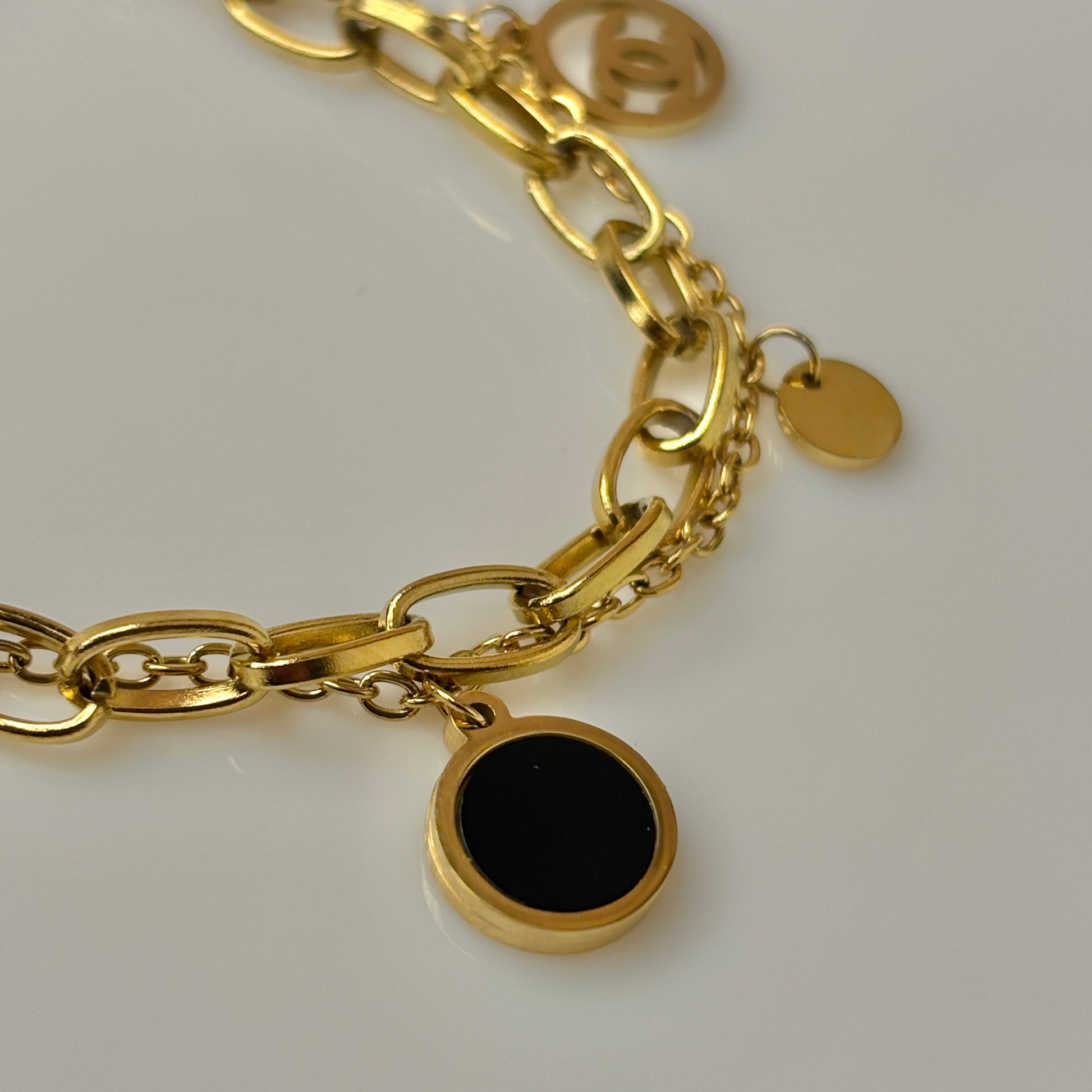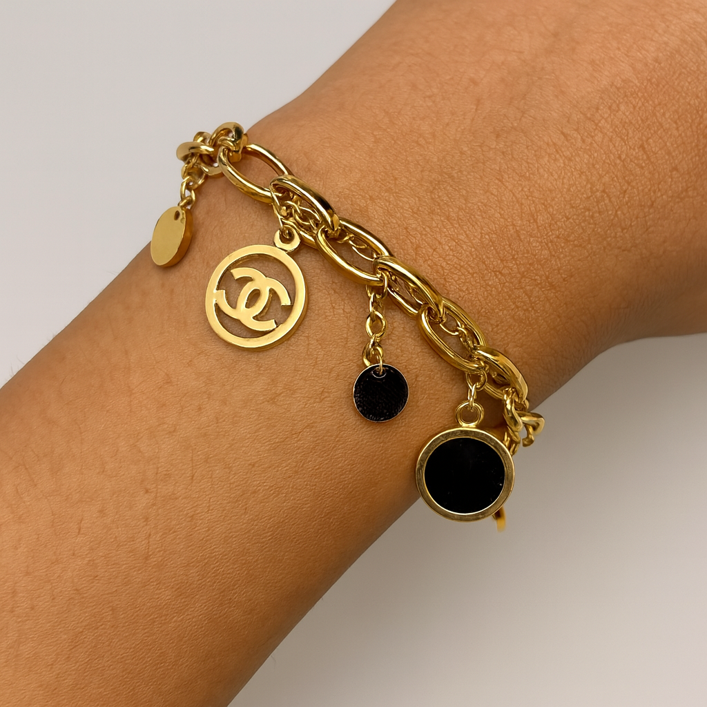 A chic gold-toned chain adorned with elegant dangling charms, blending modern style with timeless luxury. The perfect statement piece to elevate both casual and dressy looks.