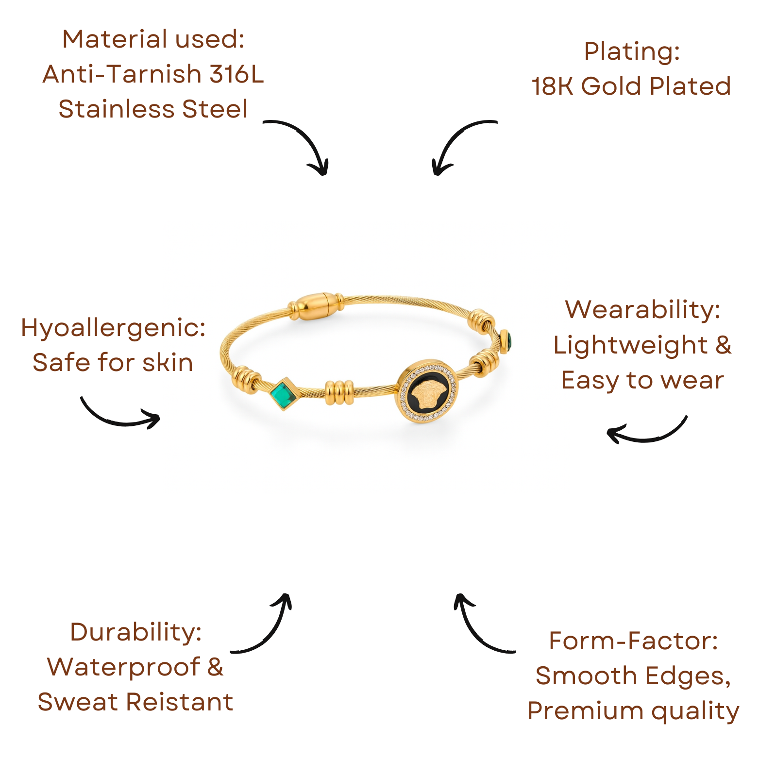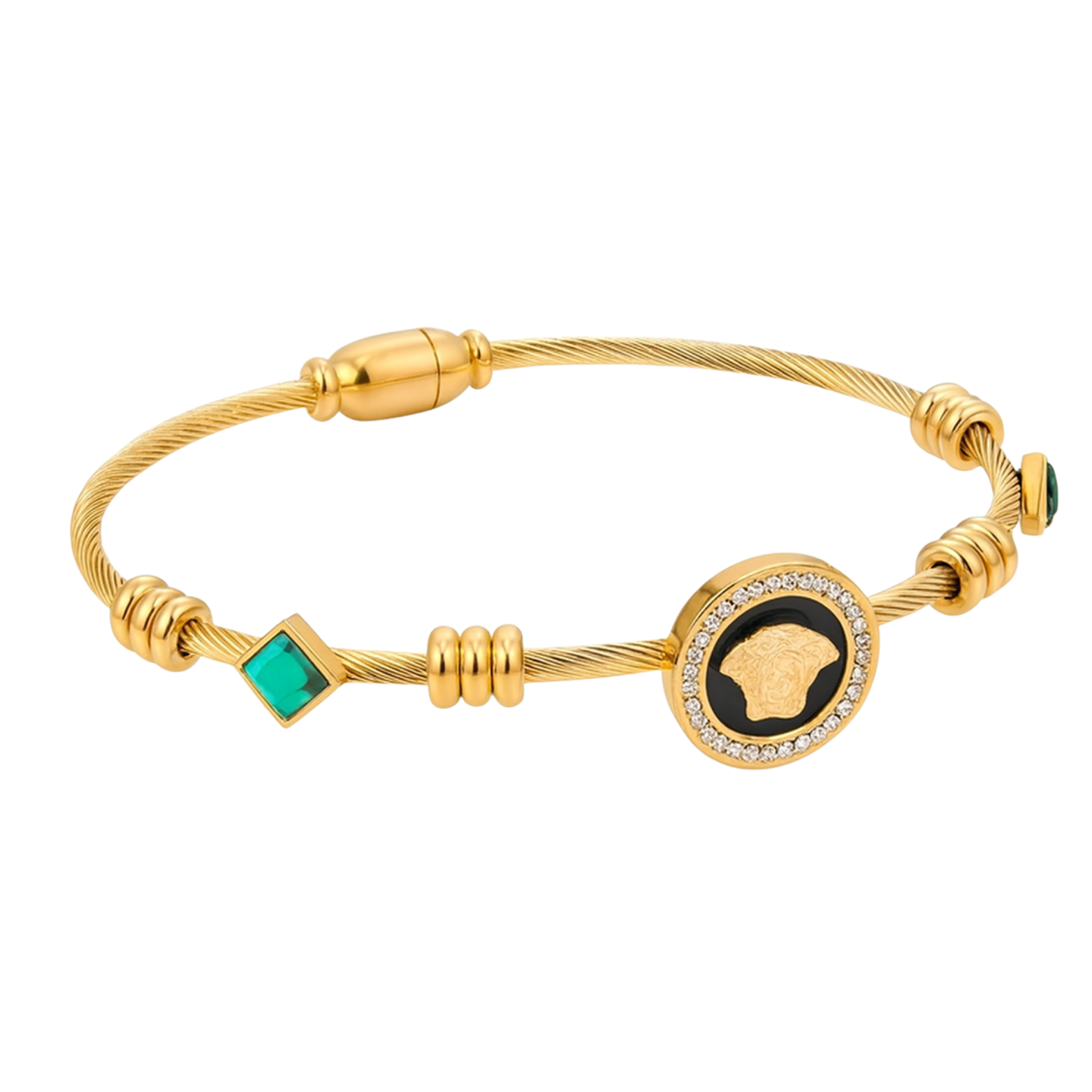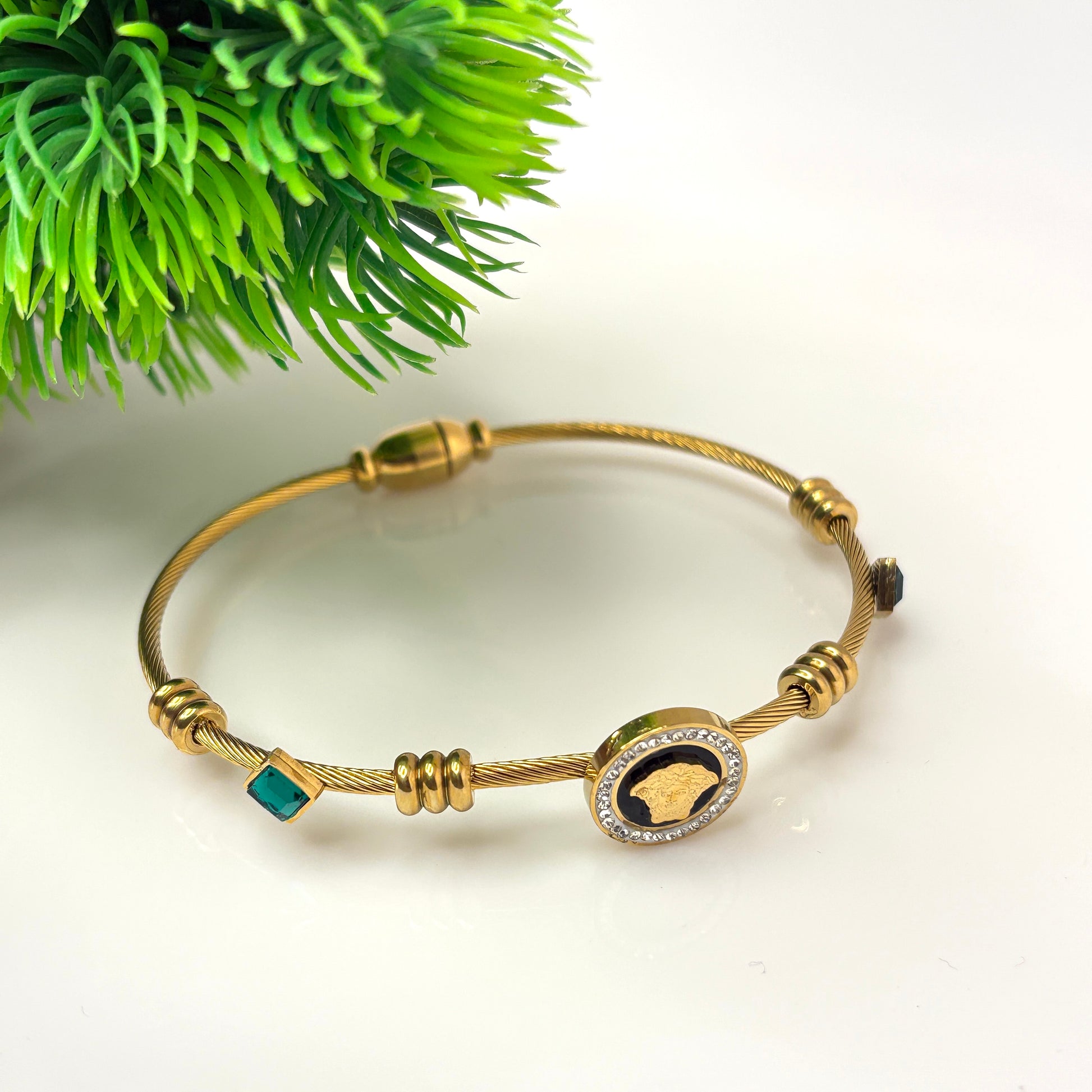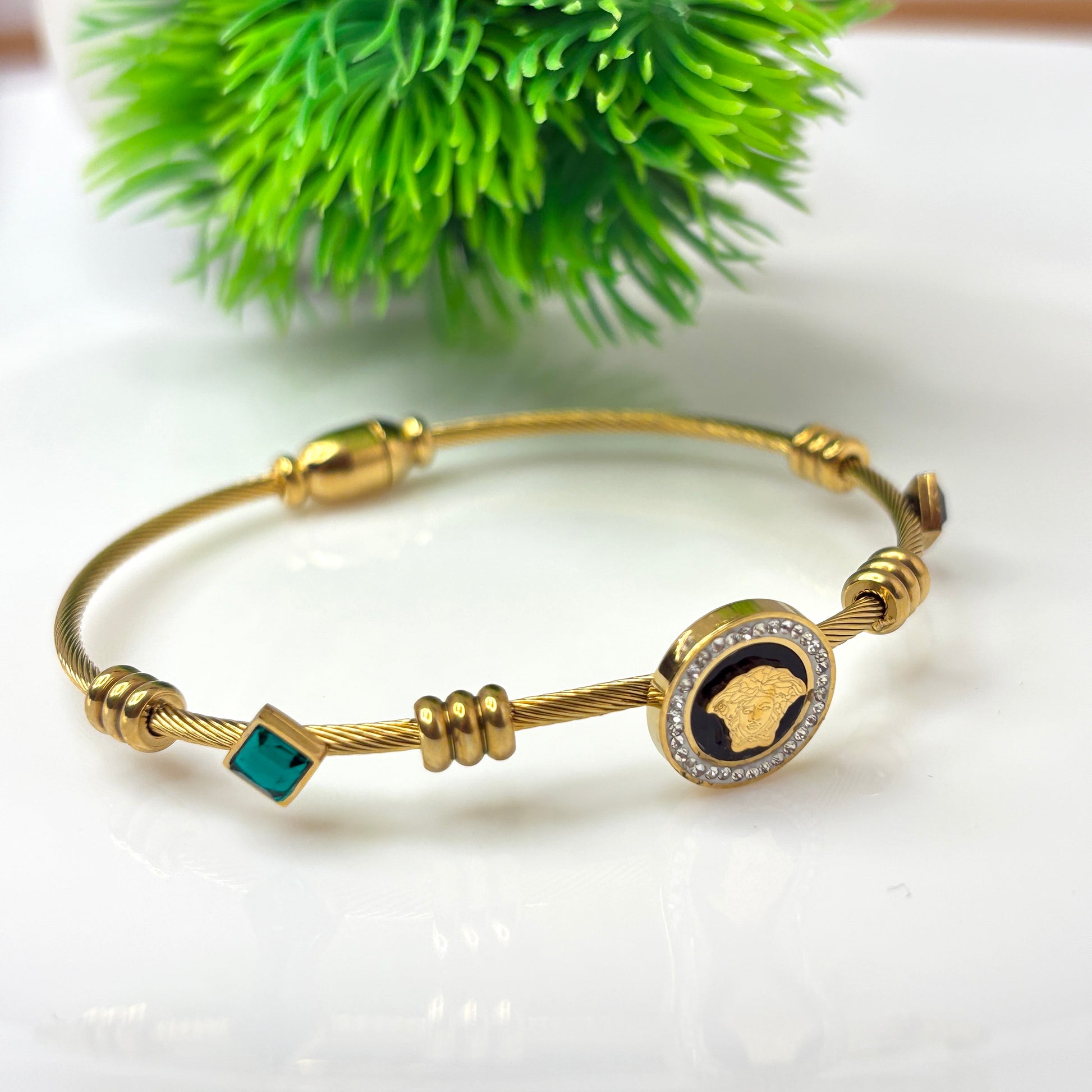 Exude power and elegance with this luxury cable bracelet. Featuring a striking emerald-green stone and a bold Medusa charm surrounded by shimmering crystals, it adds a touch of sophistication to any outfit. Lightweight yet premium, it’s perfect for stacking or wearing as a statement piece on its own.
