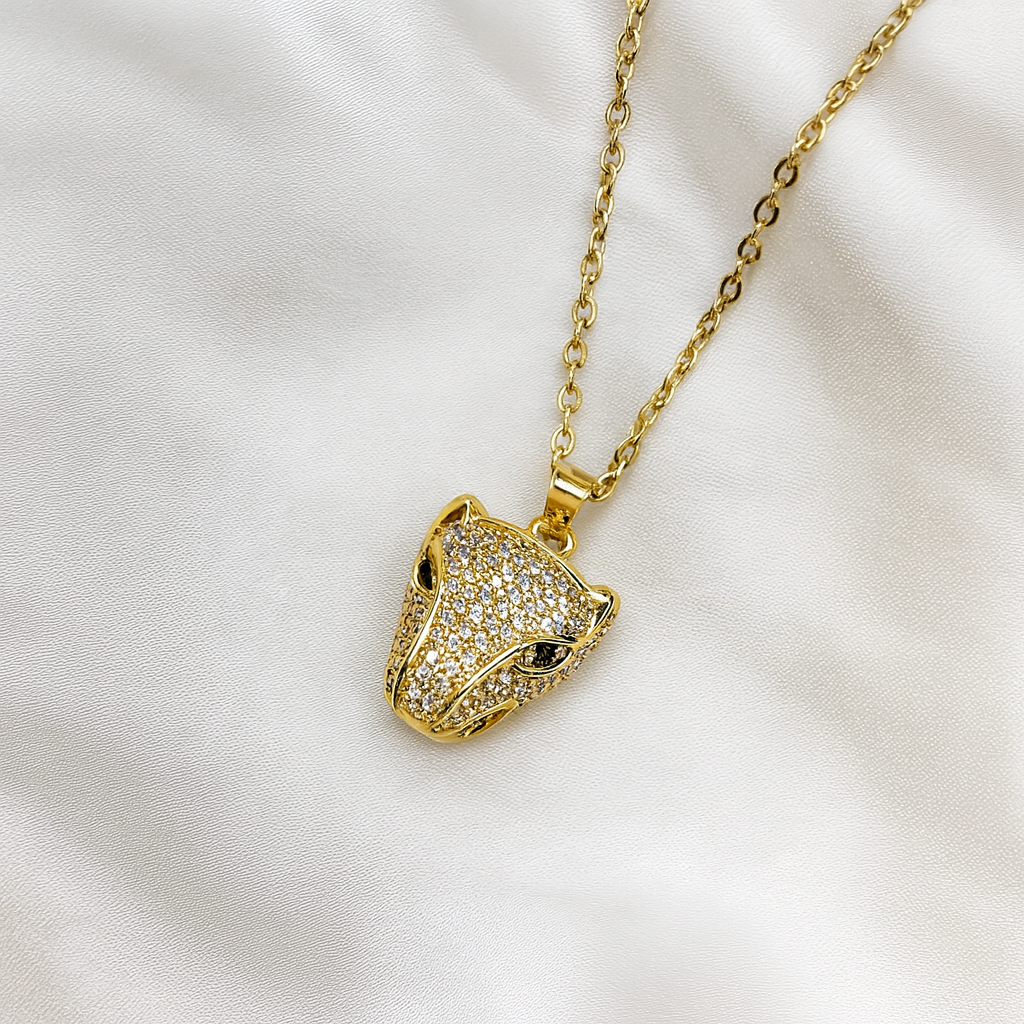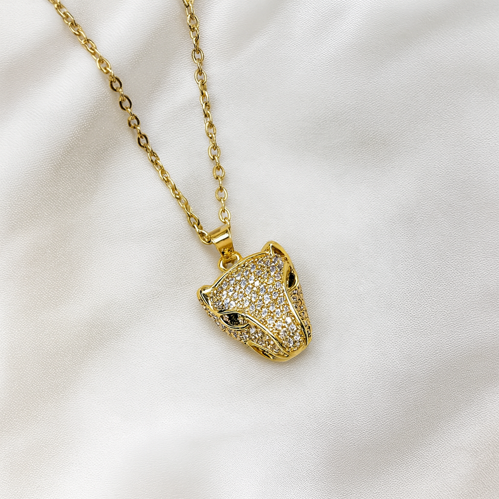 Embrace bold sophistication with this gold-toned panther head pendant, intricately encrusted with sparkling stones. A symbol of strength and grace, it makes the perfect statement piece for any occasion.