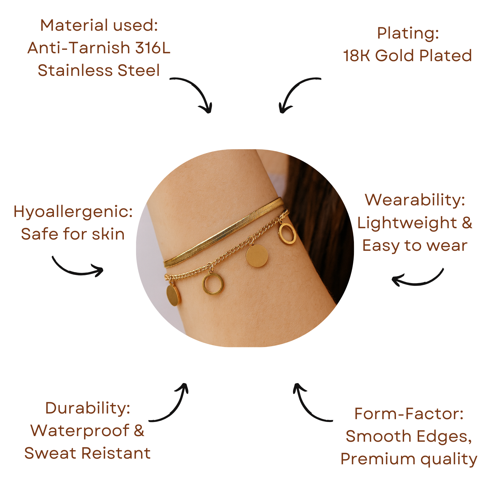 A minimal dual-layer bracelet featuring sleek gold discs and circles for a chic, geometric look. Perfect for stacking or wearing solo for a touch of everyday elegance.