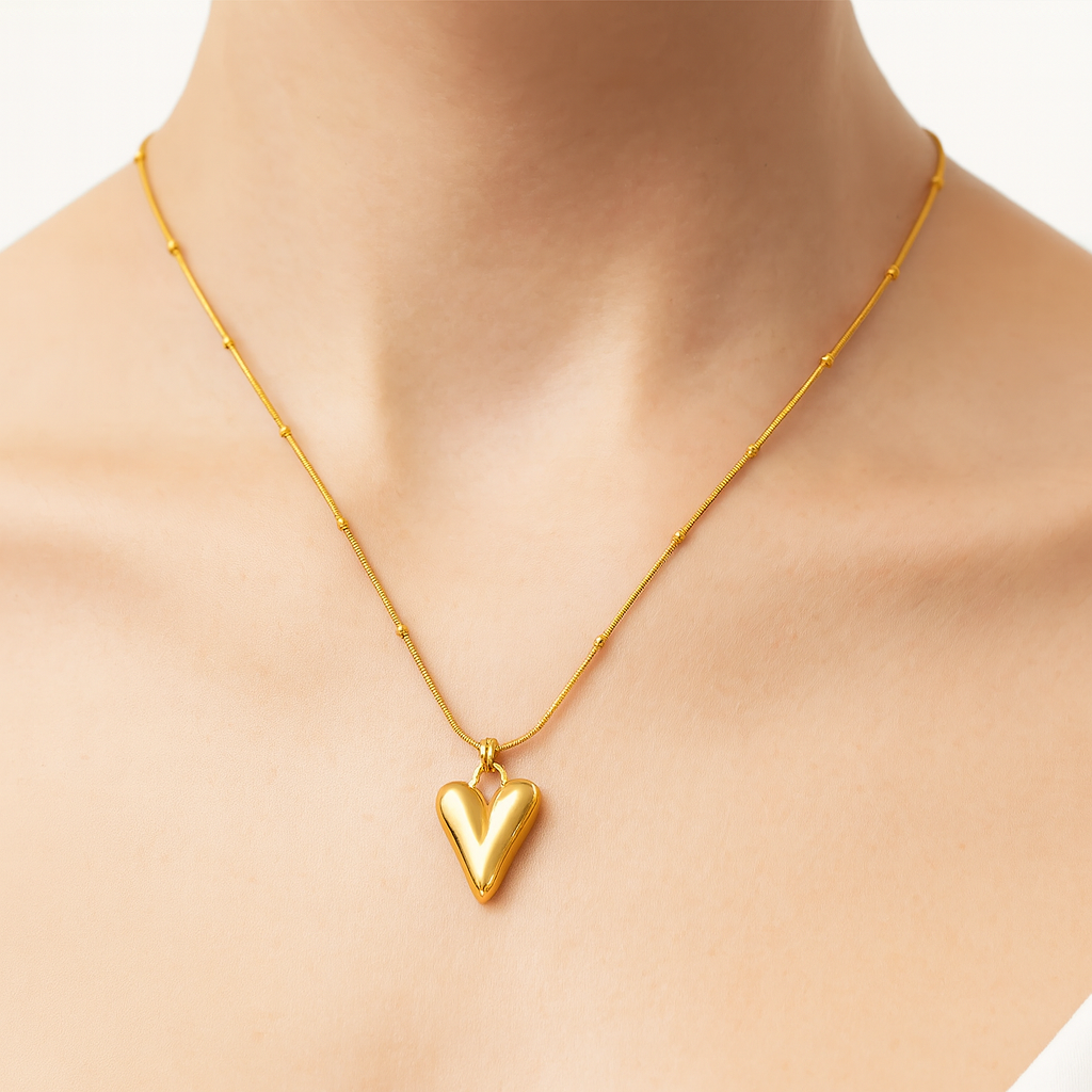 A sleek heart pendant resting on a refined chain, designed to embody love and timeless beauty. Perfect for adding a touch of grace to both everyday wear and special moments.