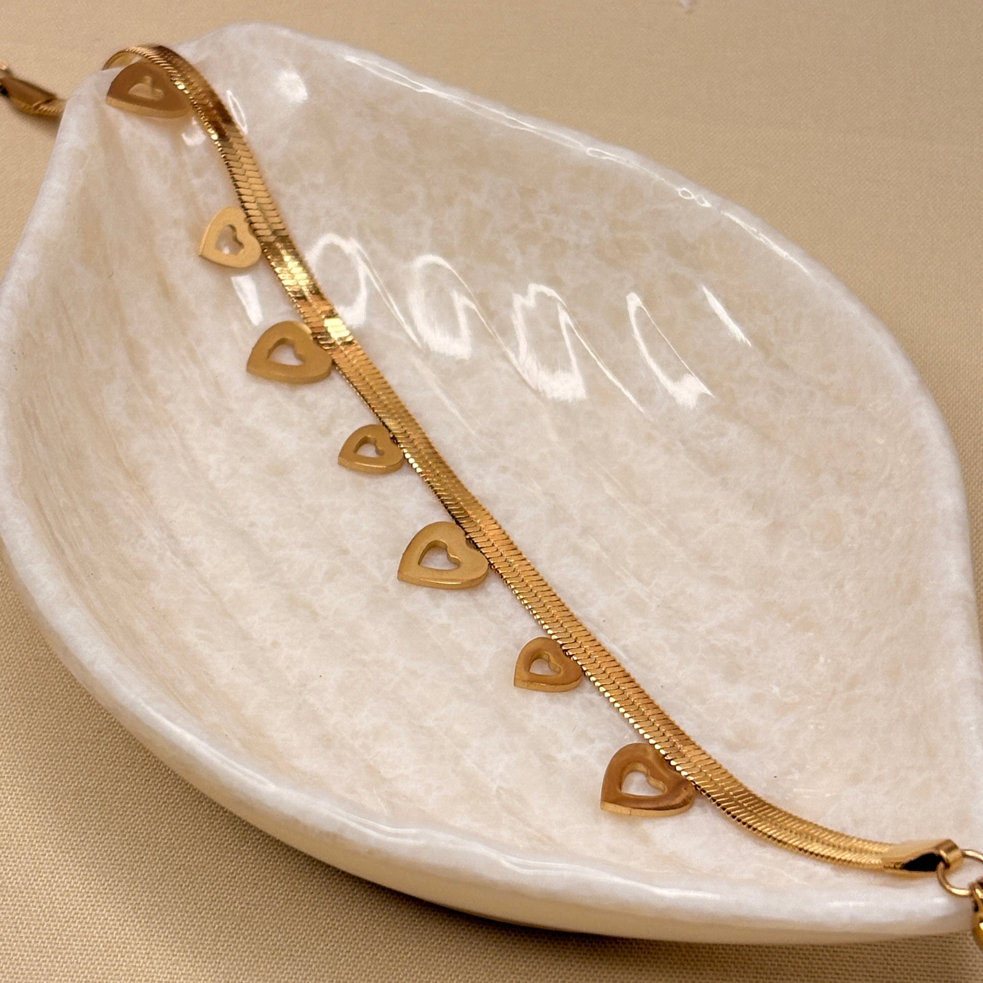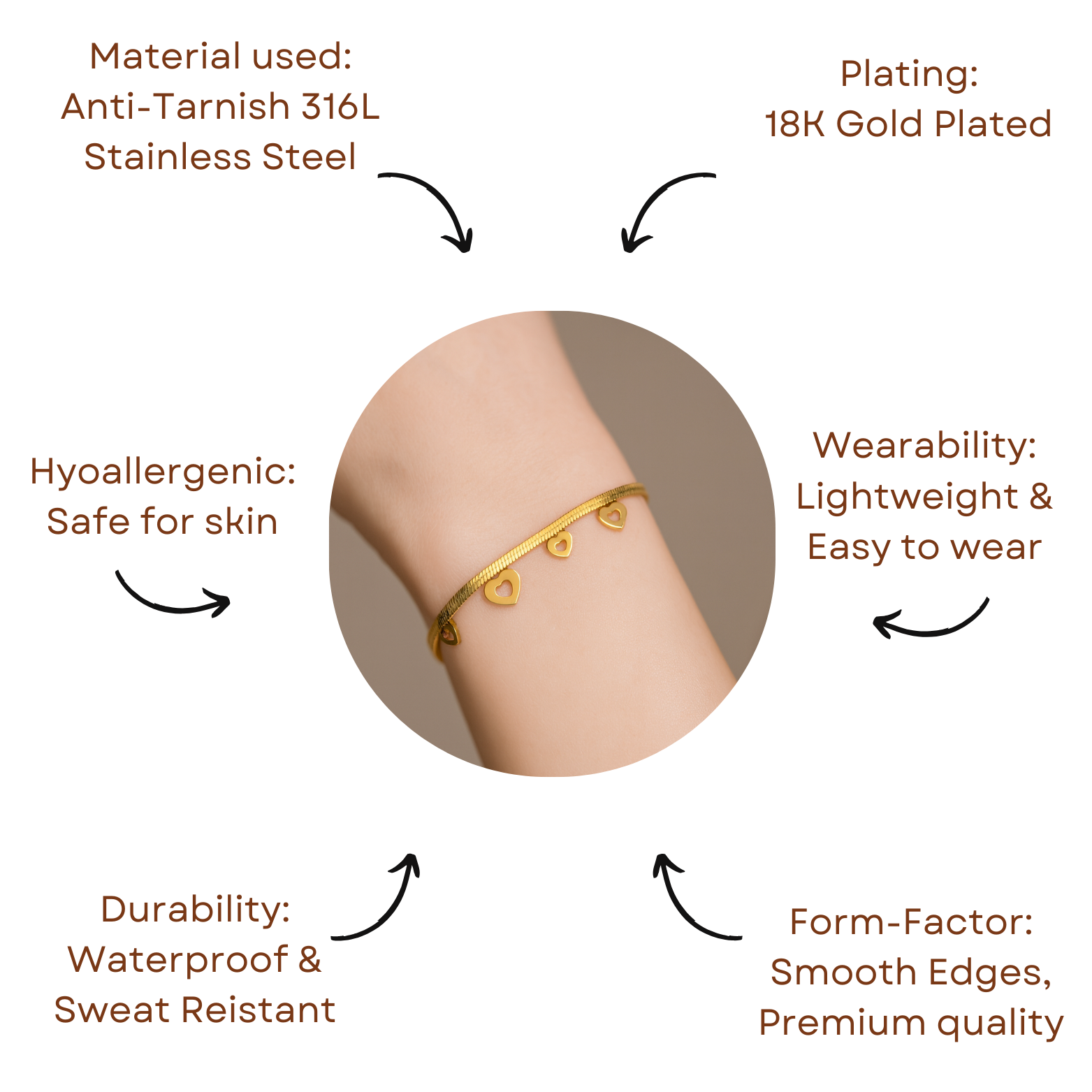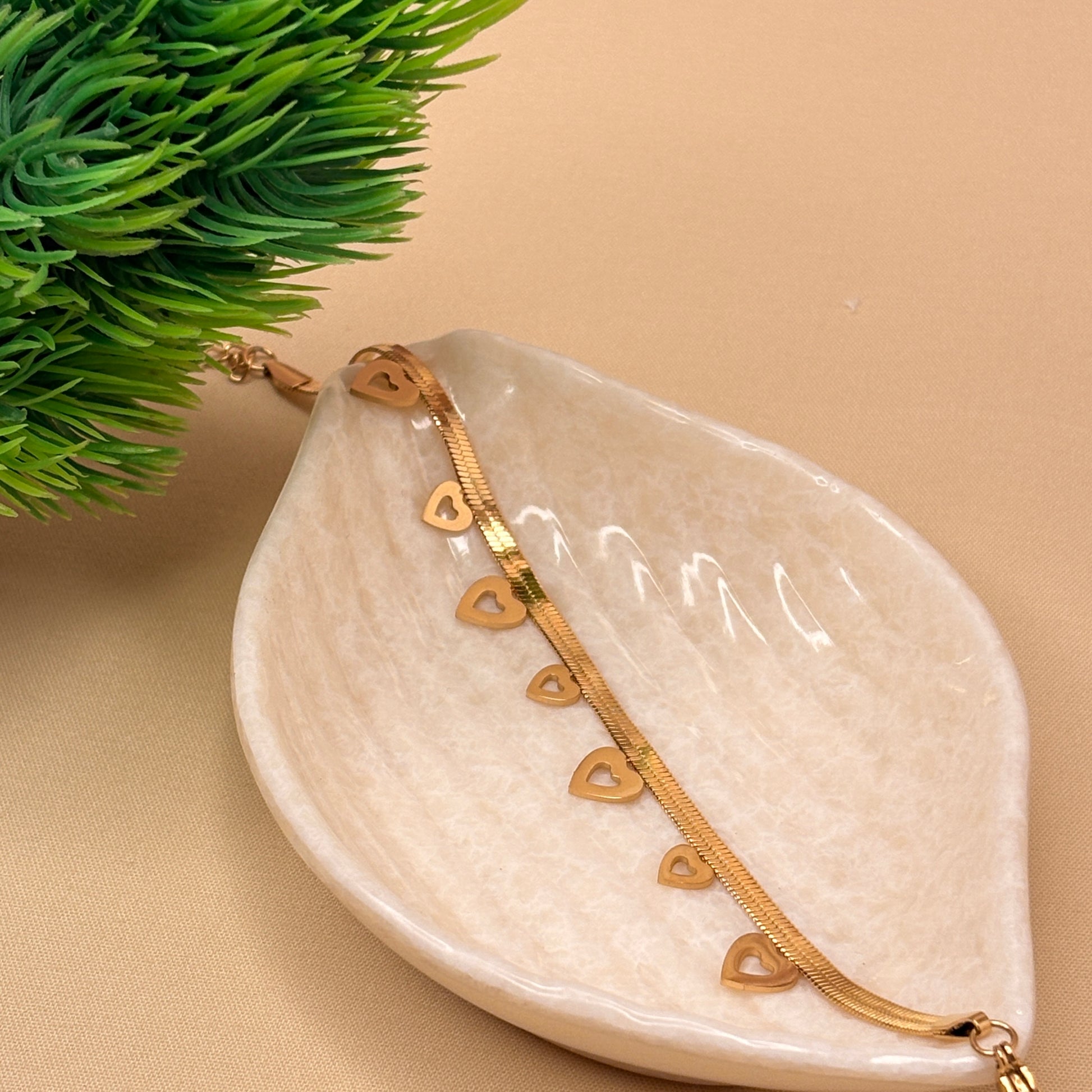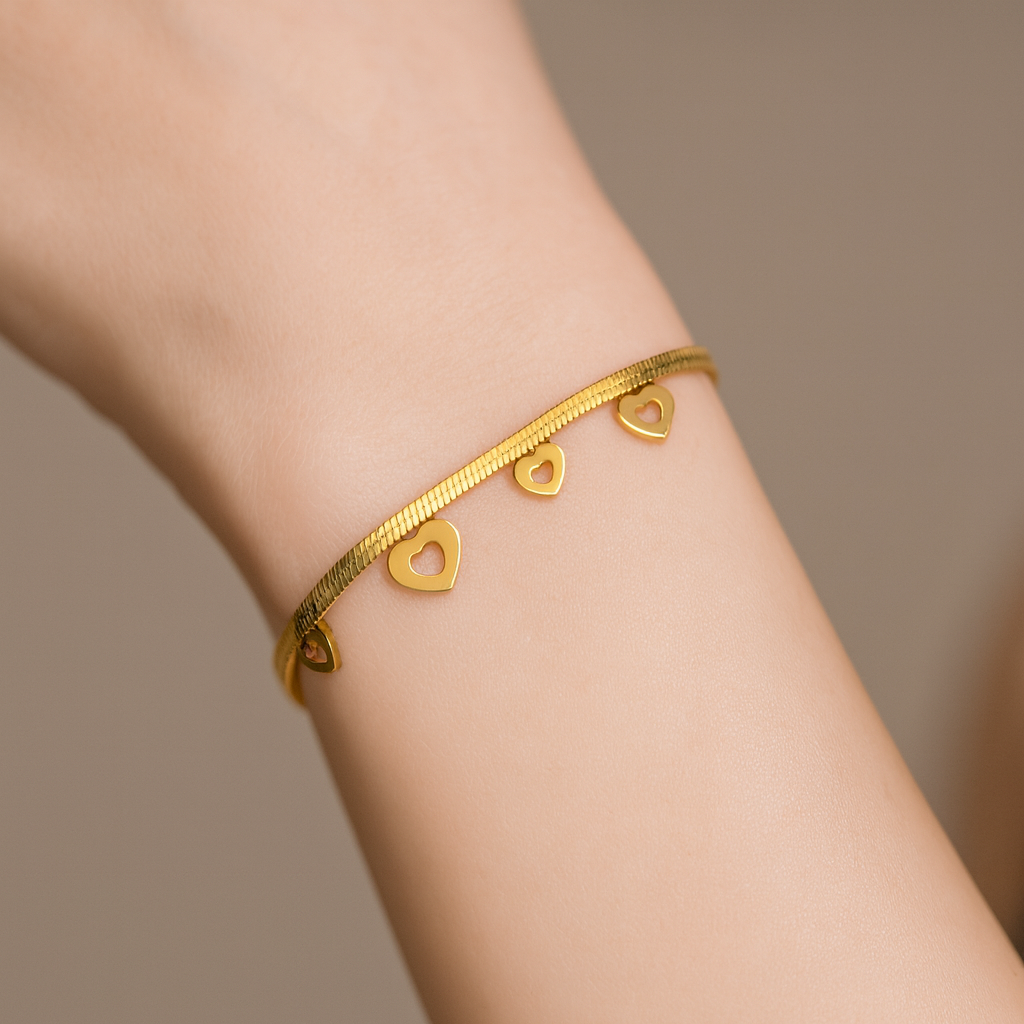 A delicate fusion of love and style, this gold-toned piece features a sleek chain adorned with open-heart charms. Its soft shimmer and graceful rhythm make it the perfect accent for everyday elegance.