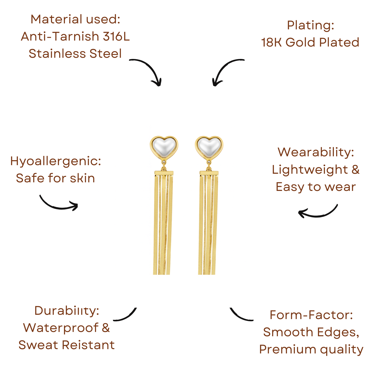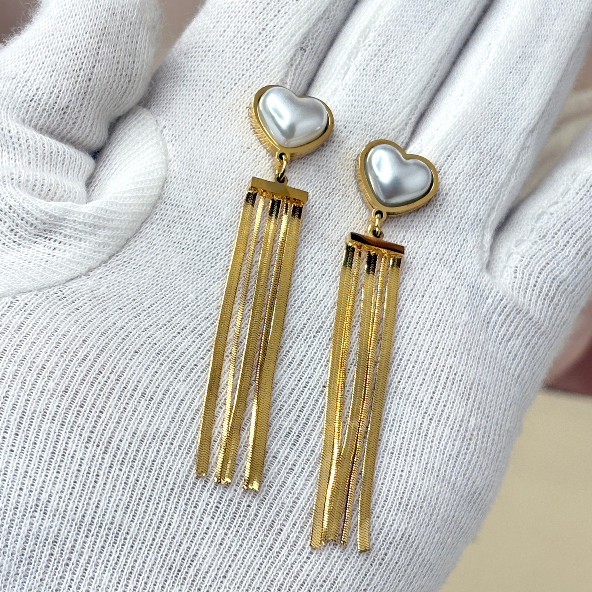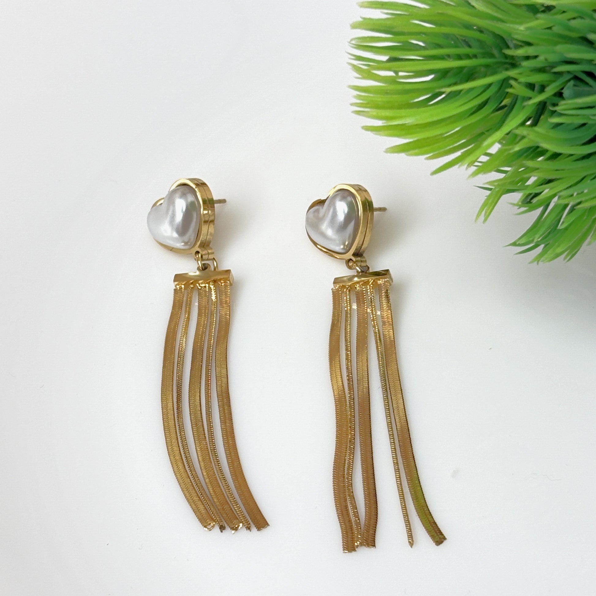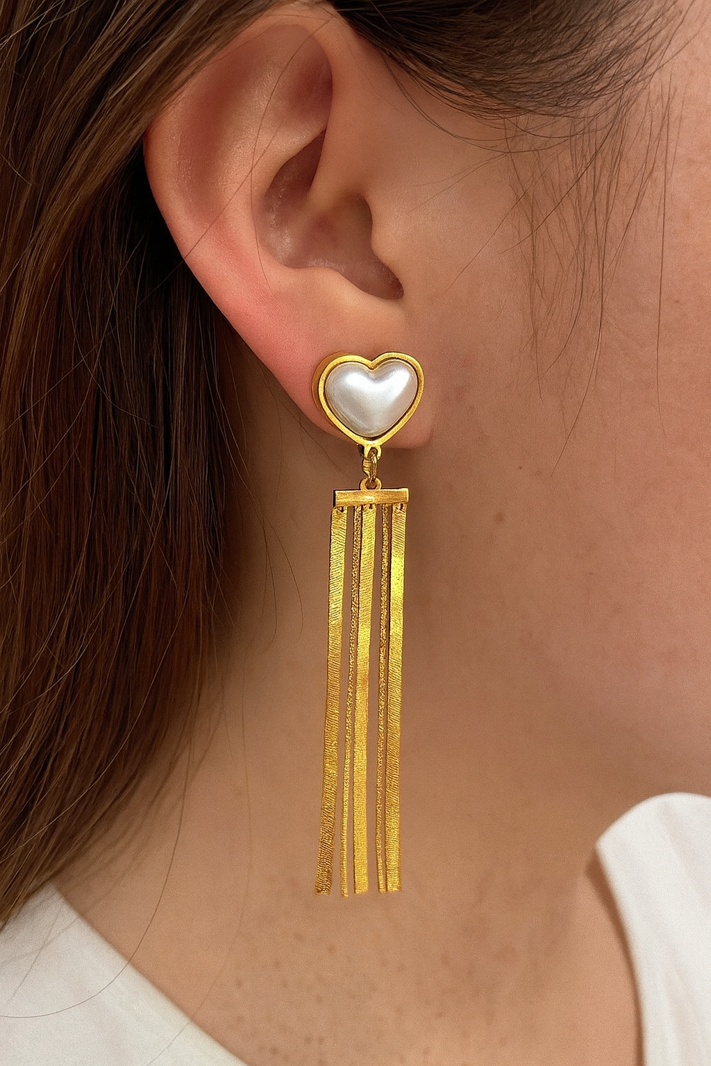 A blend of romance and motion — Heartstrings features lustrous pearl hearts cascading into sleek golden tassels. Designed to sway gracefully with every move, it’s the perfect mix of elegance and allure.