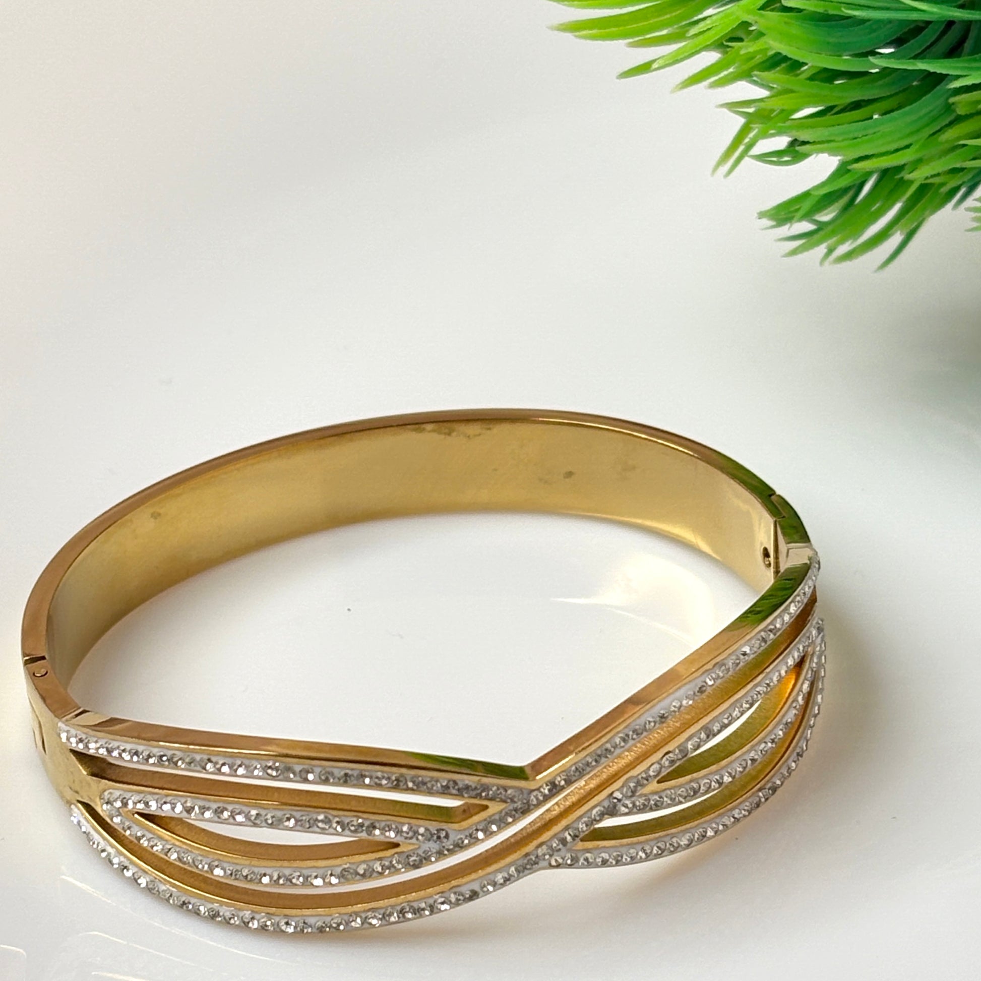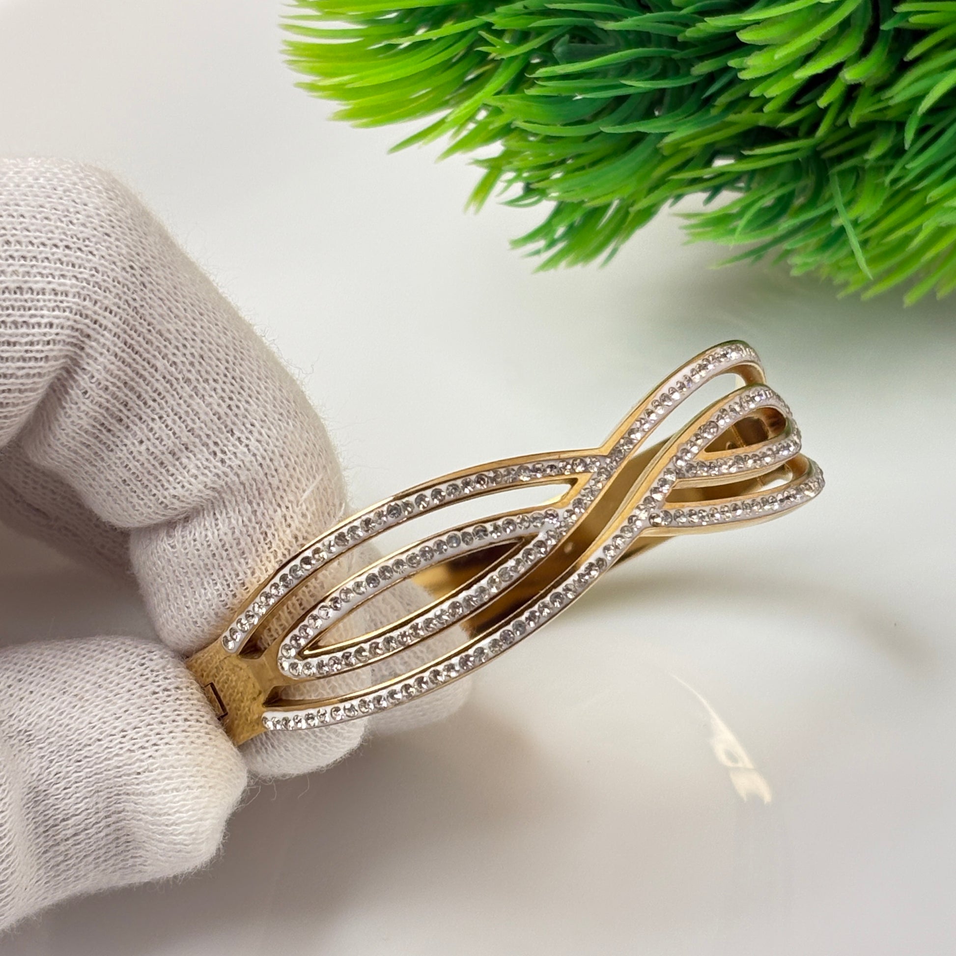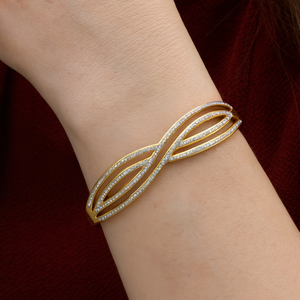 A stunning gold bangle designed with intertwined curves lined with sparkling stones. Its elegant infinity-inspired pattern makes it a timeless symbol of beauty and sophistication.