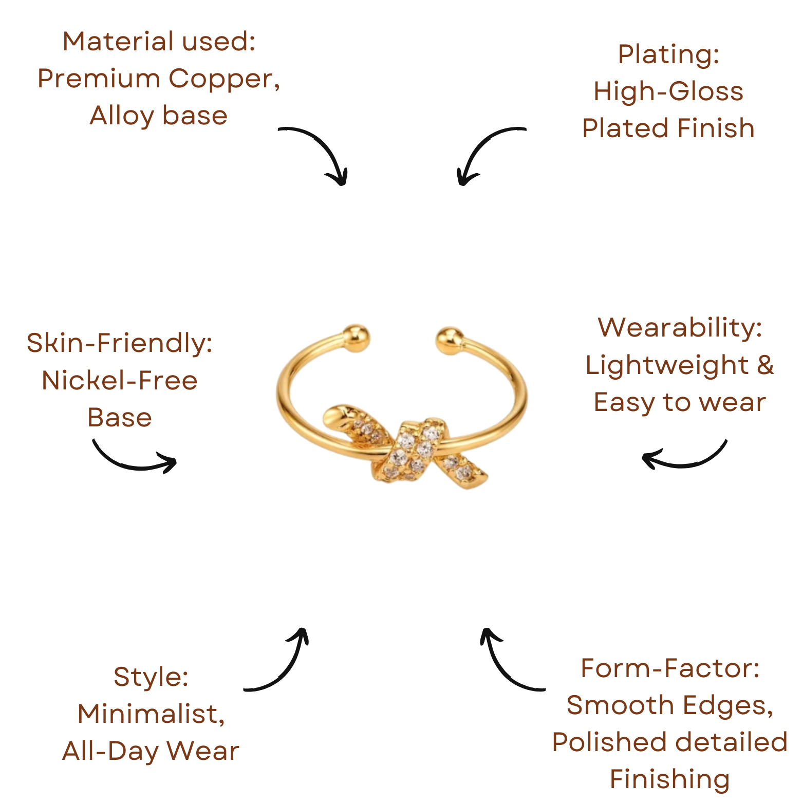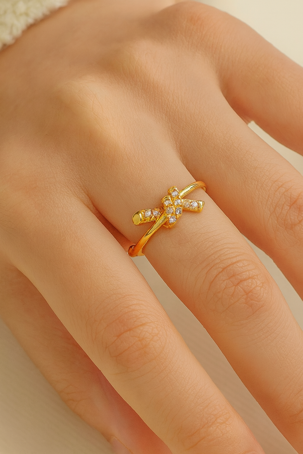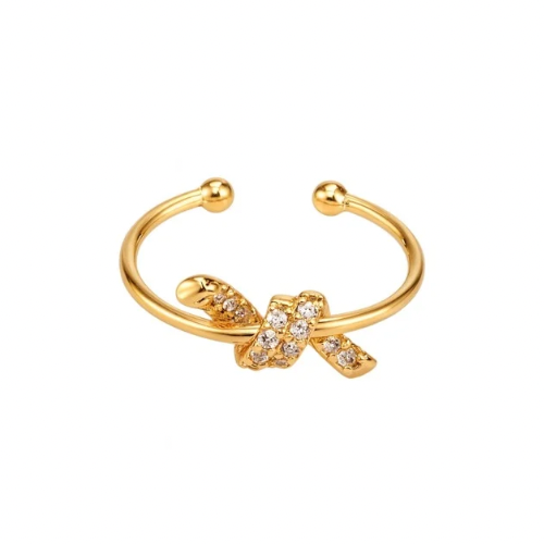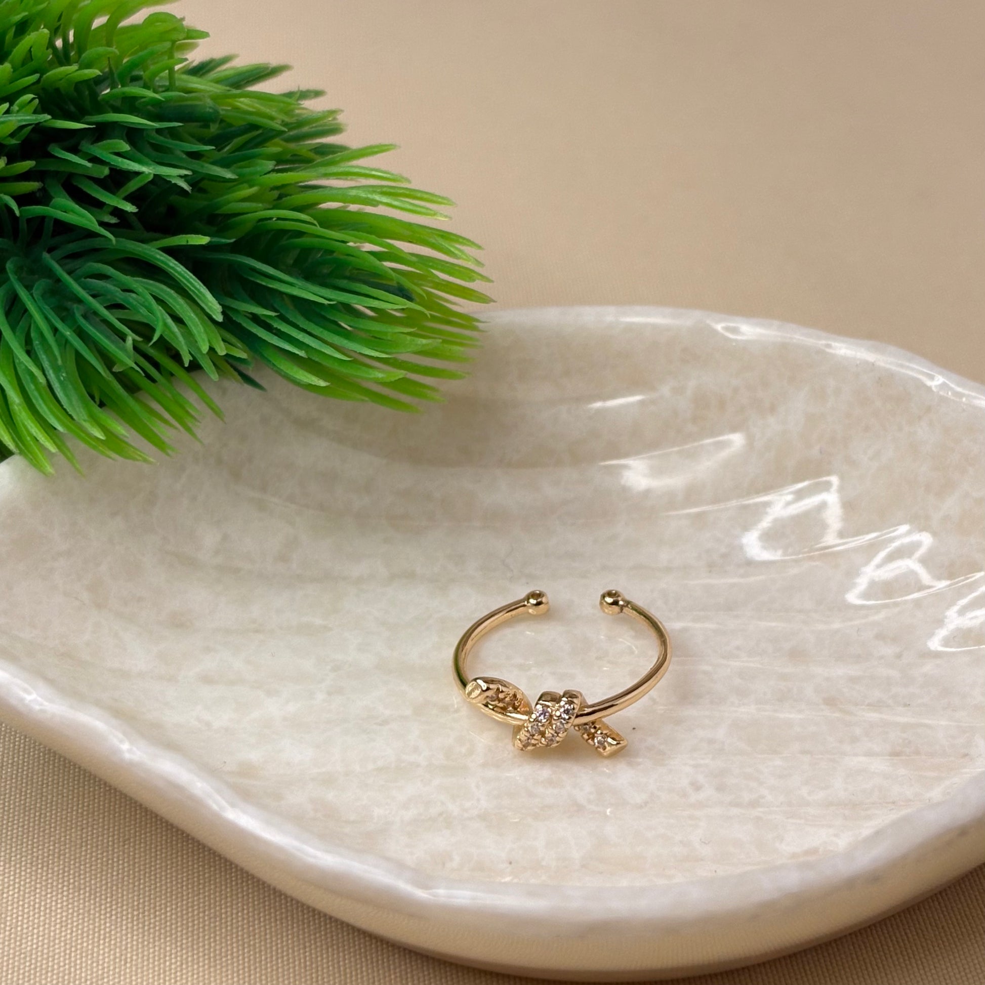 This open knot ring captures the essence of effortless elegance with its sleek golden band and crystal-studded twist detail. Its minimal yet striking design makes it the perfect everyday luxury piece. Adjustable and comfortable, it pairs beautifully with other rings or shines as a delicate solo statement.