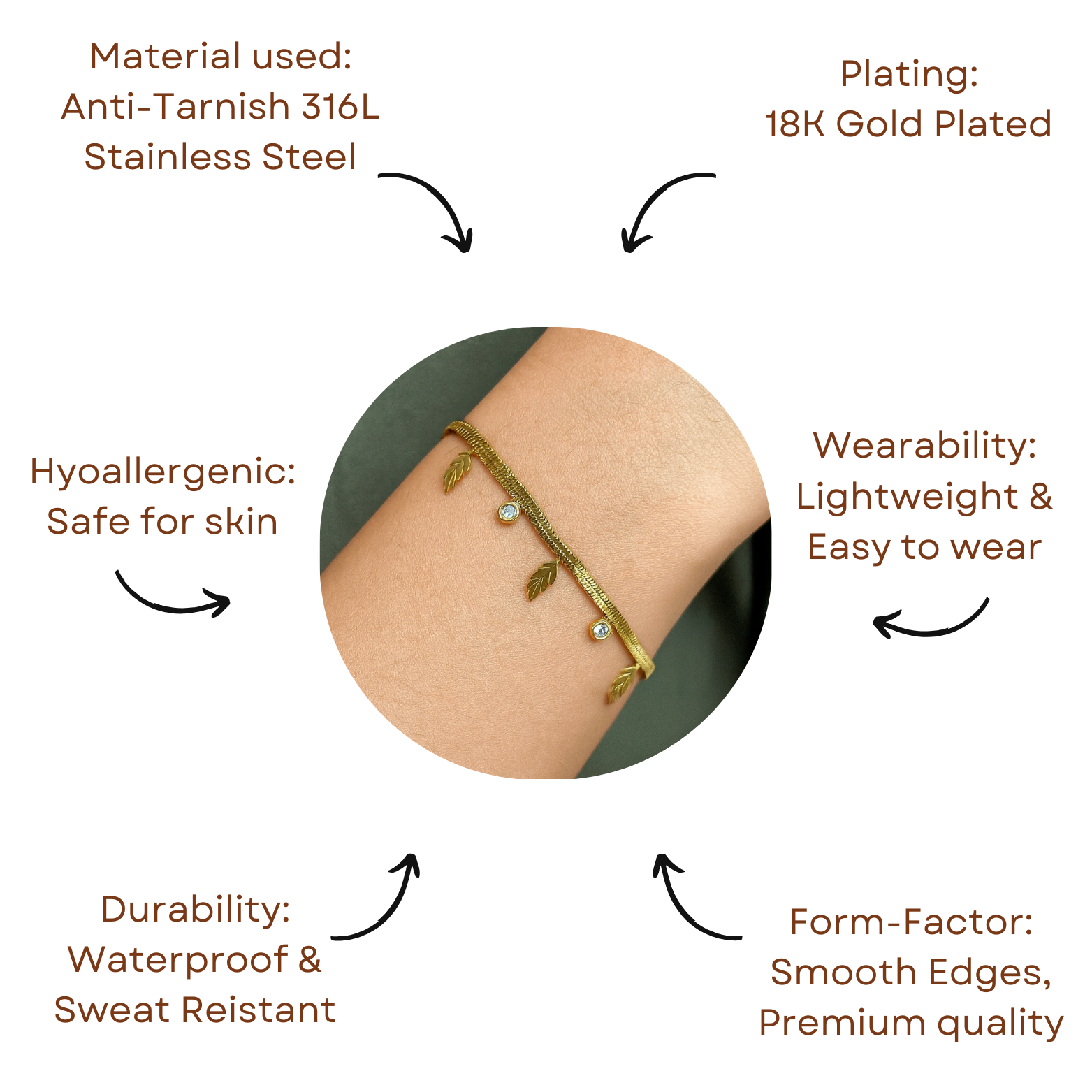 A sleek gold bracelet with delicate leaf charms and sparkling stone drops. Minimal yet playful — perfect for stacking or wearing as a statement on its own.