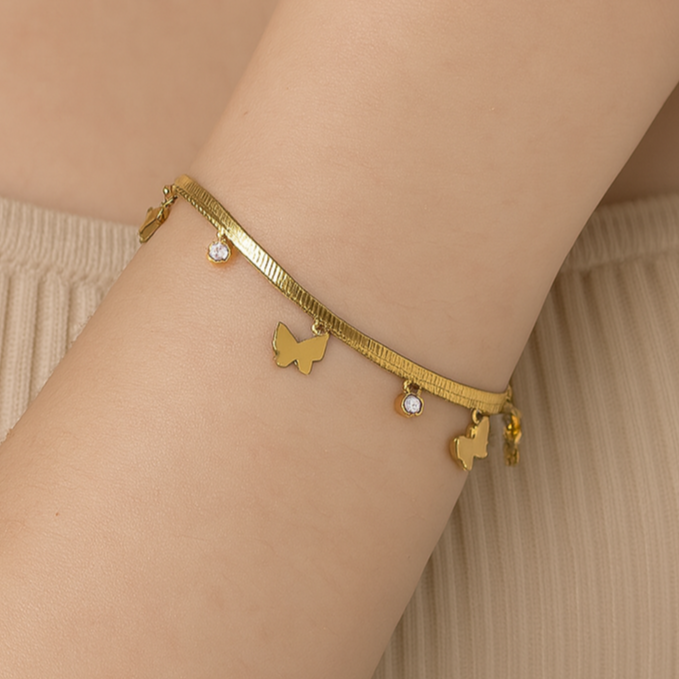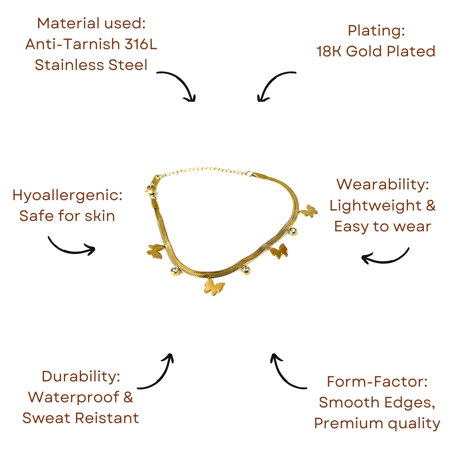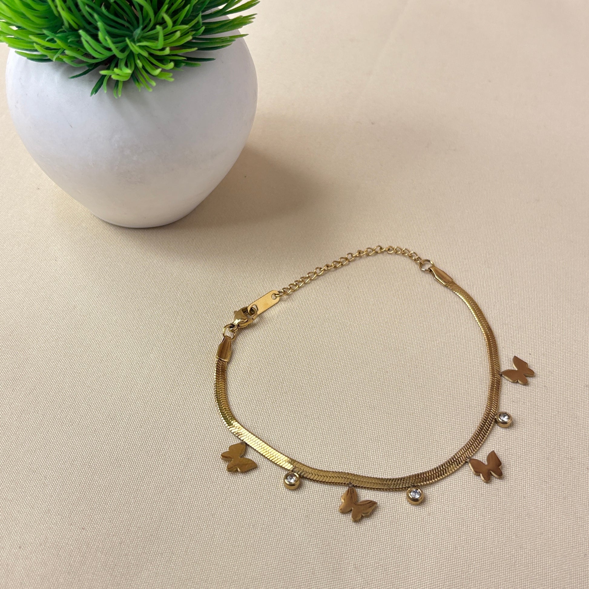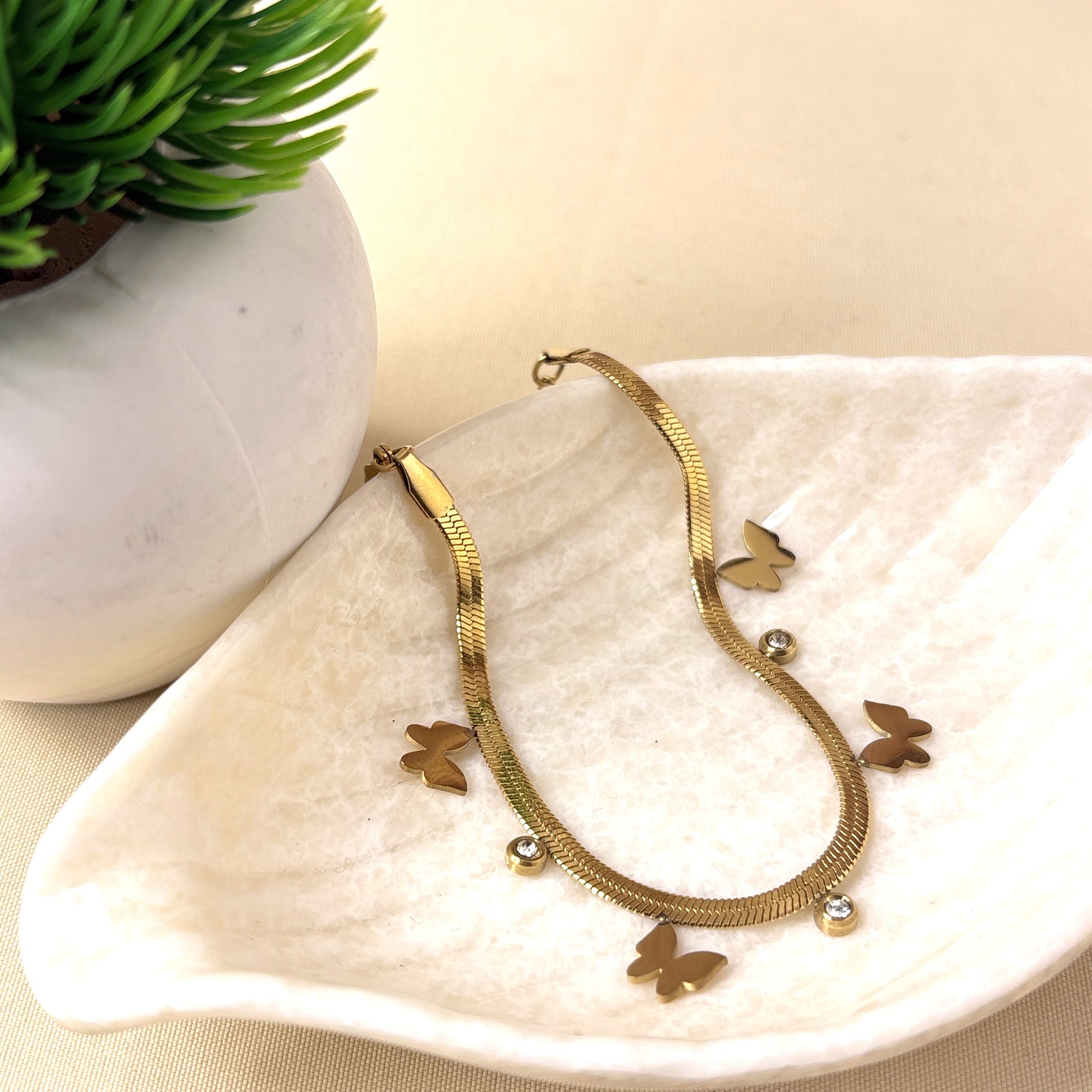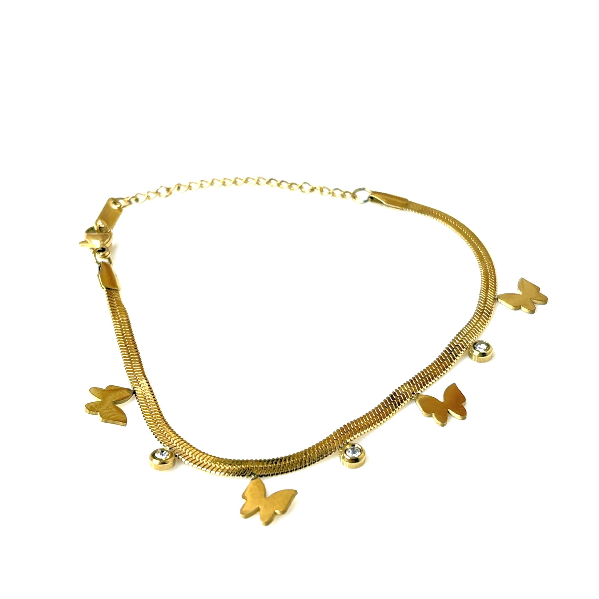 A graceful anklet featuring dainty butterflies and shimmering accents. Perfect for adding a hint of charm and lightness to your look.