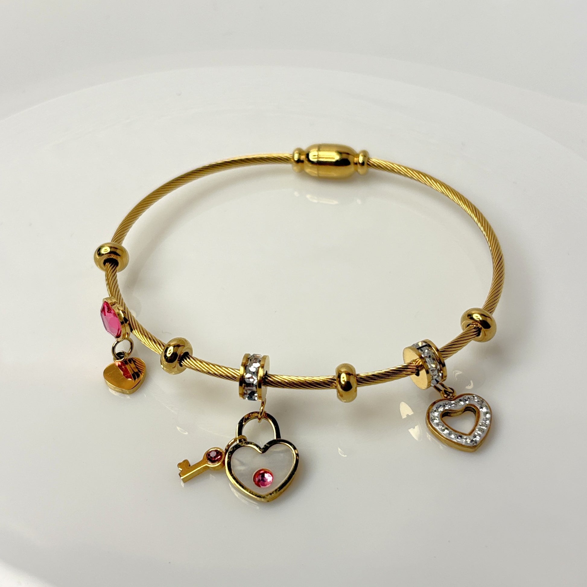 A chic gold cable bracelet with dangling heart charms, sparkling stones, and a delicate key. A perfect symbol of love and elegance that makes every moment feel special.