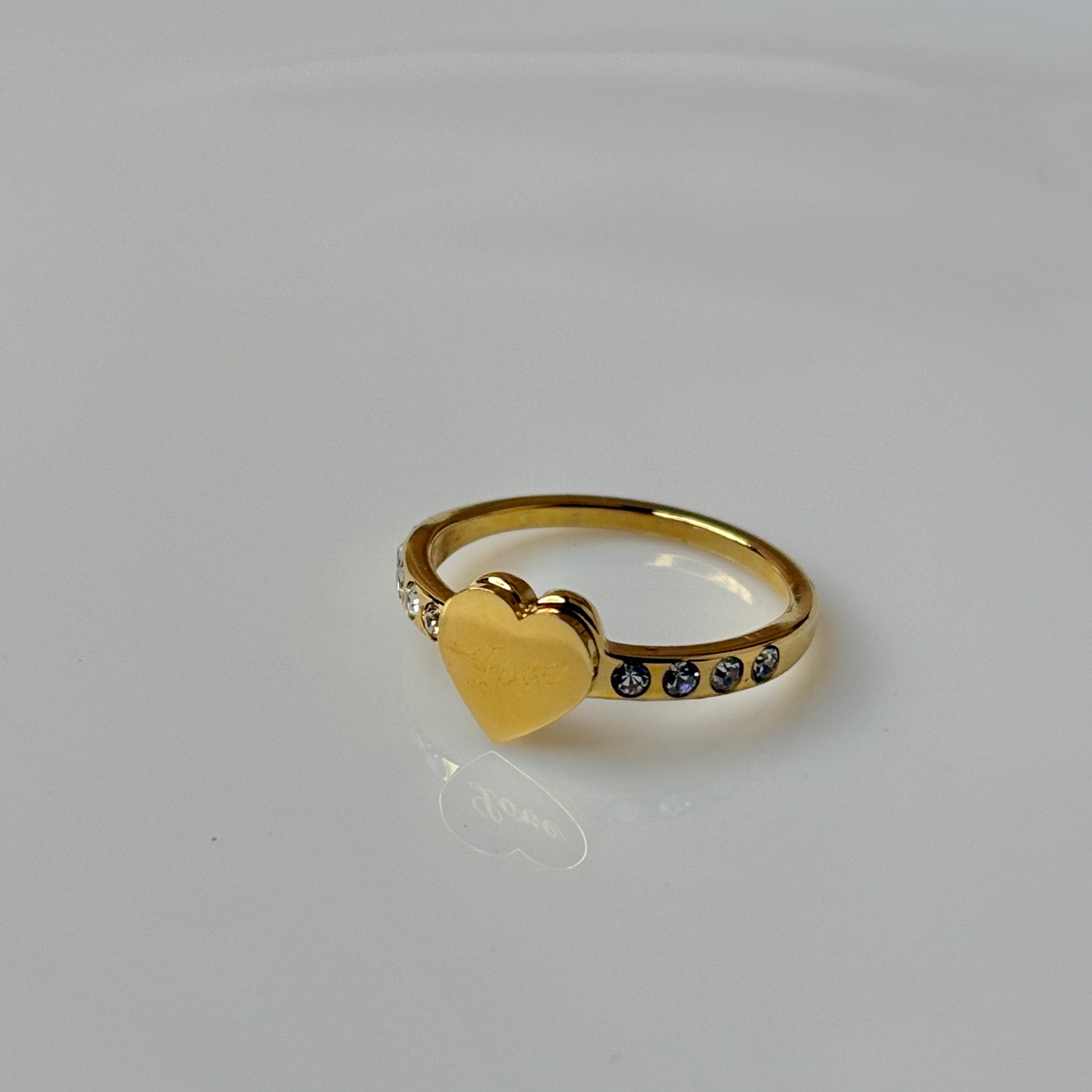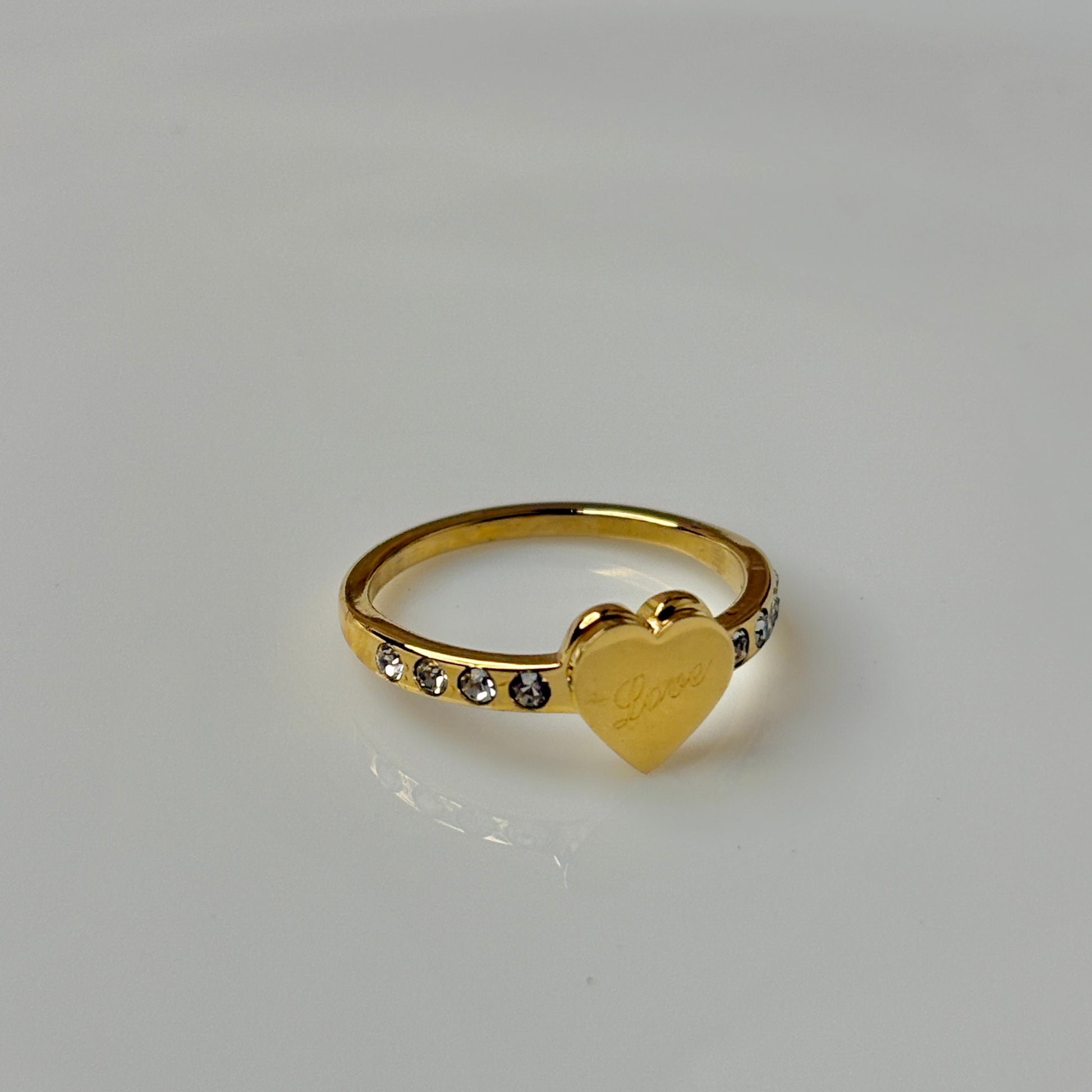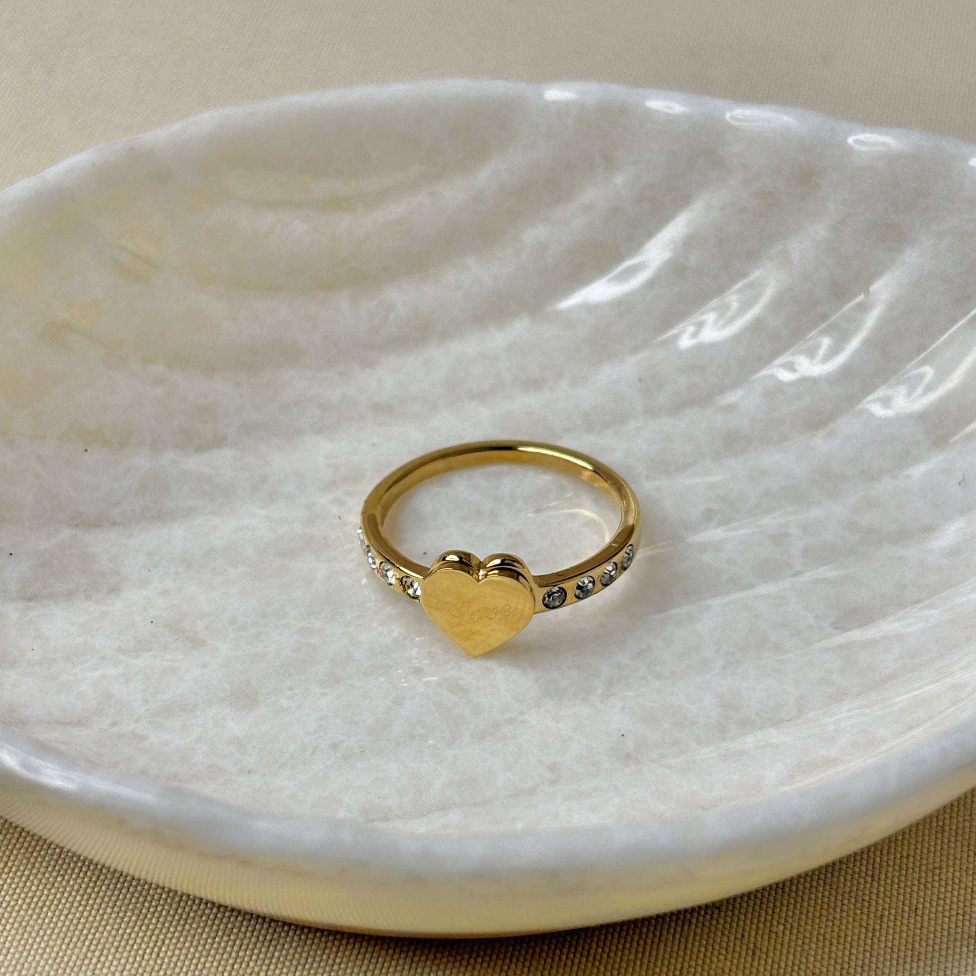 A dainty gold band adorned with sparkling crystals and a central heart engraved with “Love.” Sweet and timeless, this ring is the perfect symbol of affection and elegance.