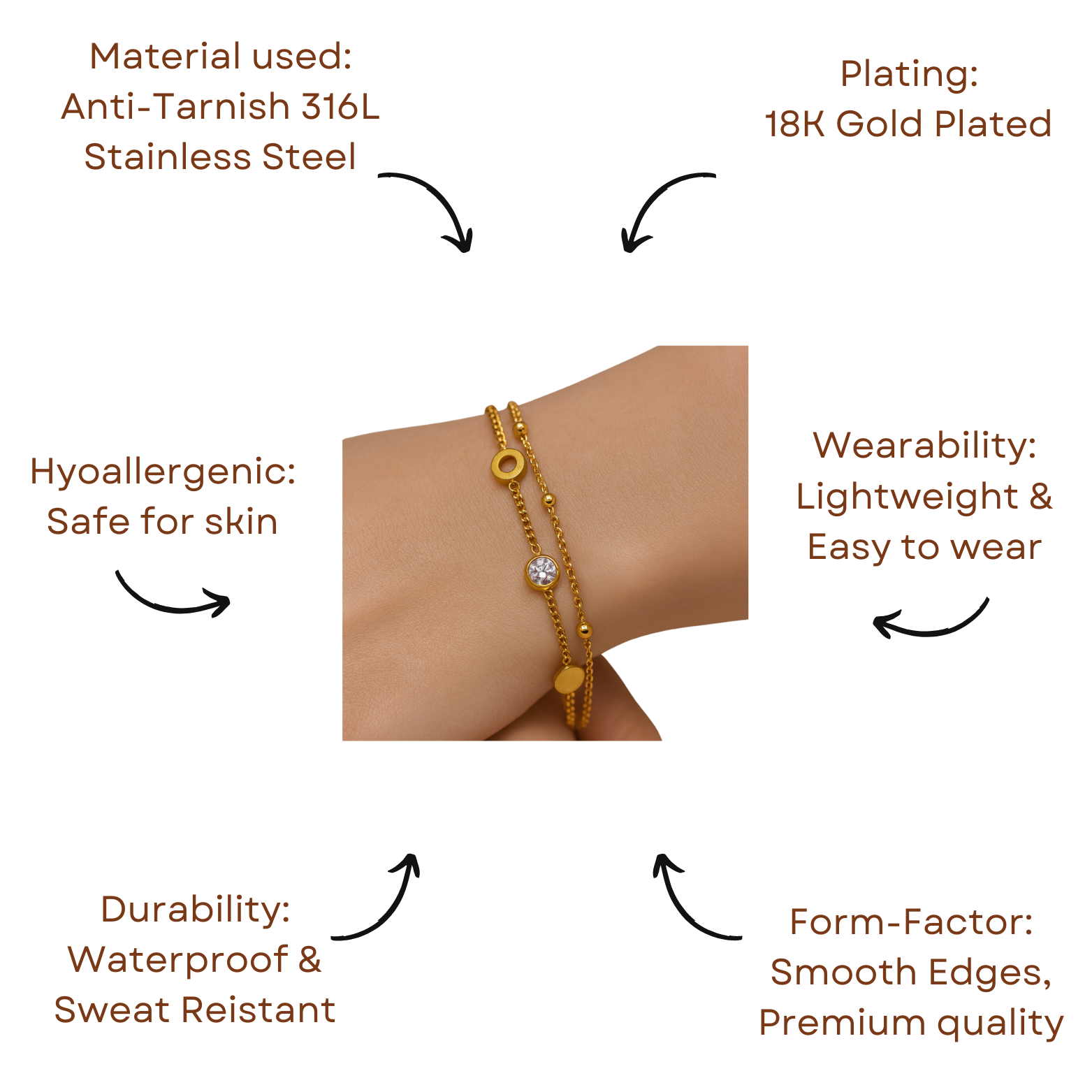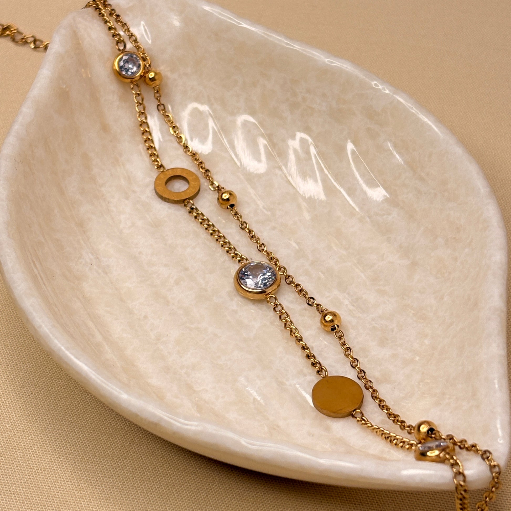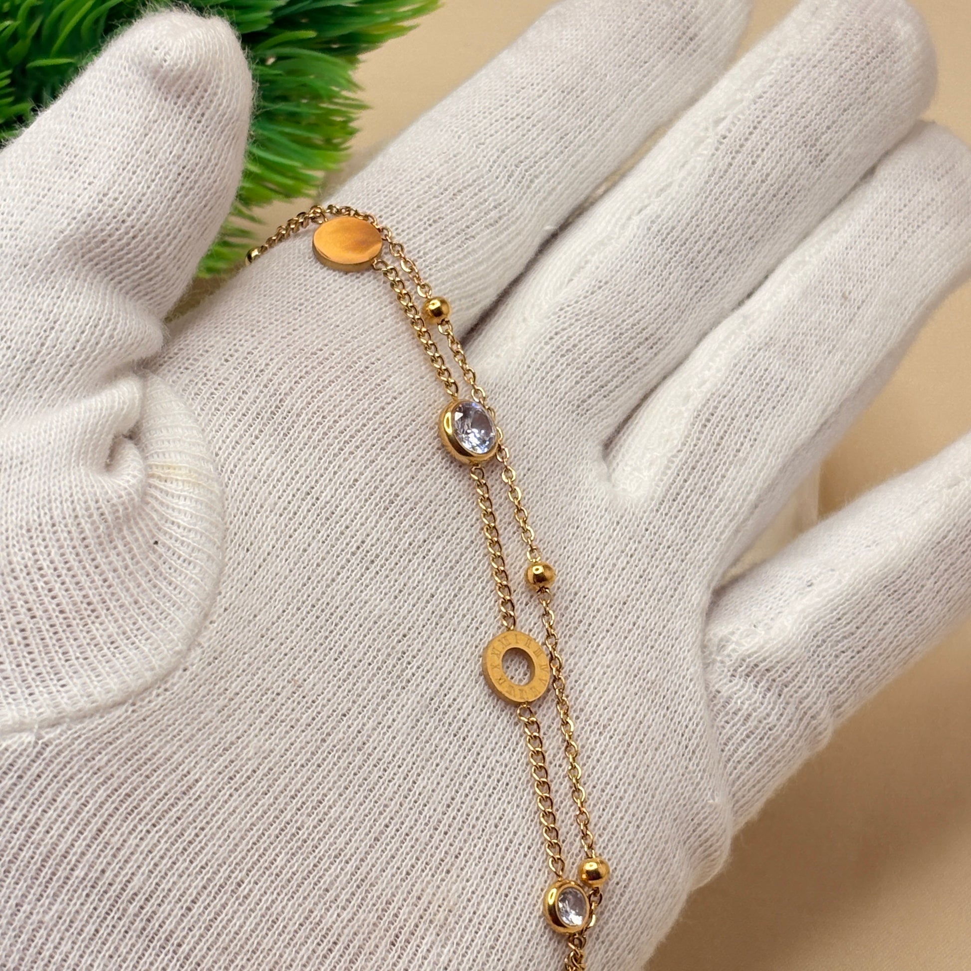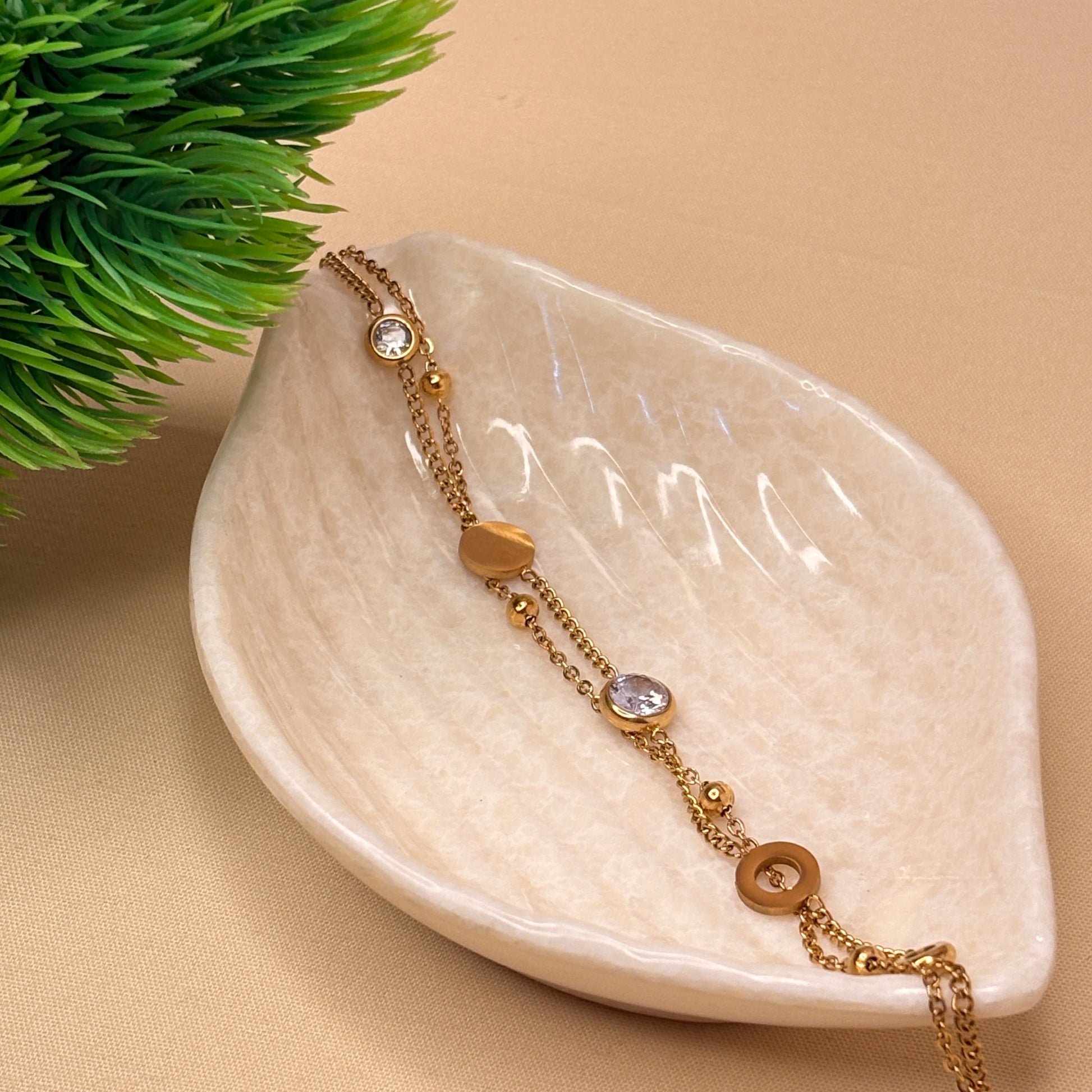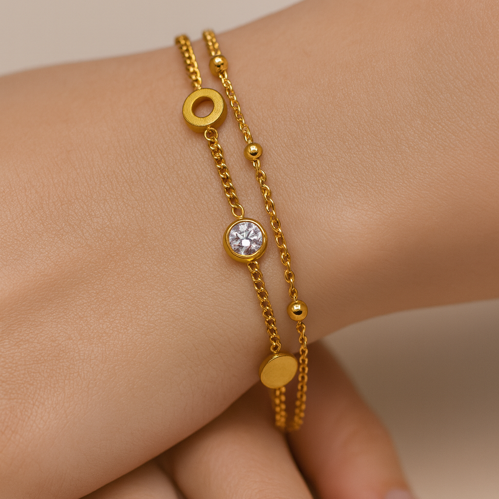 A perfect blend of radiance and rhythm — Luminous Loop features delicate golden circles and sparkling stones that flow together like light in motion. A bracelet that defines quiet sophistication.