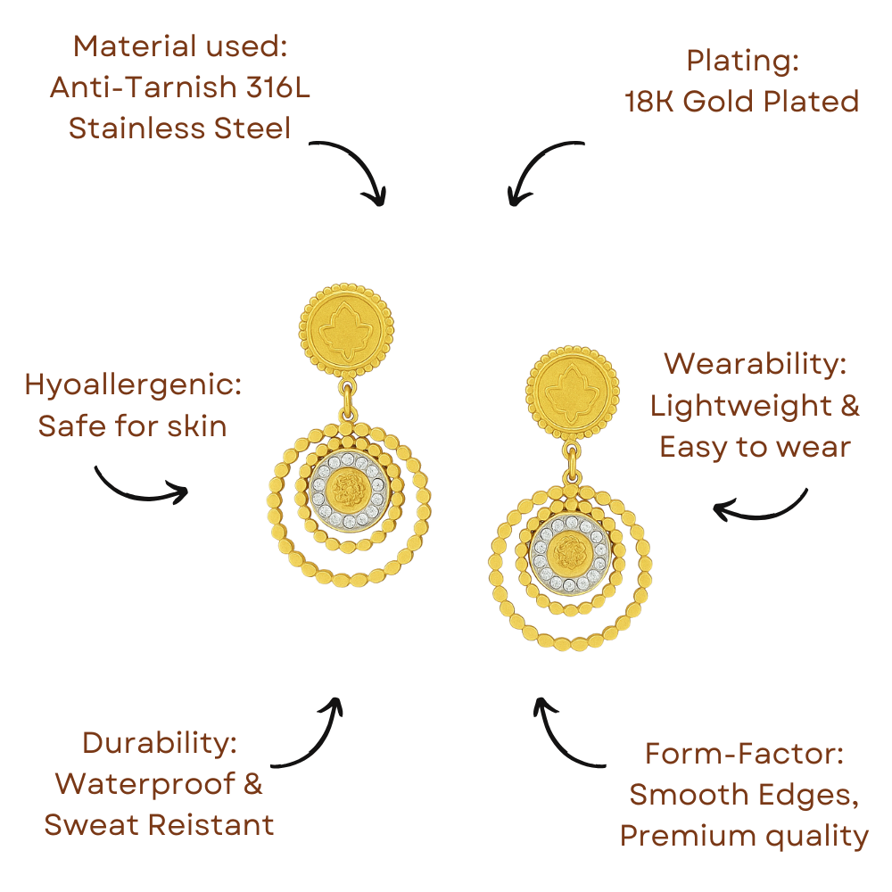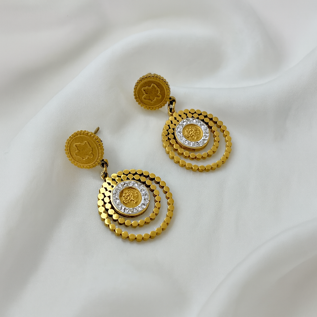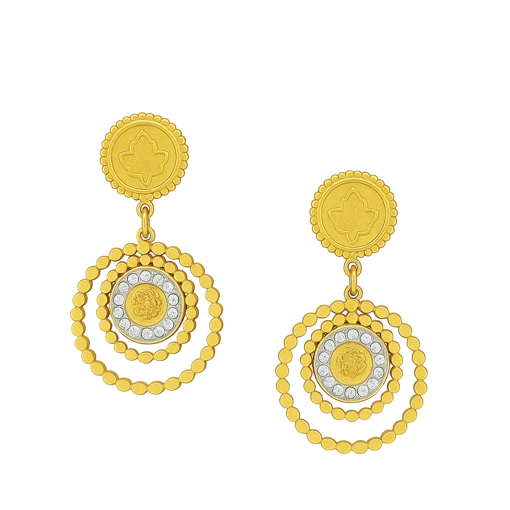 A graceful pair of layered circular drops, blending intricate textures with a touch of sparkle, designed to add timeless elegance to any look.