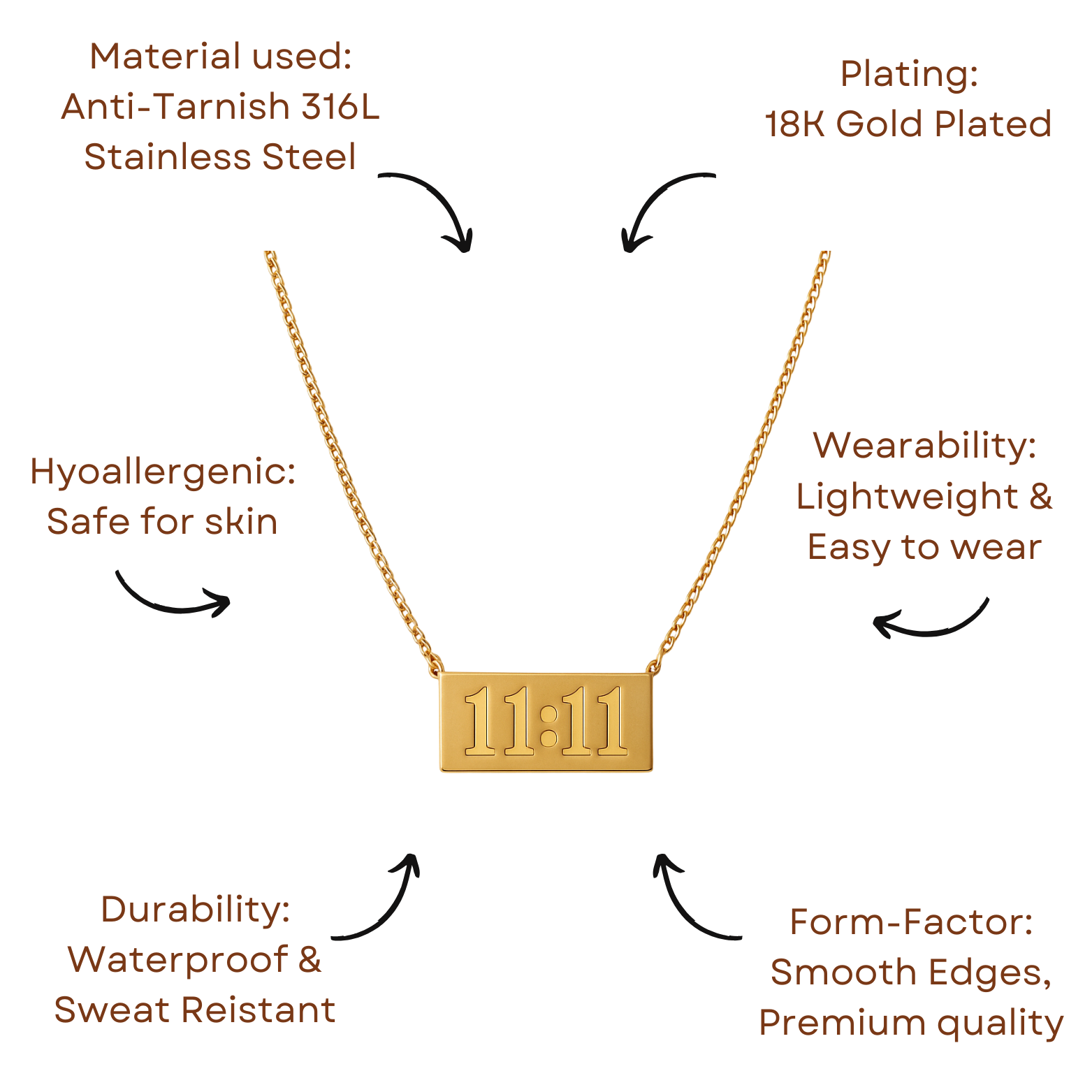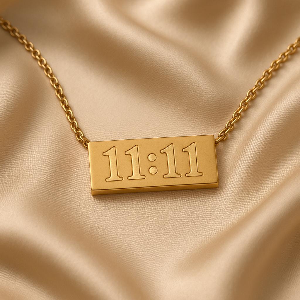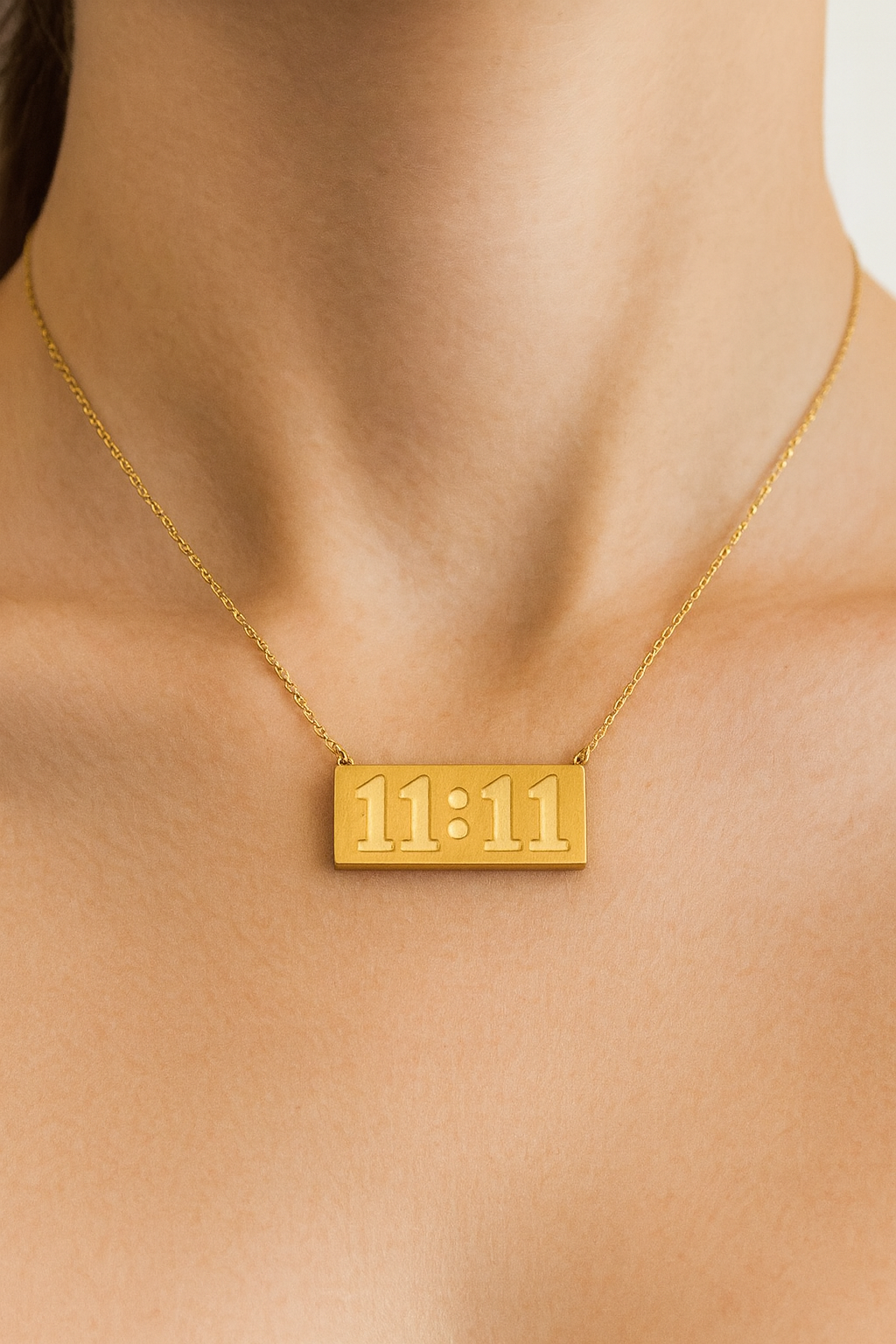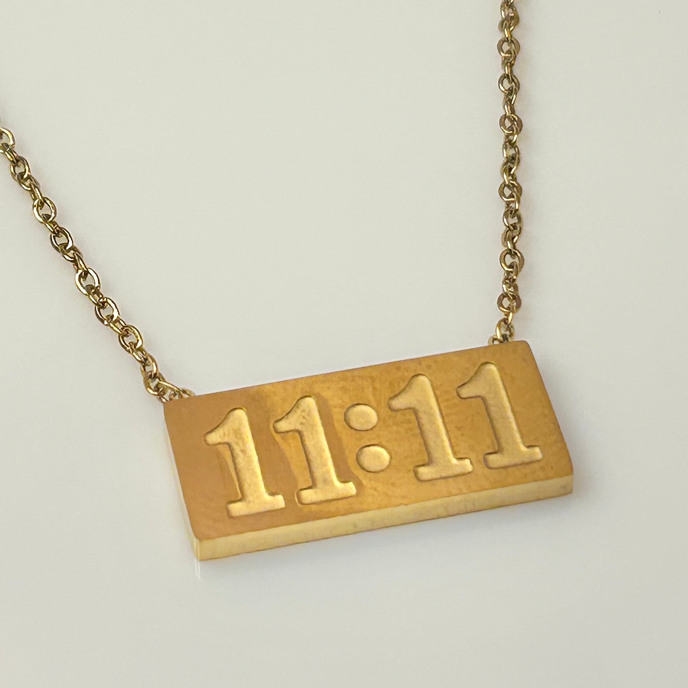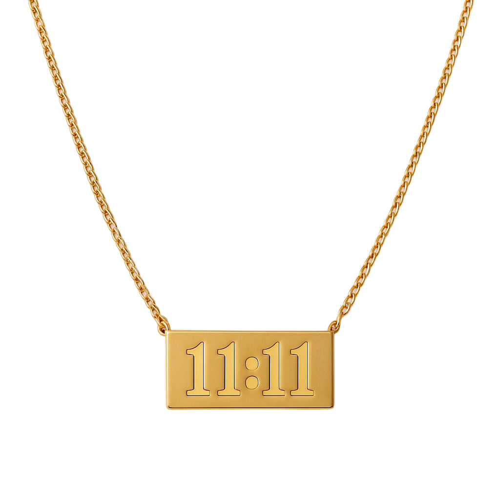 A sleek gold bar pendant engraved with 11:11 — the ultimate symbol of synchronicity and good vibes. Perfect for manifesting positivity and making wishes come true.
