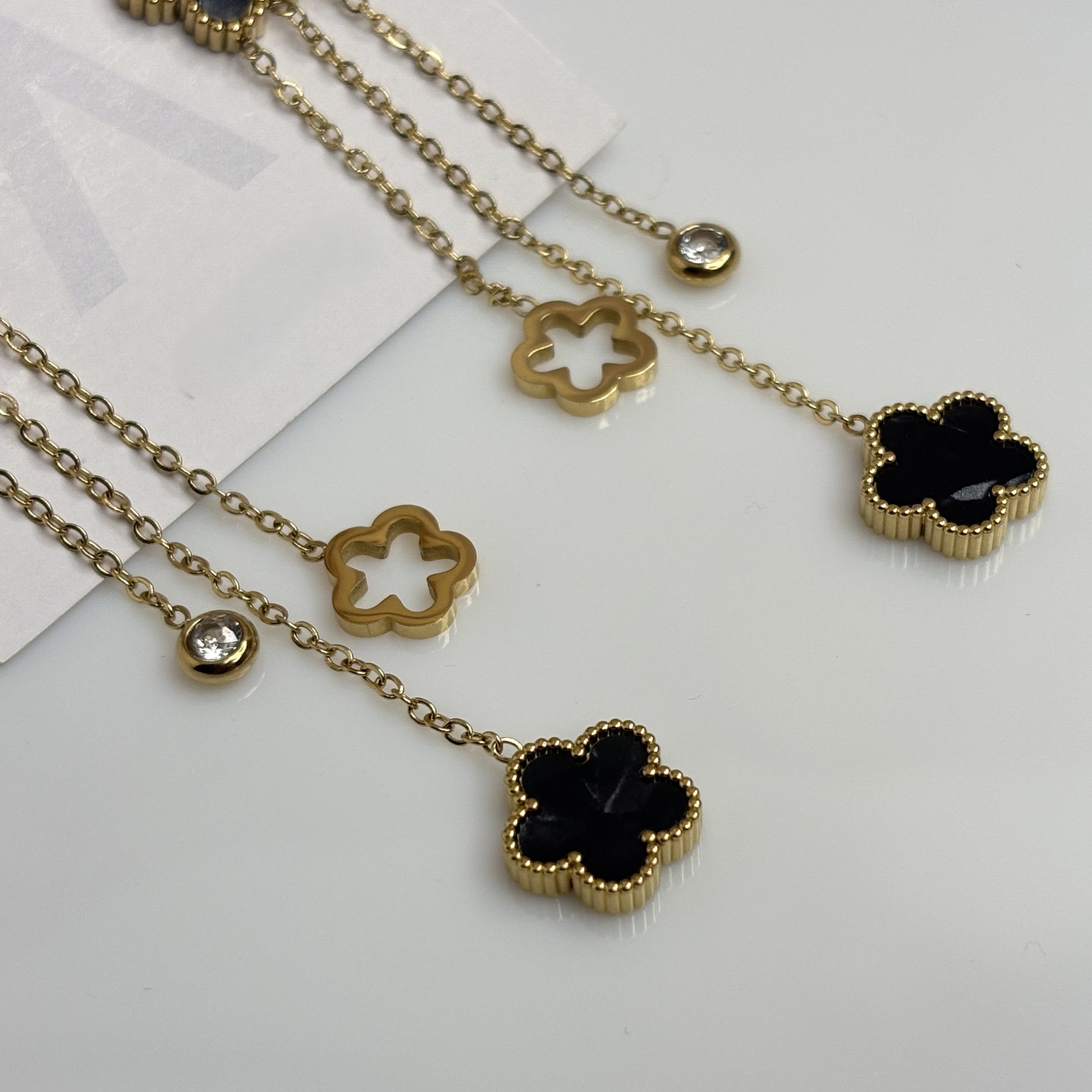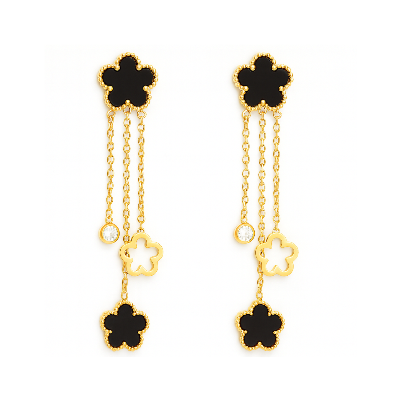 Elegant floral-inspired earrings crafted with black and white enamel charms on golden chains, adorned with sparkling crystals. A perfect blend of sophistication and charm for both day and evening looks.