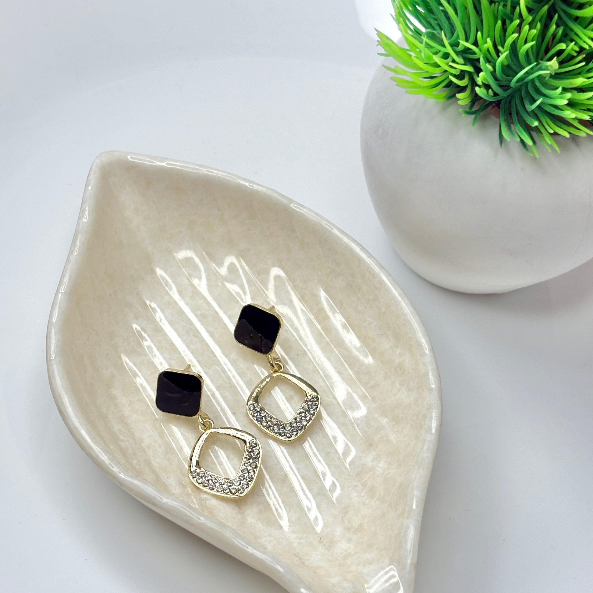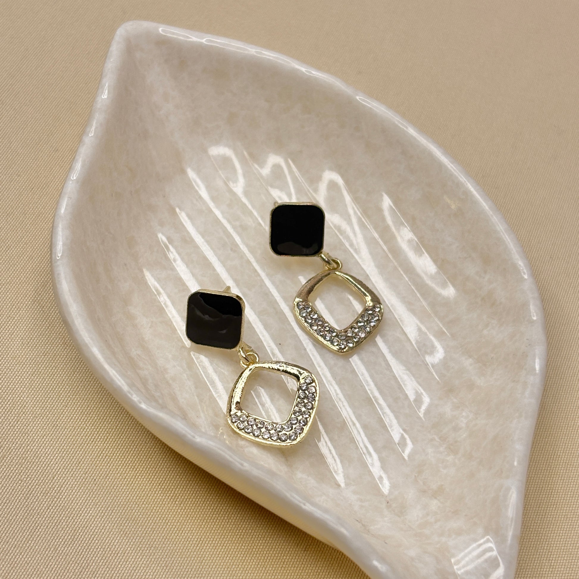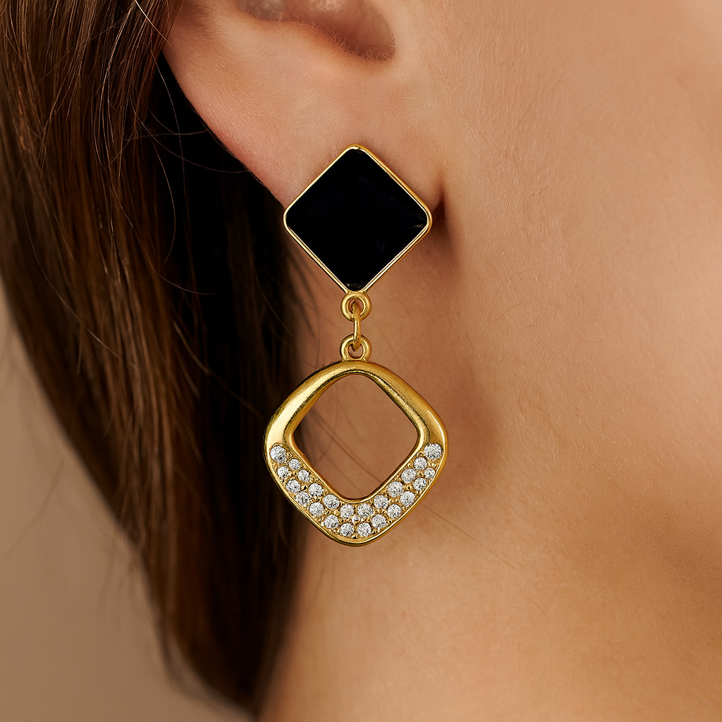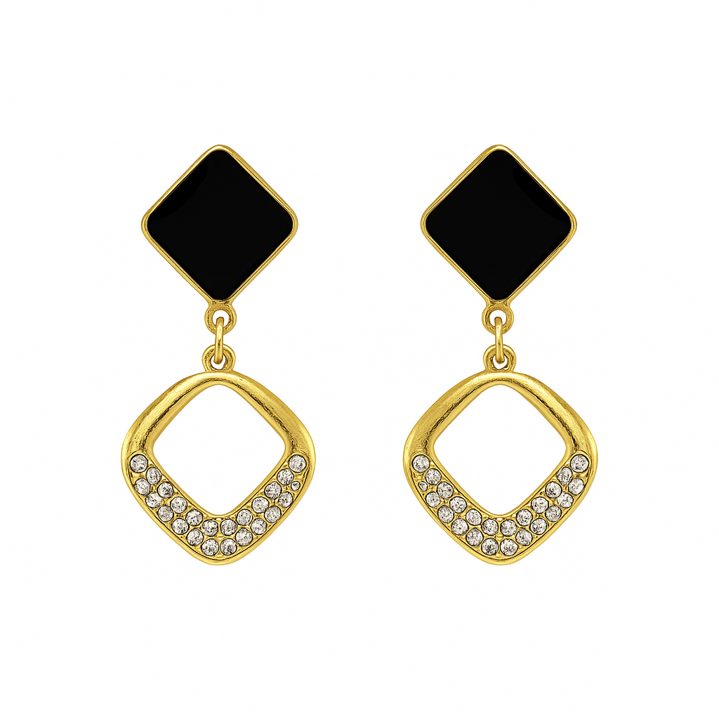 Make a statement with these sleek black and gold drop earrings, accented with sparkling stones. A perfect mix of bold and elegant for both day and night looks.