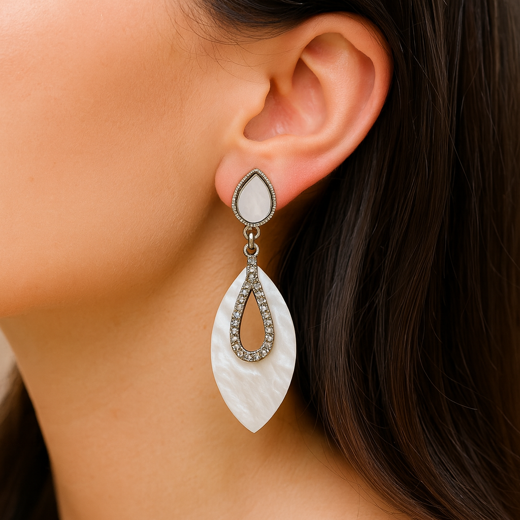 Moonlit Petal reflects the soft glow of moonlight on pearl waters. With its layered pearlescent drops and crystal-studded elegance, this pair exudes ethereal beauty — made to dazzle with quiet sophistication.