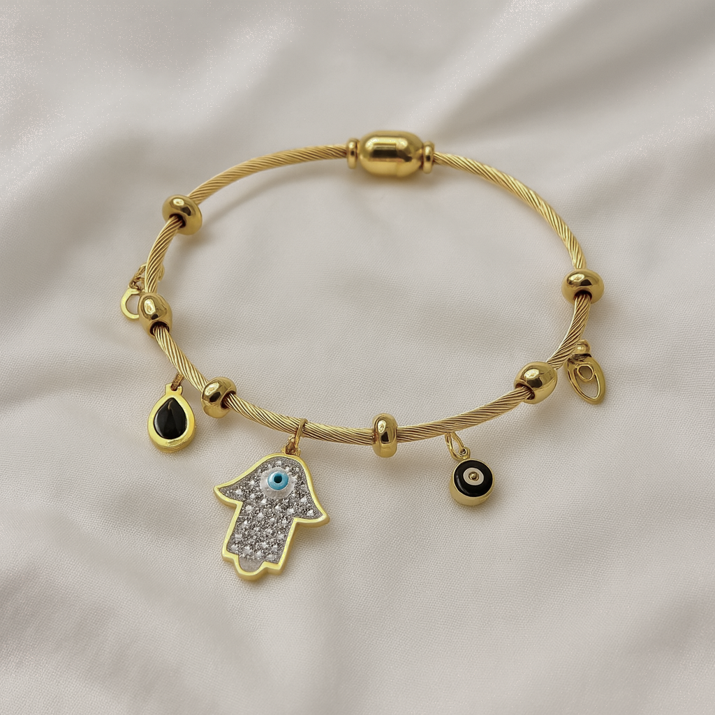 A gold-toned cable bracelet adorned with protective charms including the sparkling Hamsa hand, evil eye, and symbolic accents. Stylish yet meaningful, it blends elegance with a touch of spirituality.