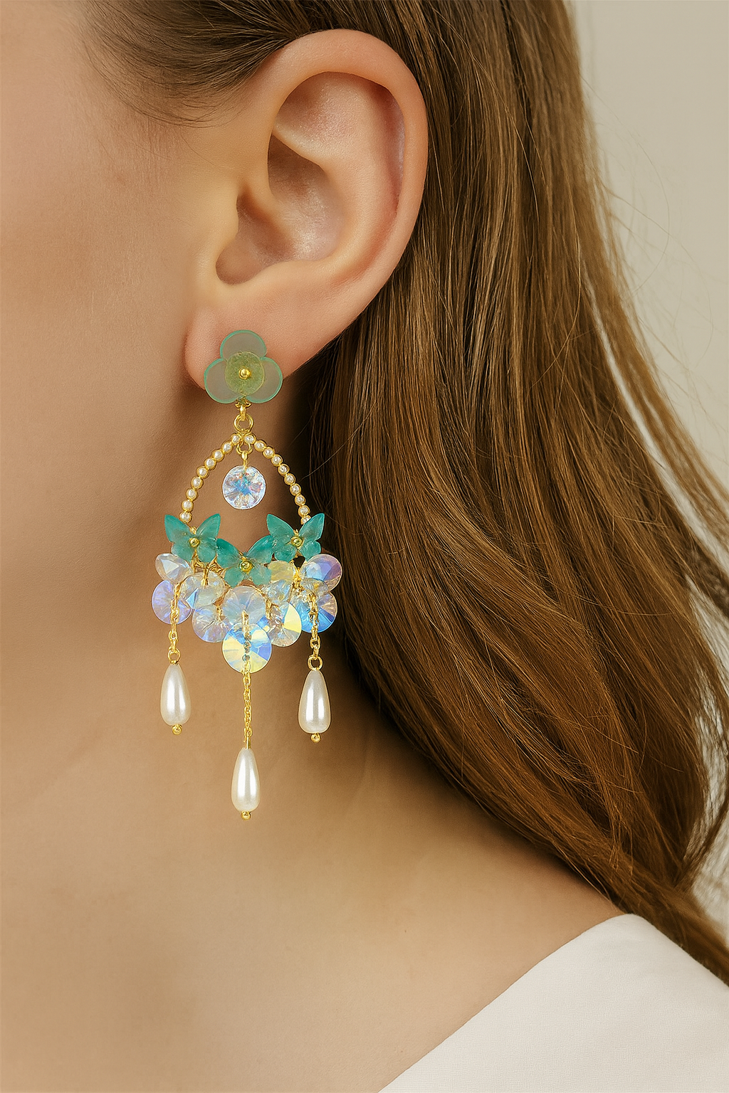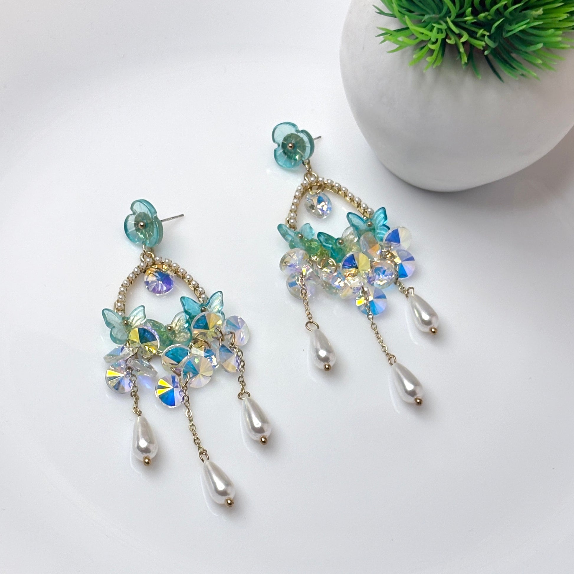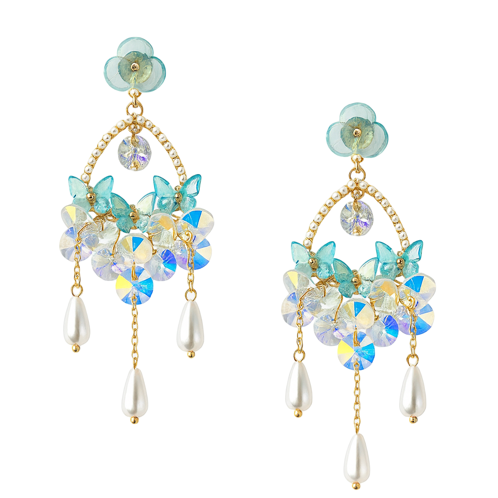 Dreamy chandelier earrings with sea-blue petals, crystal drops, and delicate pearls. A perfect blend of ocean vibes and elegance for a statement look.