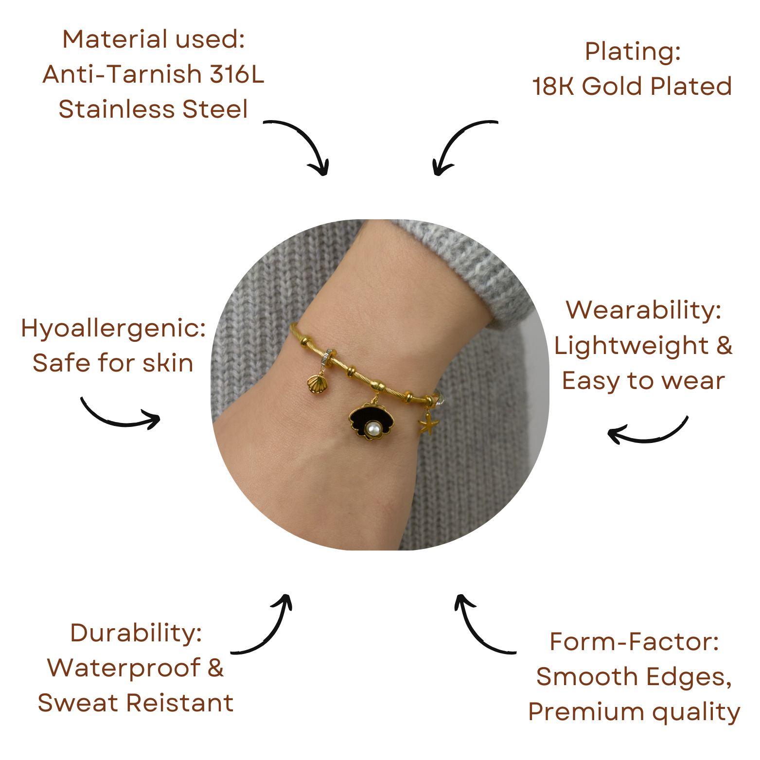 Inspired by the beauty of the sea, this golden bracelet features a seashell, starfish, and pearl charm on a sleek cable design. A perfect blend of elegance and coastal vibes, it’s your go-to piece for both casual and chic looks.