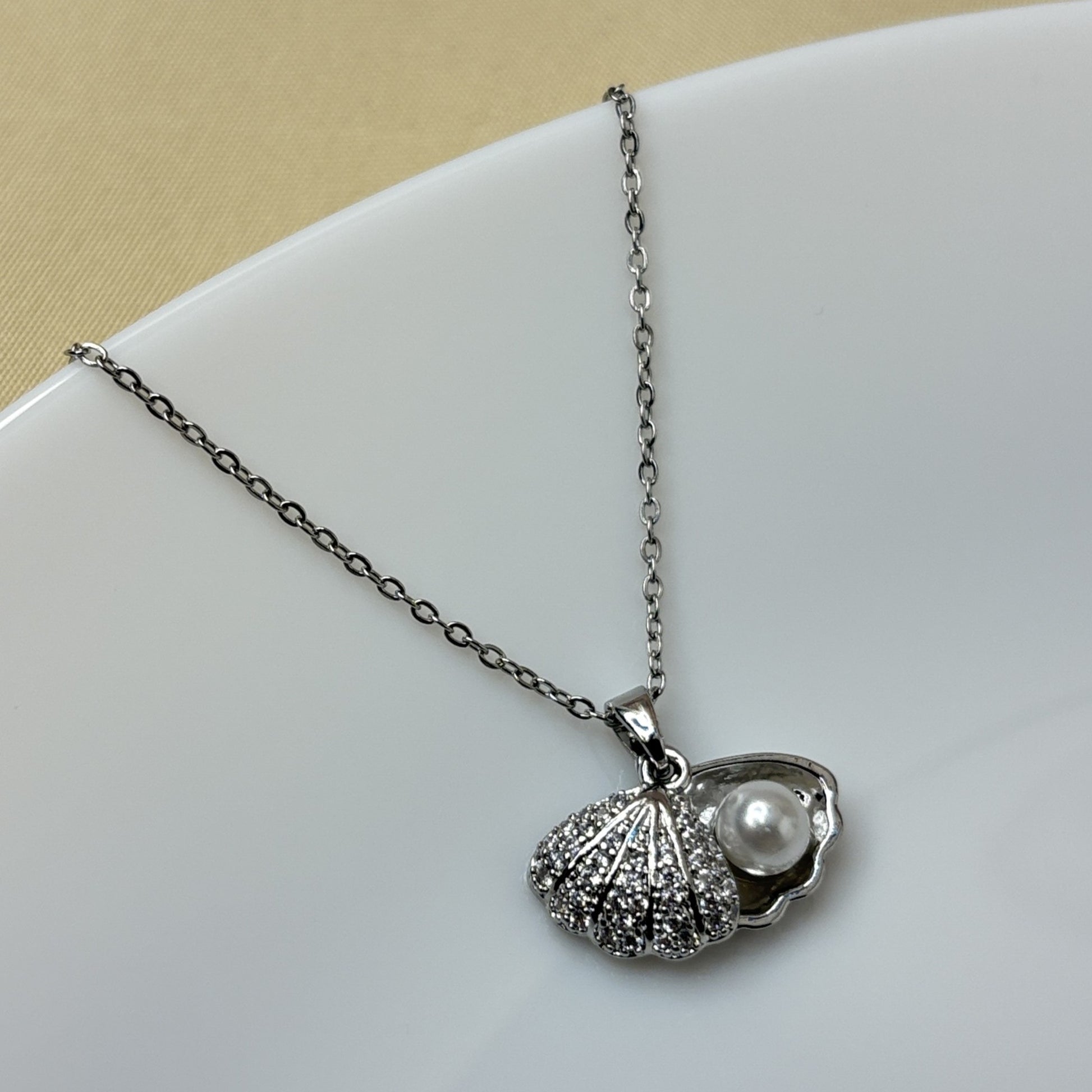 A delicate seashell locket pendant revealing a lustrous pearl inside, symbolizing hidden beauty and elegance. Perfect for those who love timeless ocean-inspired jewelry with a touch of sparkle.
