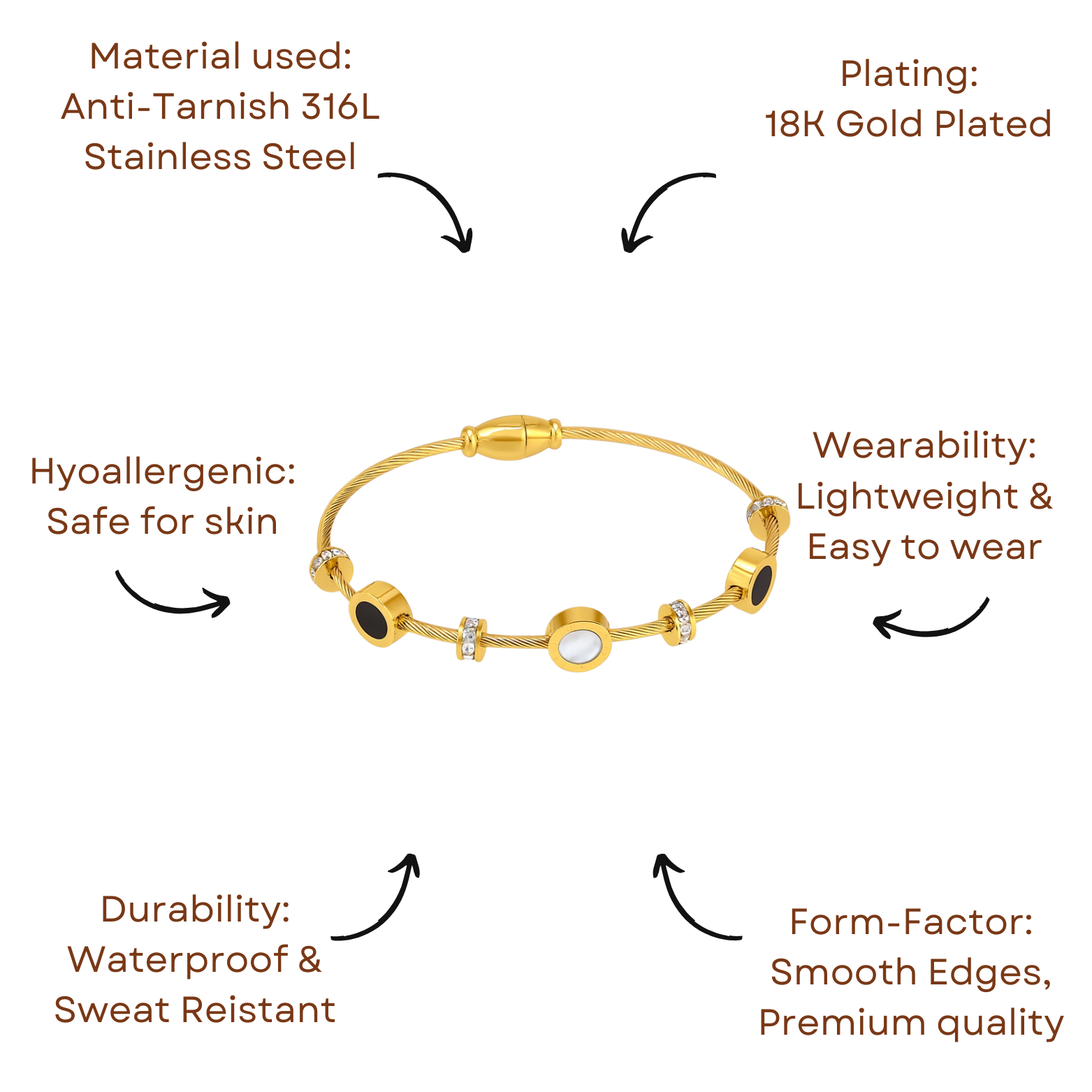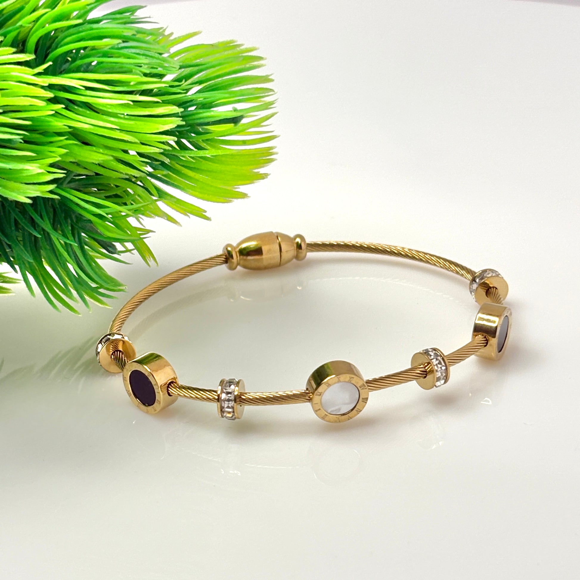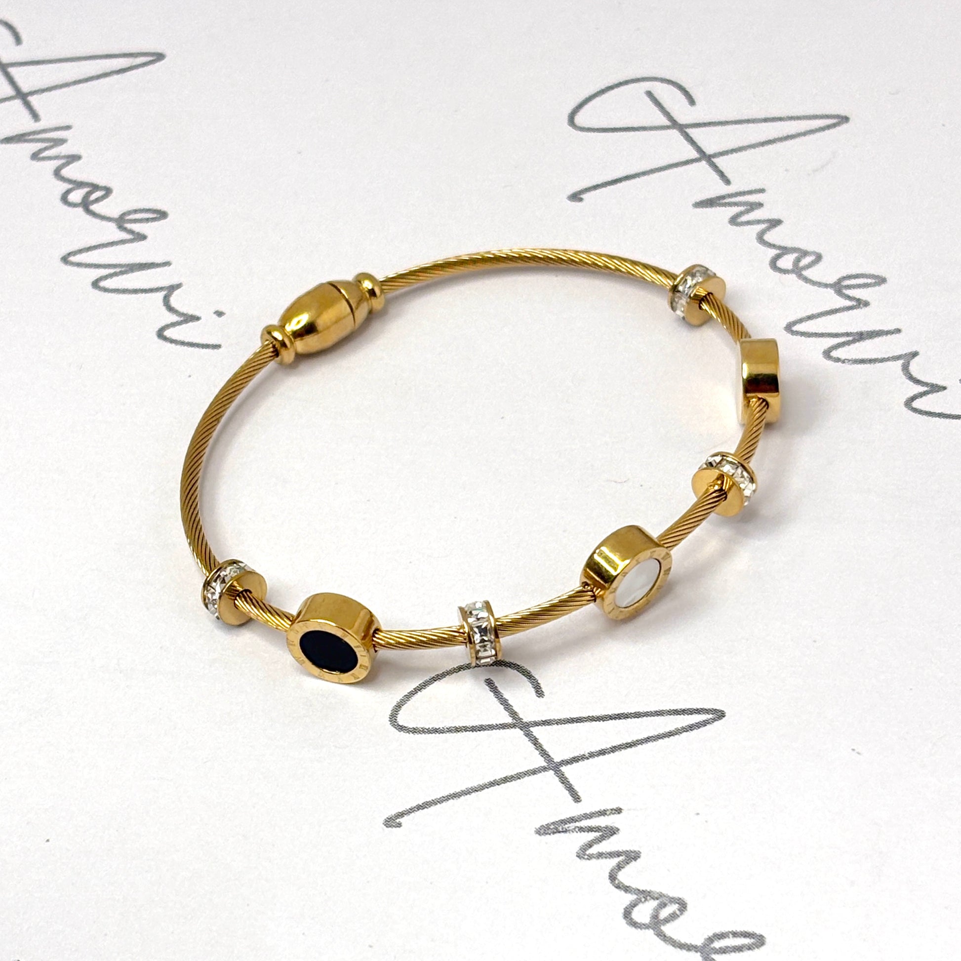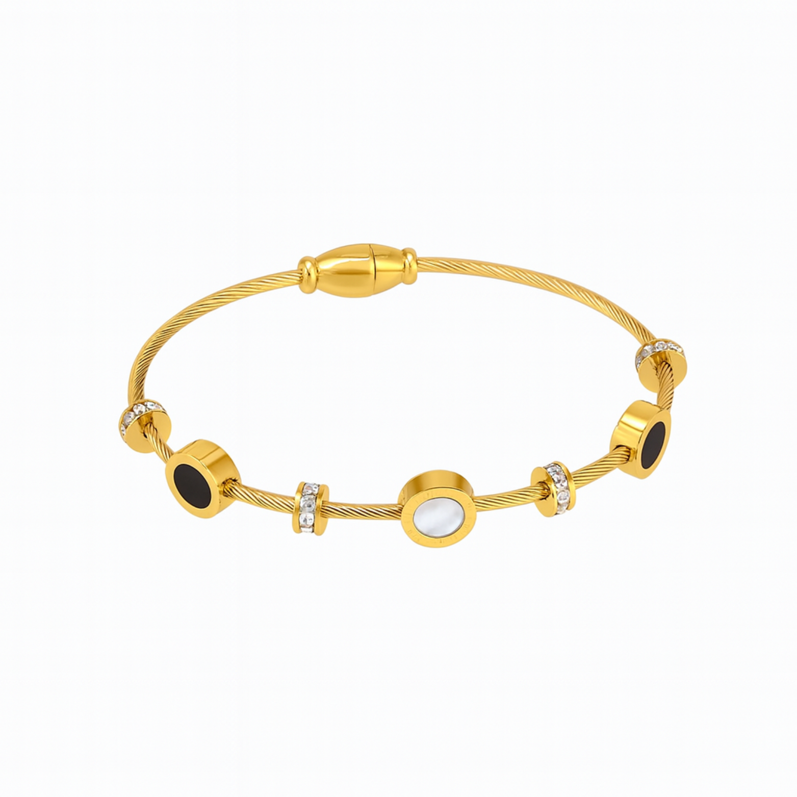 Crafted with a golden twist band and highlighted by contrasting pearl-white and midnight-blue charms, this bracelet is the essence of refined chic.