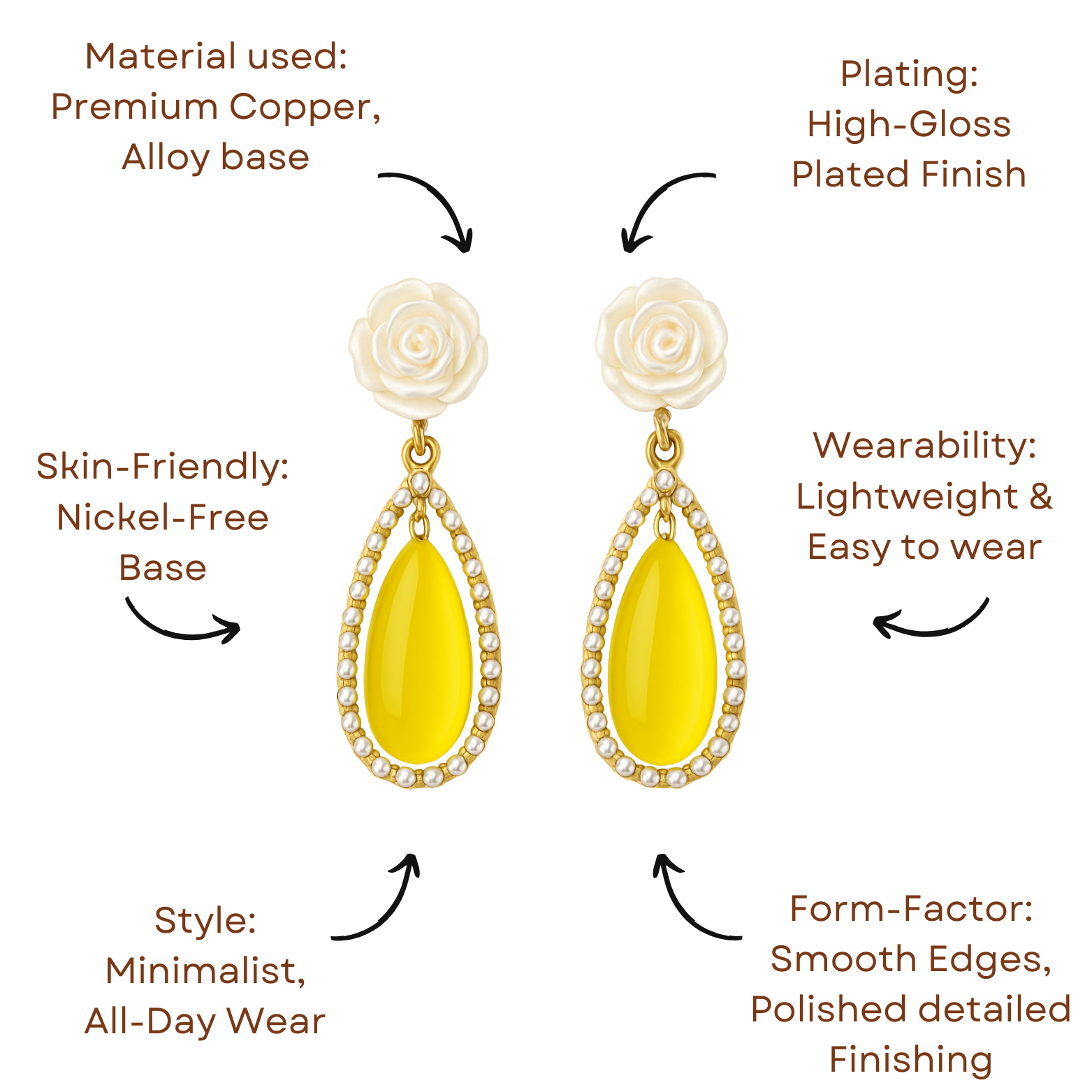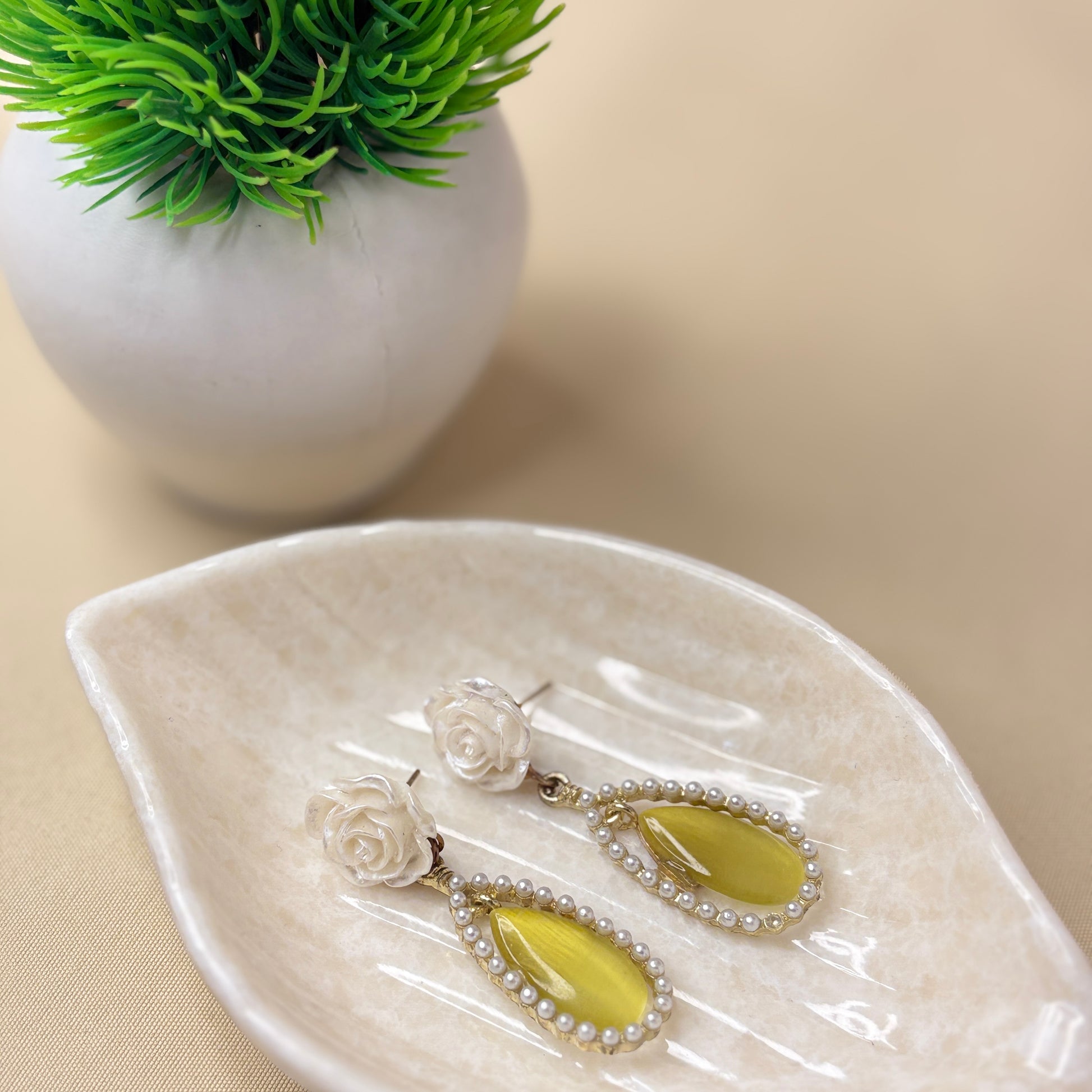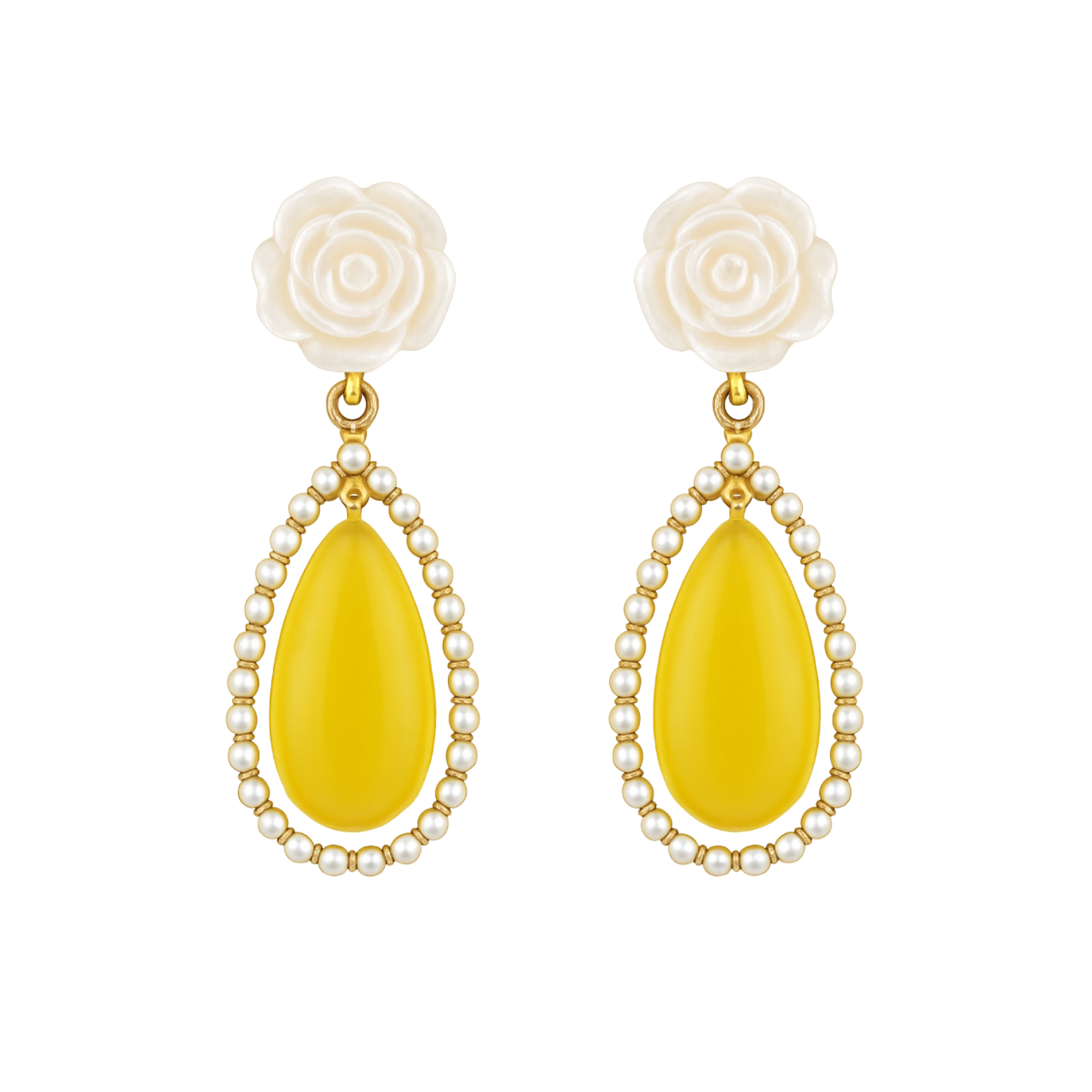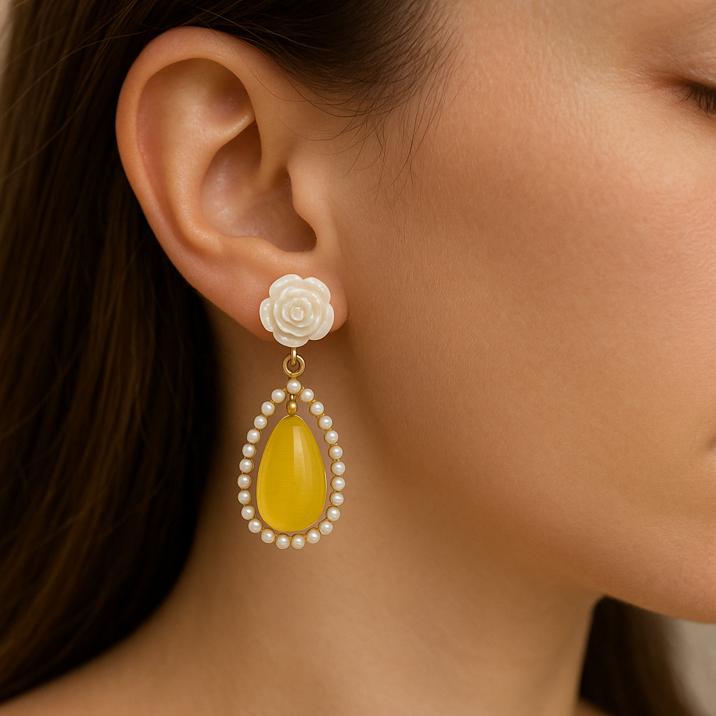 Elegant drop earrings featuring a delicate white rose stud and teardrop yellow stone framed with tiny pearls. The soft floral top paired with the vibrant drop creates a perfect blend of charm and freshness. Ideal for brunch dates, festive occasions, or adding a pop of color to neutral outfits.