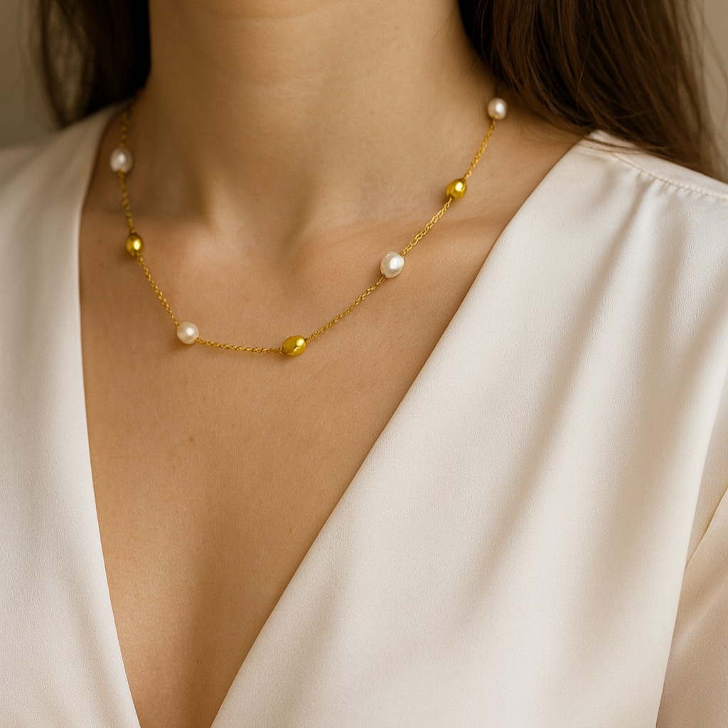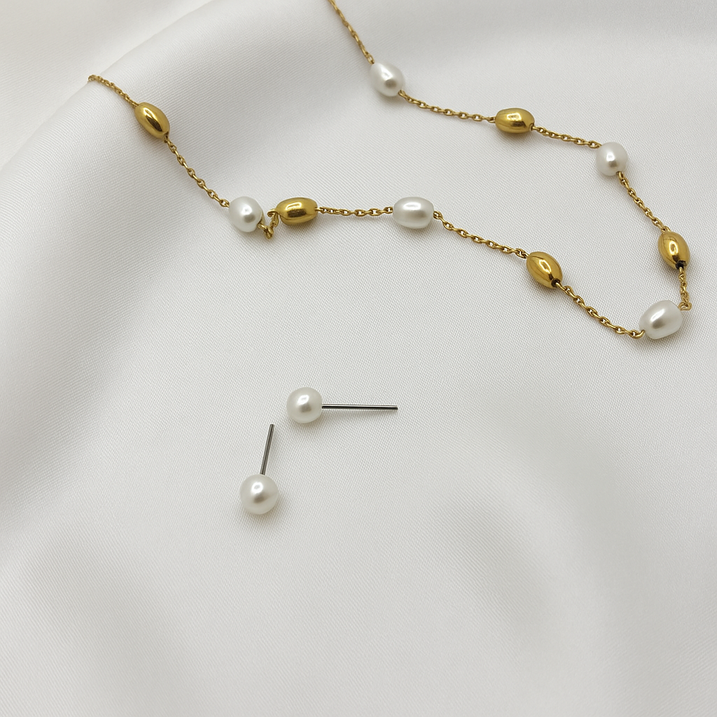 A graceful combination of a delicate gold chain adorned with alternating gold and lustrous white pearl-like beads, paired with timeless pearl stud earrings. This set exudes understated elegance, perfect for everyday wear or special occasions. The classic pearls bring a touch of sophistication, while the gold adds a warm glow. Comes from the AMOR collection, crafted for lasting charm.